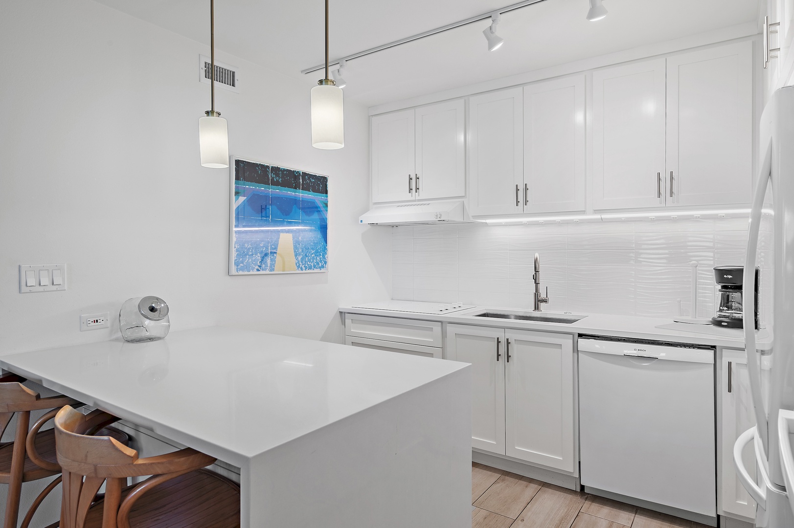 When you turn the corner from the hall, you cannot miss the gorgeous kitchen that has been completely redesigned with tons of cabinet space, full size refrigerator with ice maker, stunning quartz countertops, glass tile backsplash, and peninsula seating for two.