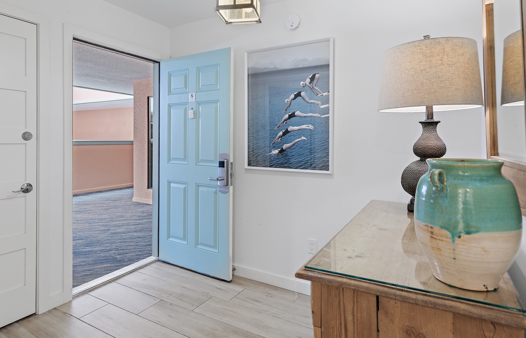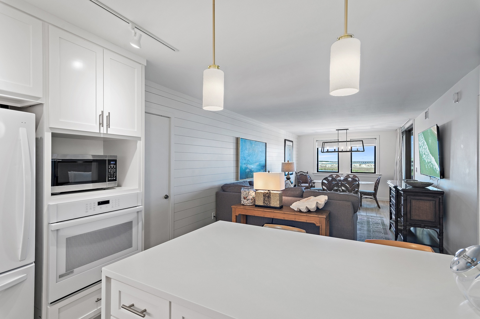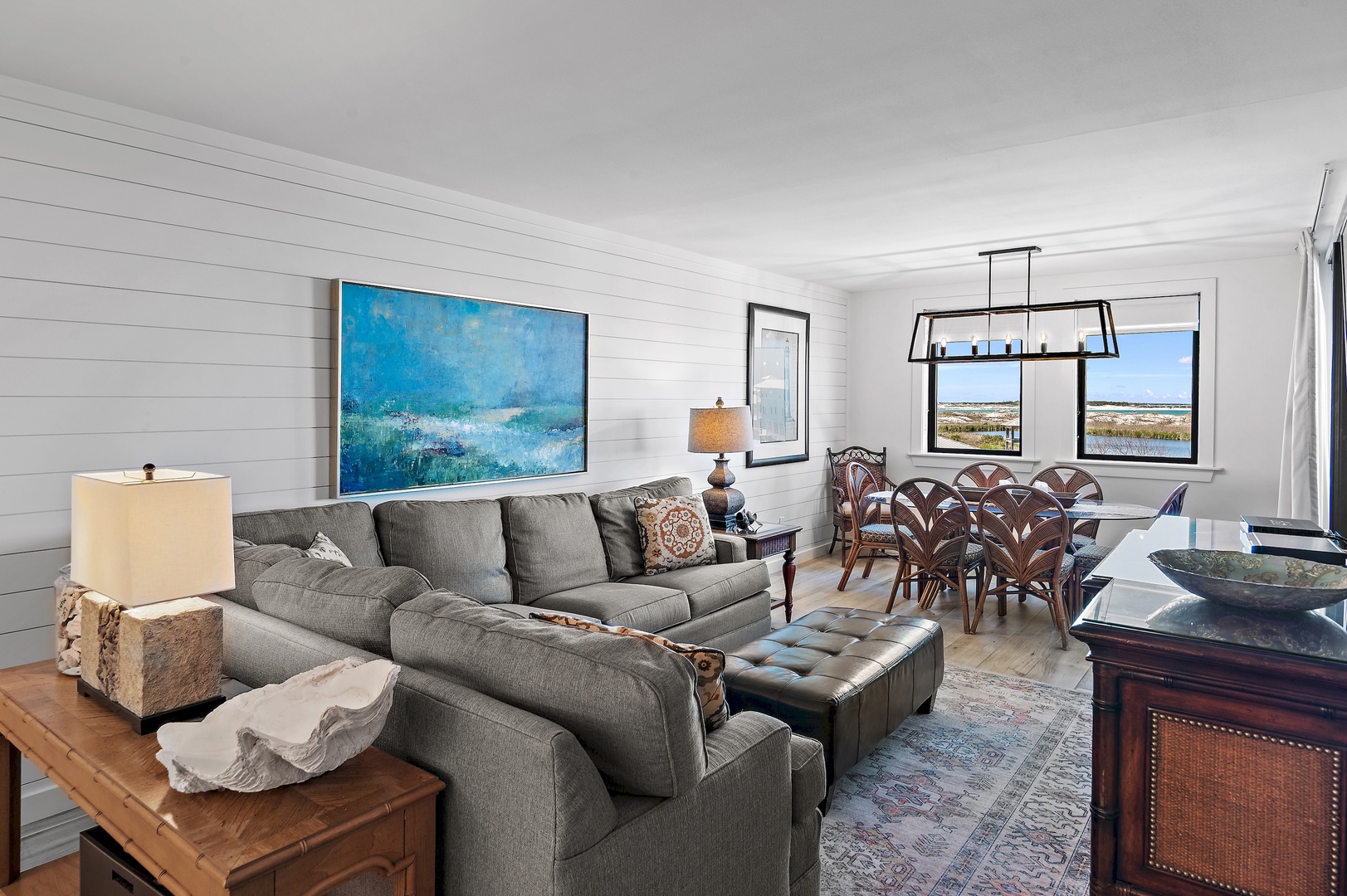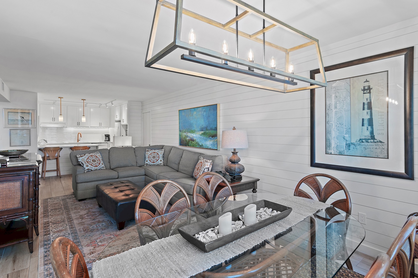 Unit 214B was completely renovated in 2018. You’ll love its fresh coastal décor throughout. From the minute you walk in, with its shiplap accent wall in the living room, beautiful shades of aqua blue, creams, and crisp white with natural wood accents sprinkled throughout, this condo feels like a beach retreat!