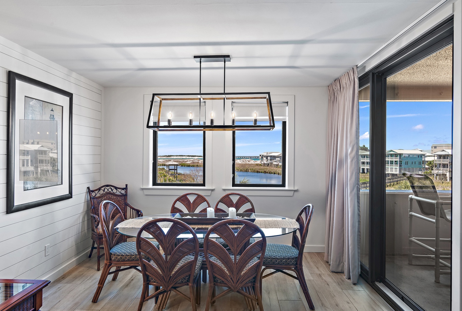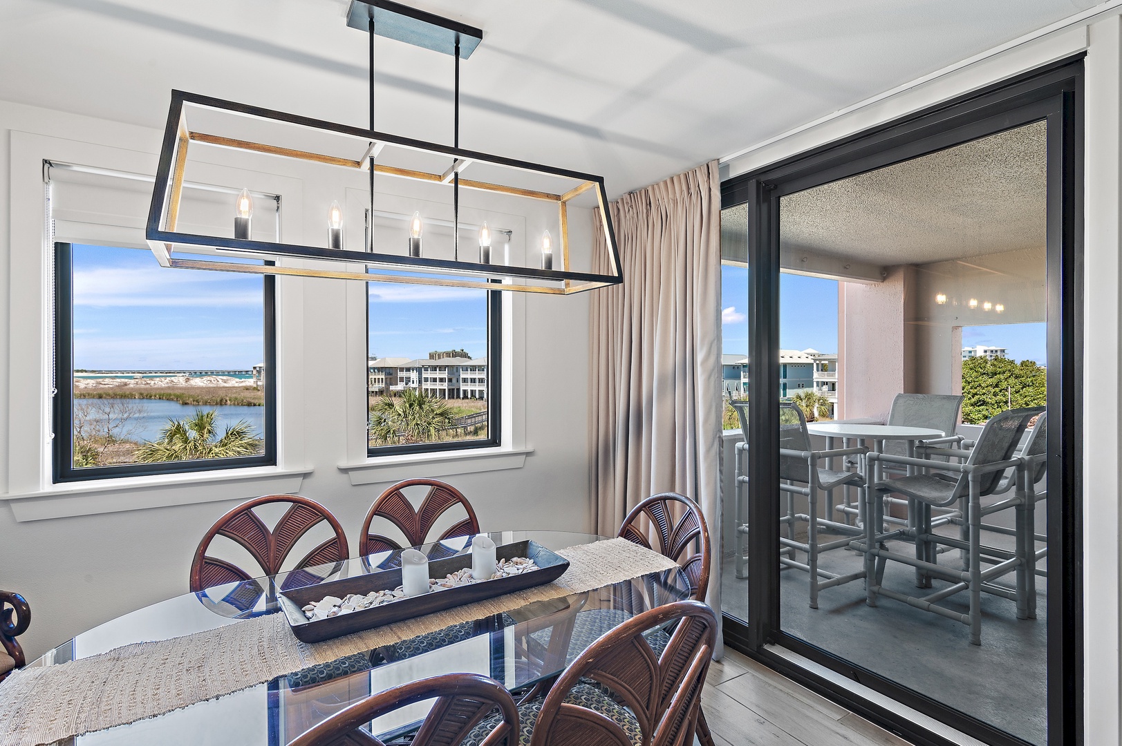 The dining area has a large glass-top oval table with seating for six. You’ll get a perfect view of the sunset while you enjoy fabulous Destin seafood - hopefully grilled at our own pavilion.
