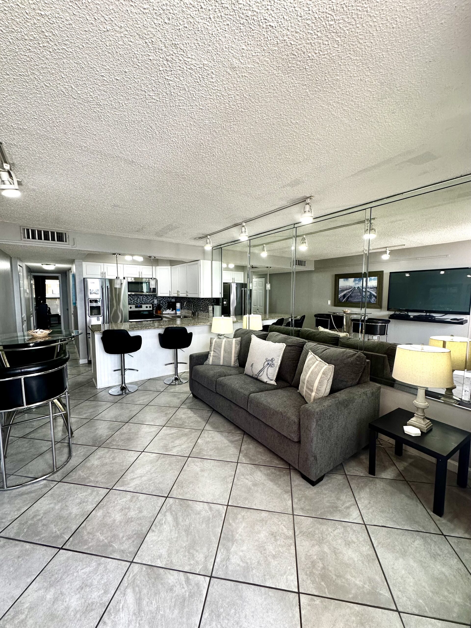 King Size Bed in Bedroom, Sleeper Sofa in Living Area. The Glass Doors in the Living Area go out to the Open Balcony and the Mirrored Wall expands the space. Sit on the Bar Height Furniture on the Open Balcony where you can relax all day and enjoy both Gulf and Jetty Views. Master Bedroom has a 50″ TV and DVD player. The Living Room is equipped with a 60 inch TV, DVD player and Bluetooth Stand. Granite Counter Tops in the Bathroom and Kitchen.