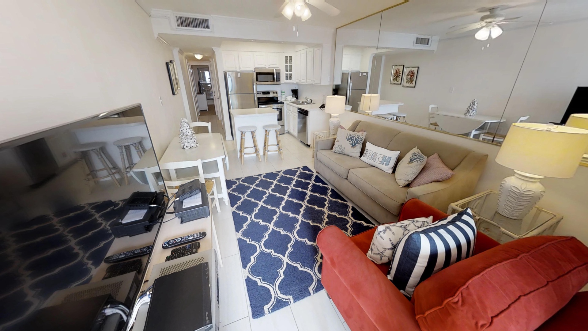 1st Floor, One Bedroom/ One Bathroom, King Size Bed in Bedroom, Sleeper Sofa in Living Area. Diagonally Laid Tiles lead you into the Kitchen and Living Area that has Glass Doors going out onto the Open Balcony. The Bar Height Furniture provides the perfect place to enjoy the Fantastic View of the Beach. The Recessed Lighting over the bar is a nice accent and the Ceiling Fan in the Living Area and Bedroom help keep you cool. The Carpet in the Bedroom feels soft under your feet. Watch the TV in the Bedroom and the 46 inch flat screen TV and DVD Player in the Living Area.