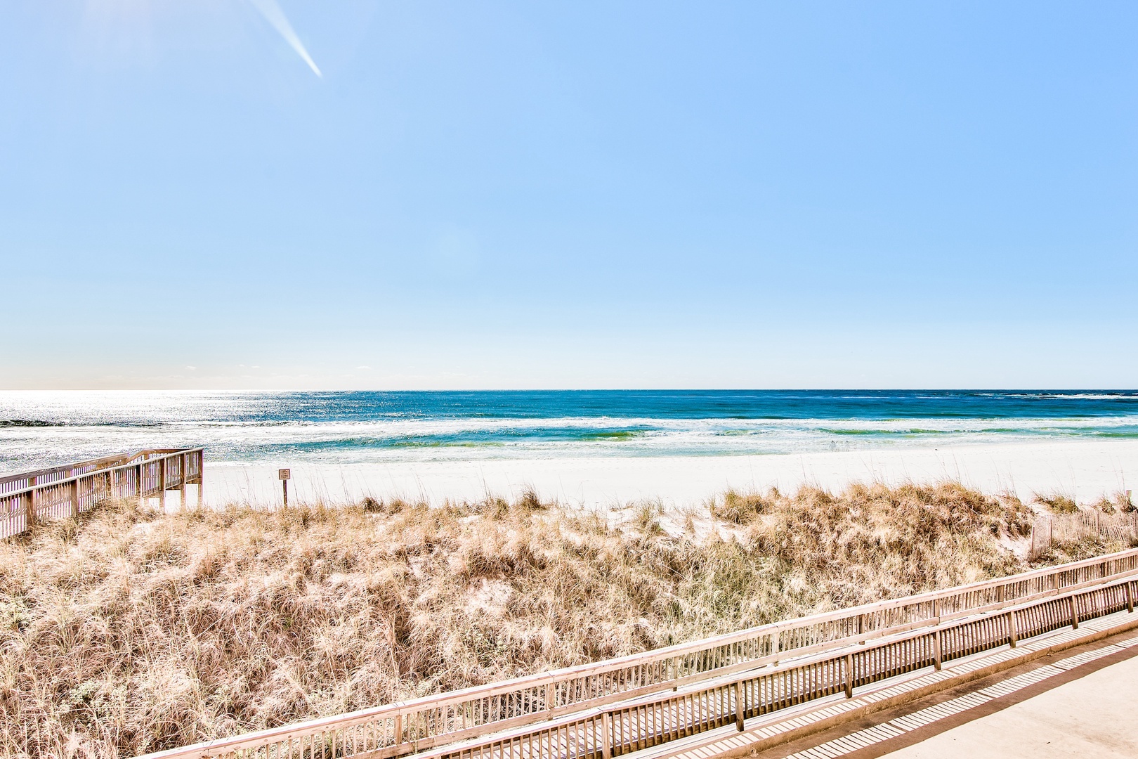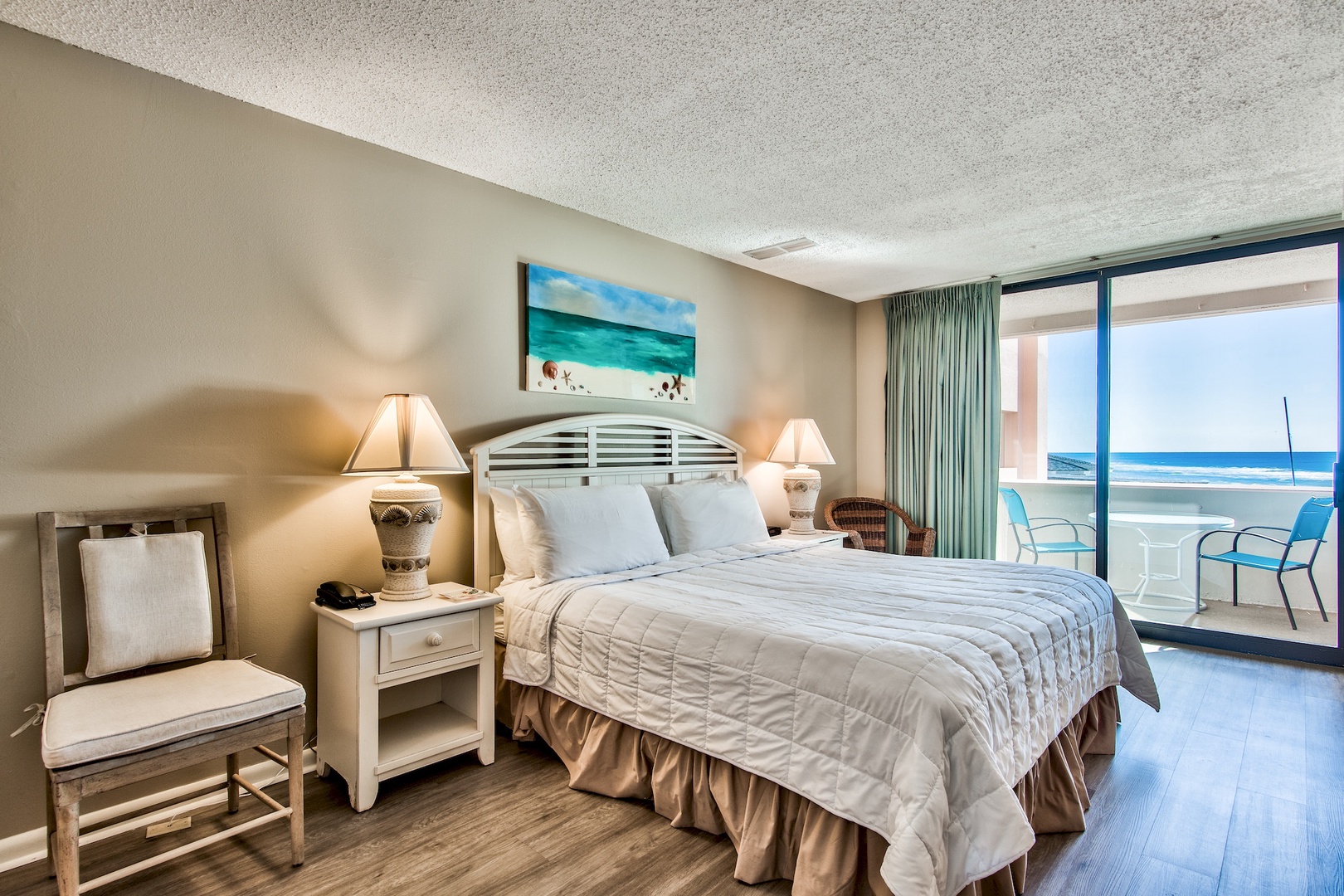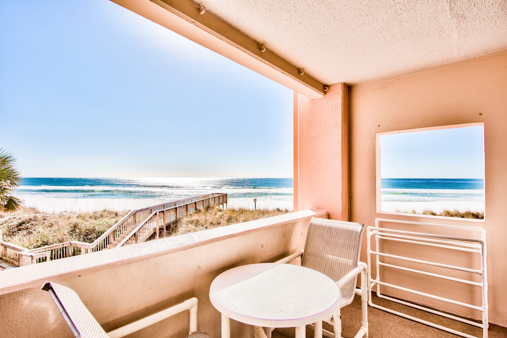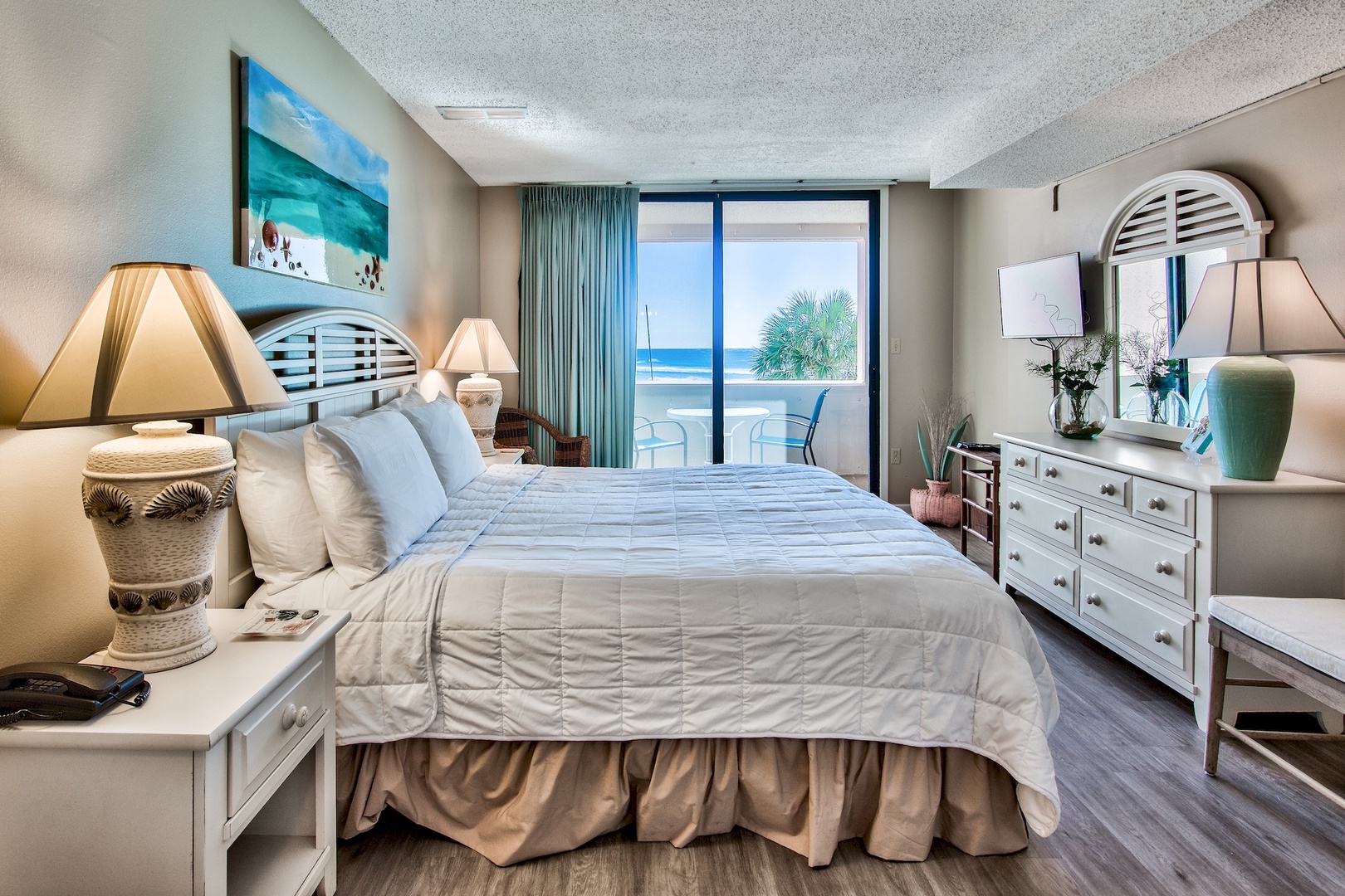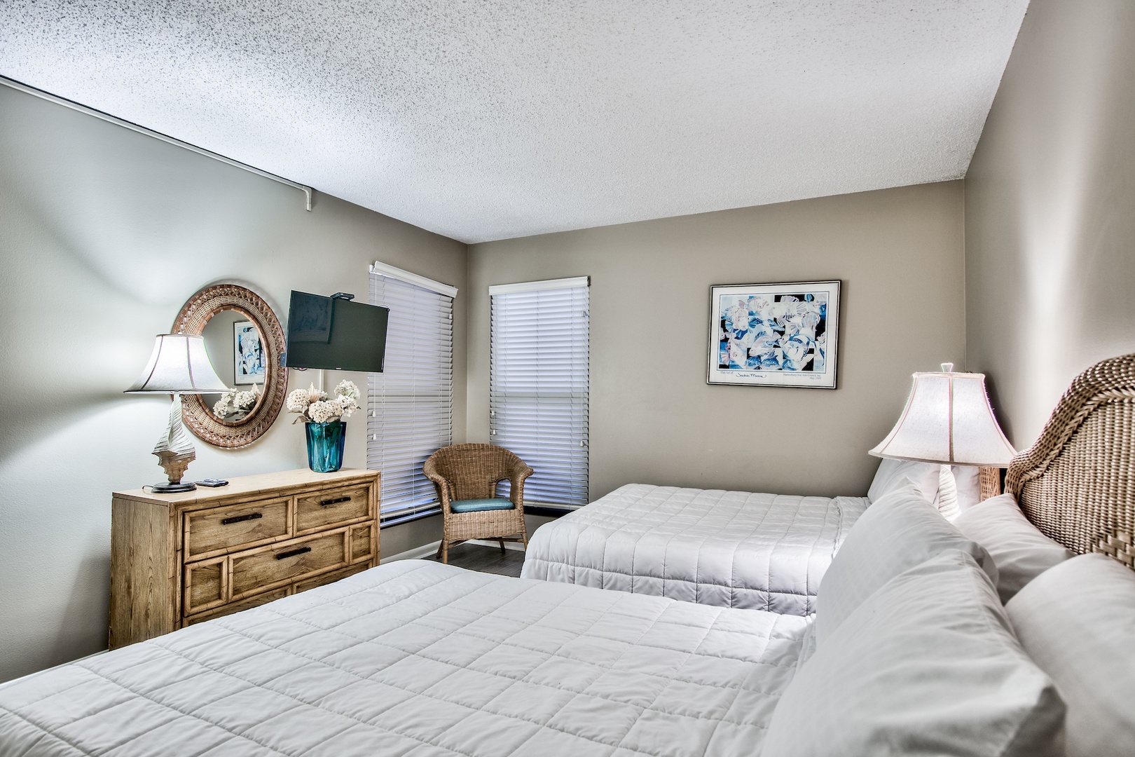 1st Floor, Three Bedroom/ Two Bathroom. King Size Bed in Master Bedroom, Queen Size Bed in 2nd Bedroom, Two Double Beds in 3rd Bedroom. No Sofa Sleeper in Living Room. Enjoy the Breathtaking Views and Sounds of the Gulf of Mexico and the Pool View while sitting on the Two Open Balconies.