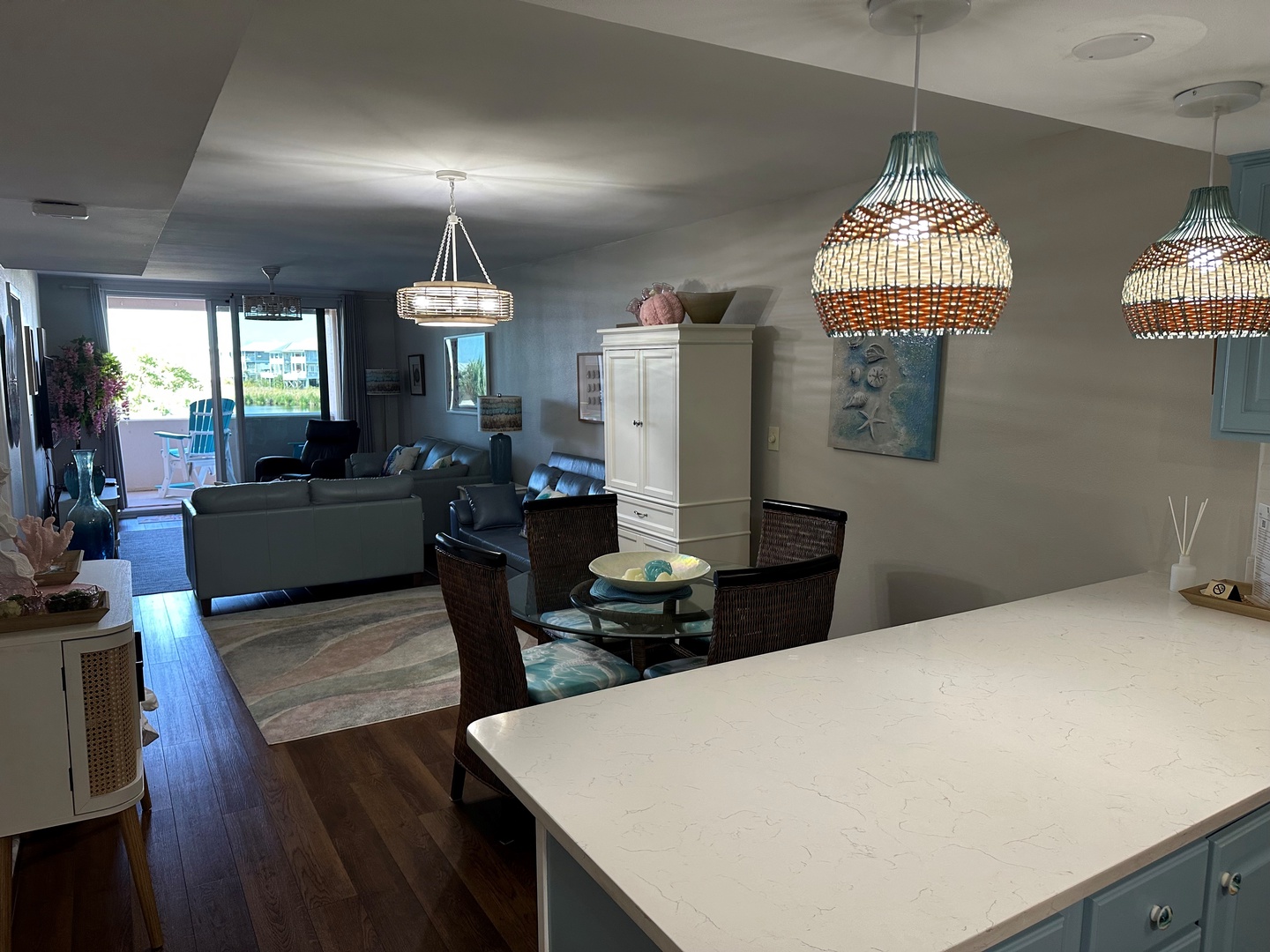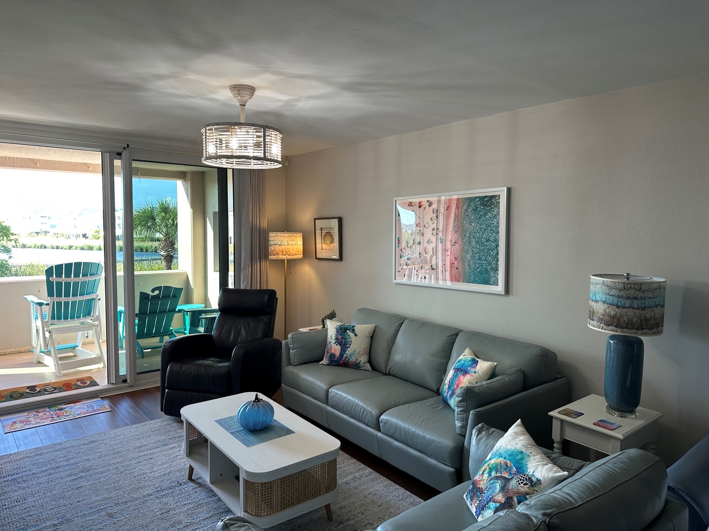 This is a One Bedroom Large Condo with an open concept floor plan which is larger than the standard 1 Bedroom Condos at Jetty East. This is a great unit for entertaining, approx. 900 sq. feet. Recently renovated(March 2019) • 258 square feet larger than regular 1 bedroom units, with expansive living and dining area. New living room, dining and bedroom furniture. Extra large balcony, over twice as large as 1 and 2 bedroom unit, with views of the East Pass, Lake Christina and a slice of the Gulf.