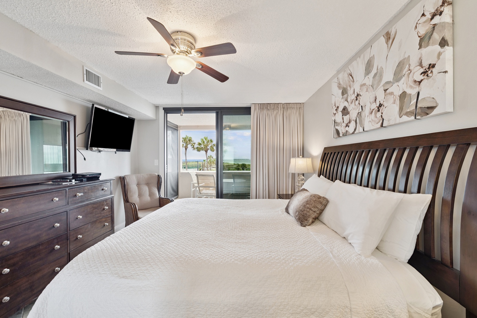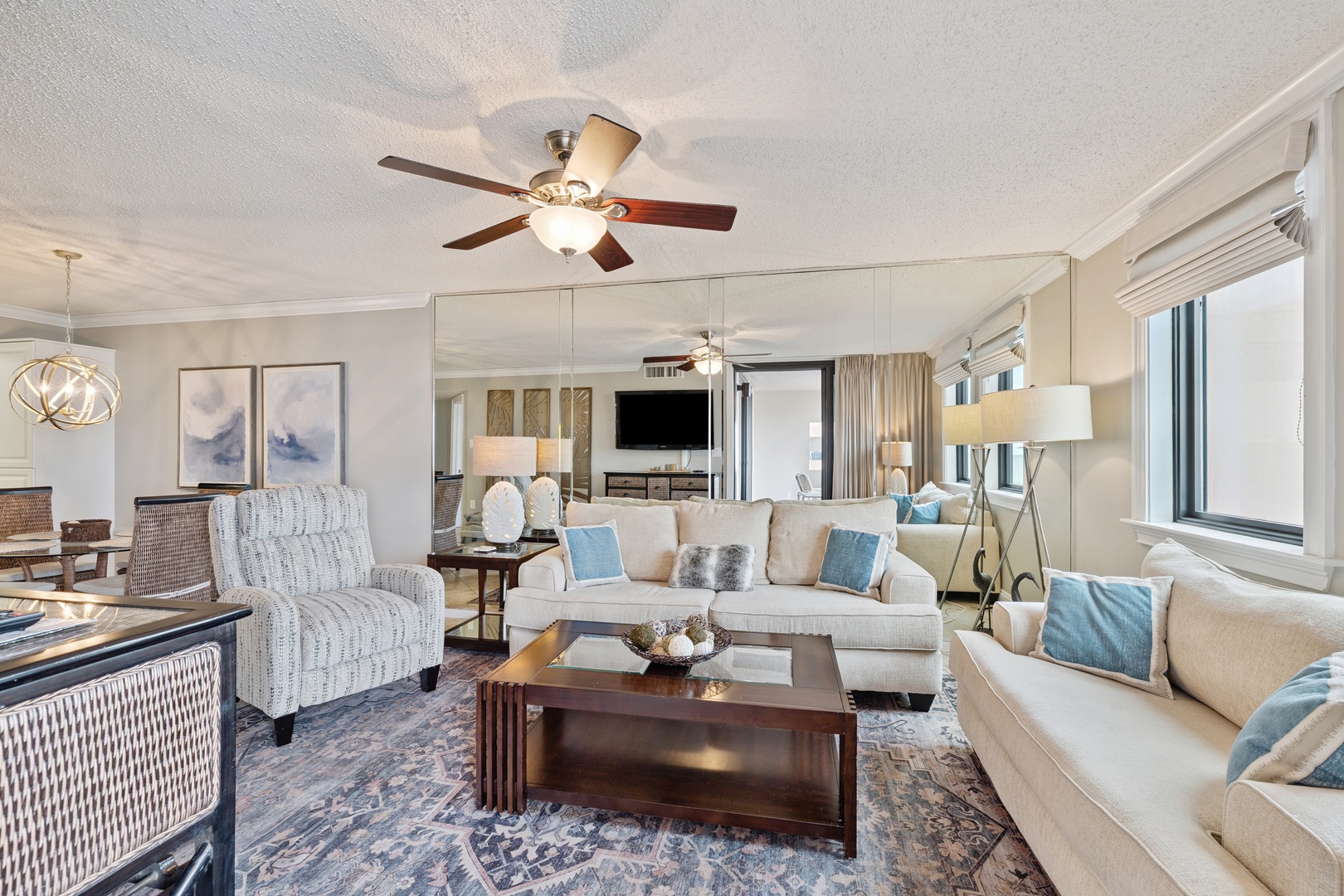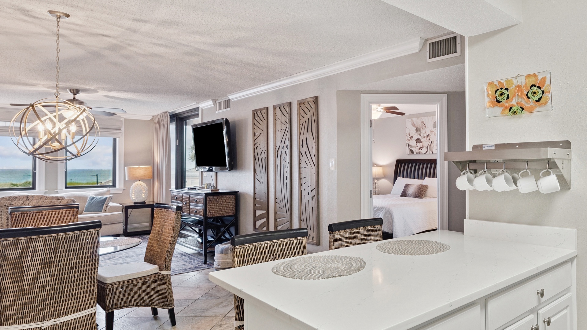 Enjoy the comfort of this spacious living room where there is ample seating for everyone to kick back and watch television on the 52" wall-mounted TV, play games, or simply read a book while listening to the surf. The large sliding glass doors in both the living room and the primary bedroom lead to the open balcony where you’ll spend each day of your visit enjoying the spectacular views of not only the Gulf but the heated beach-side pool, the pavilion, and the tennis courts, all of which are private to the Jetty East Community.