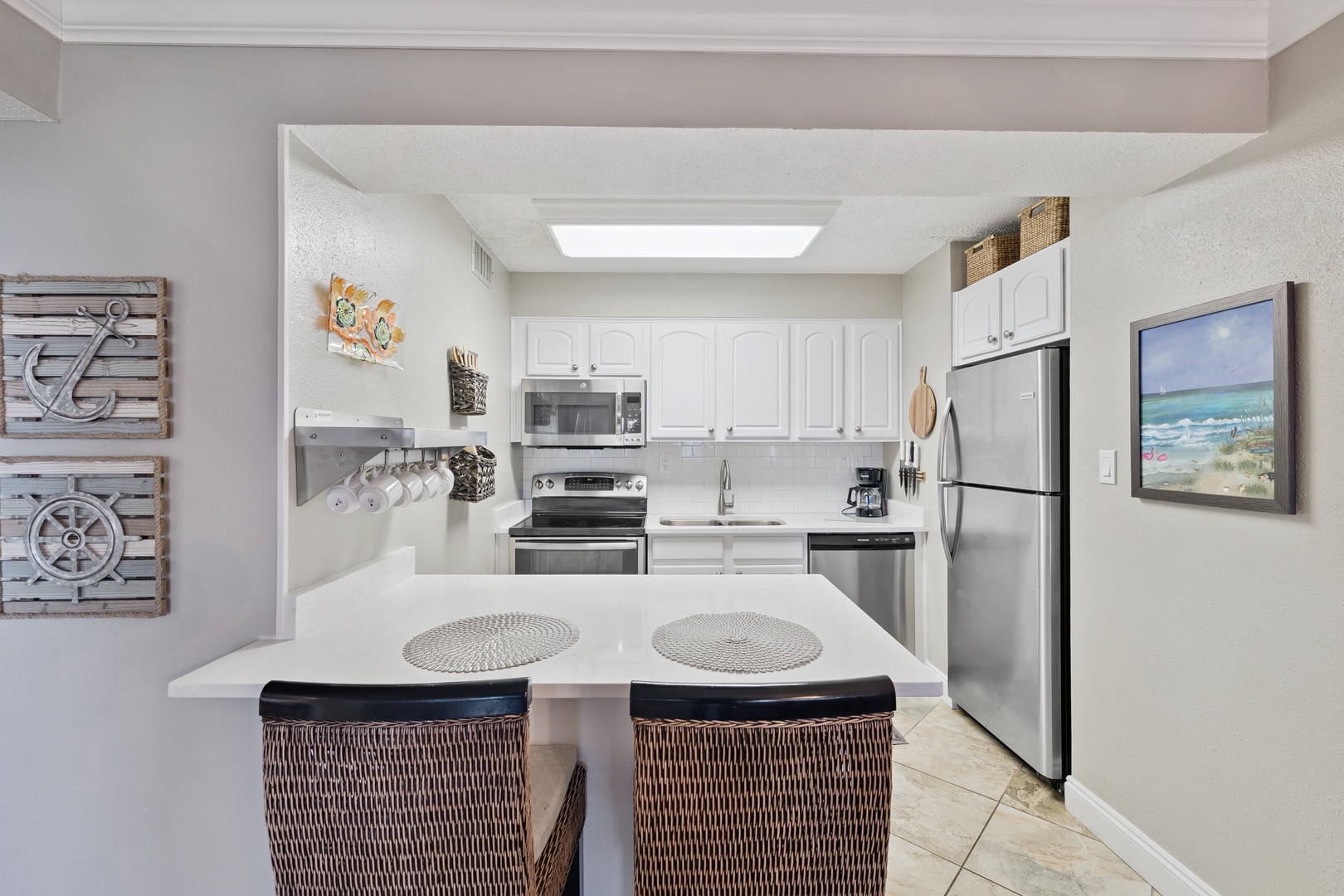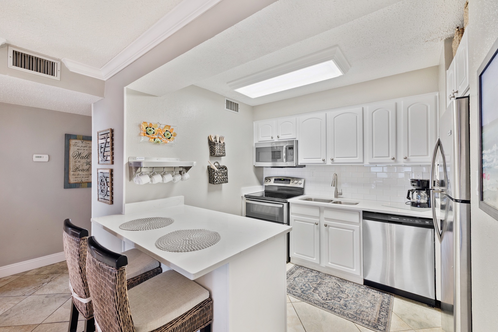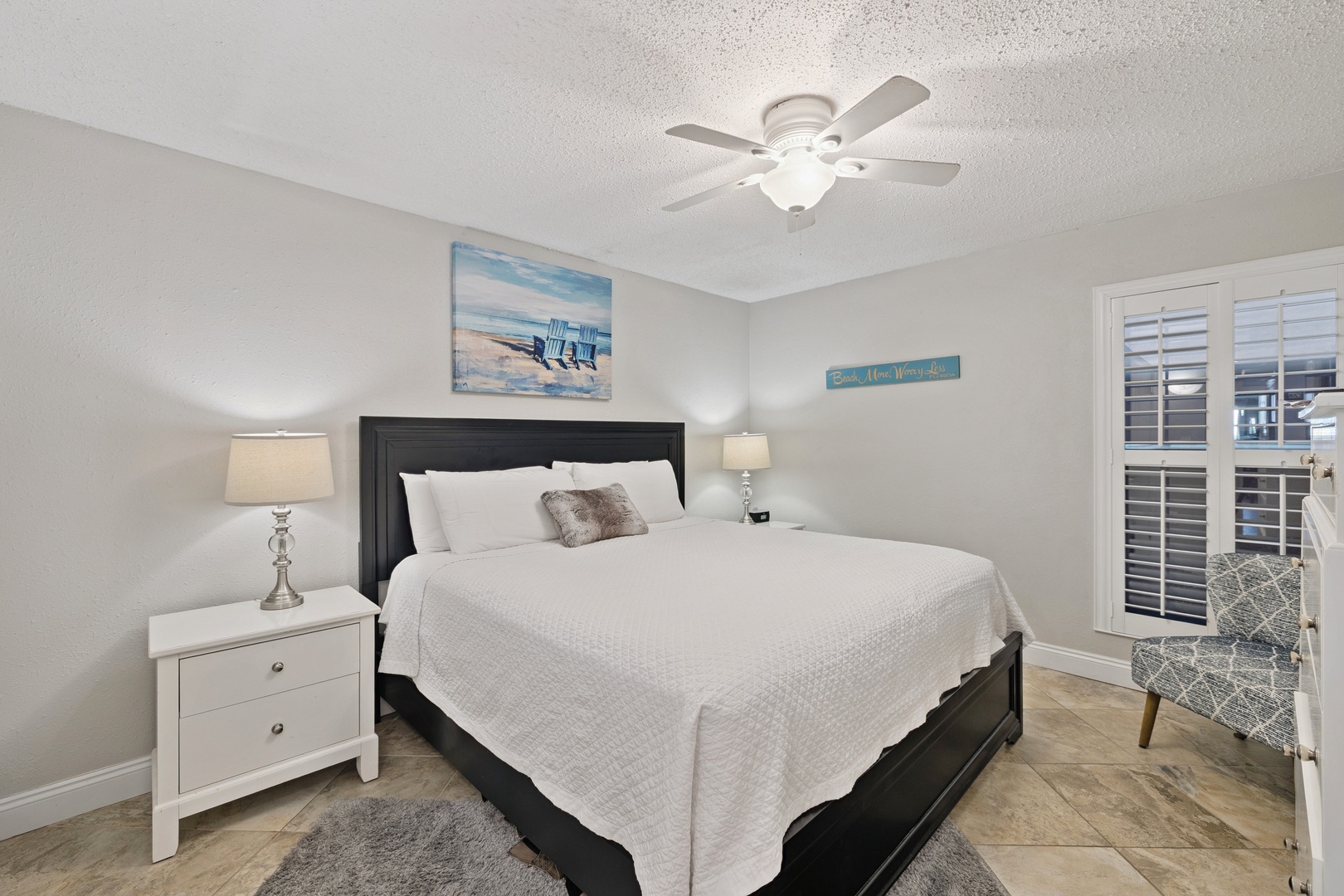 Enjoy the comfort of this spacious living room where there is ample seating for everyone to kick back and watch television on the 52" wall-mounted TV, play games, or simply read a book while listening to the surf. The large sliding glass doors in both the living room and the primary bedroom lead to the open balcony where you’ll spend each day of your visit enjoying the spectacular views of not only the Gulf but the heated beach-side pool, the pavilion, and the tennis courts, all of which are private to the Jetty East Community.
