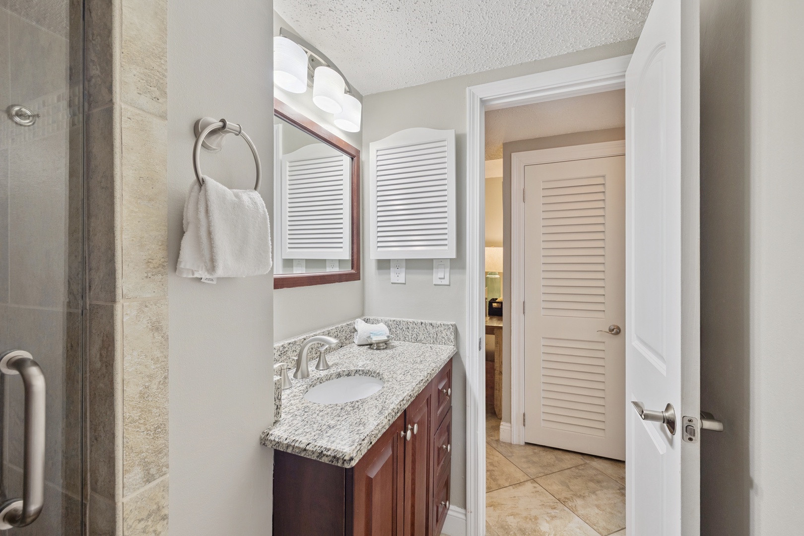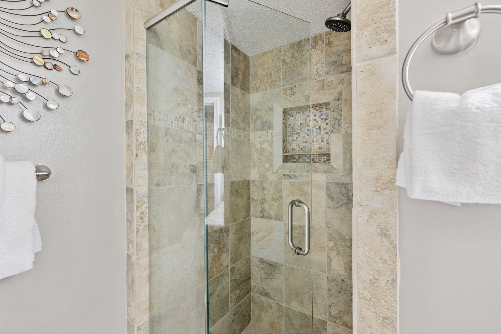 Tiled walk-in shower in the guest bath