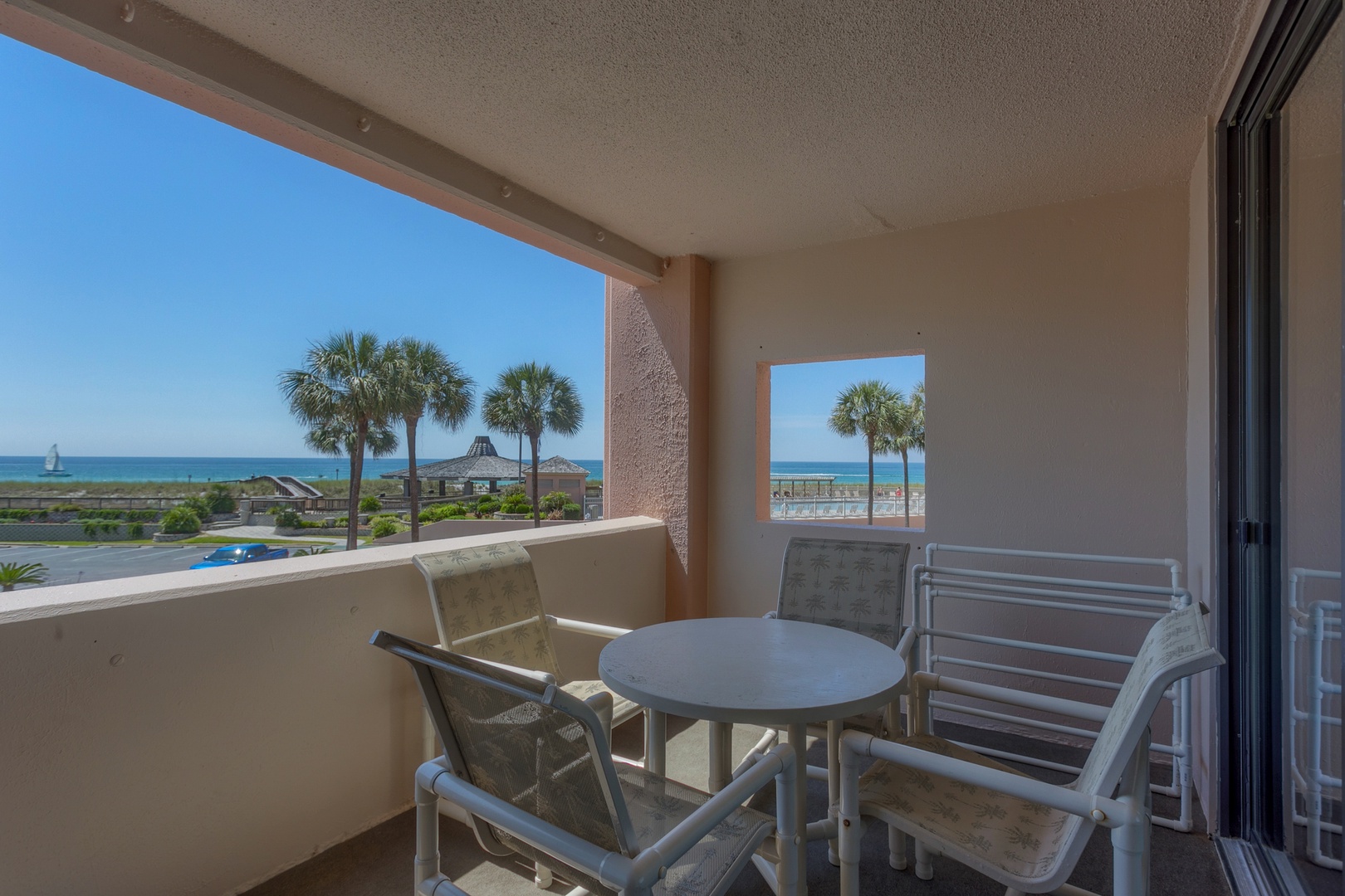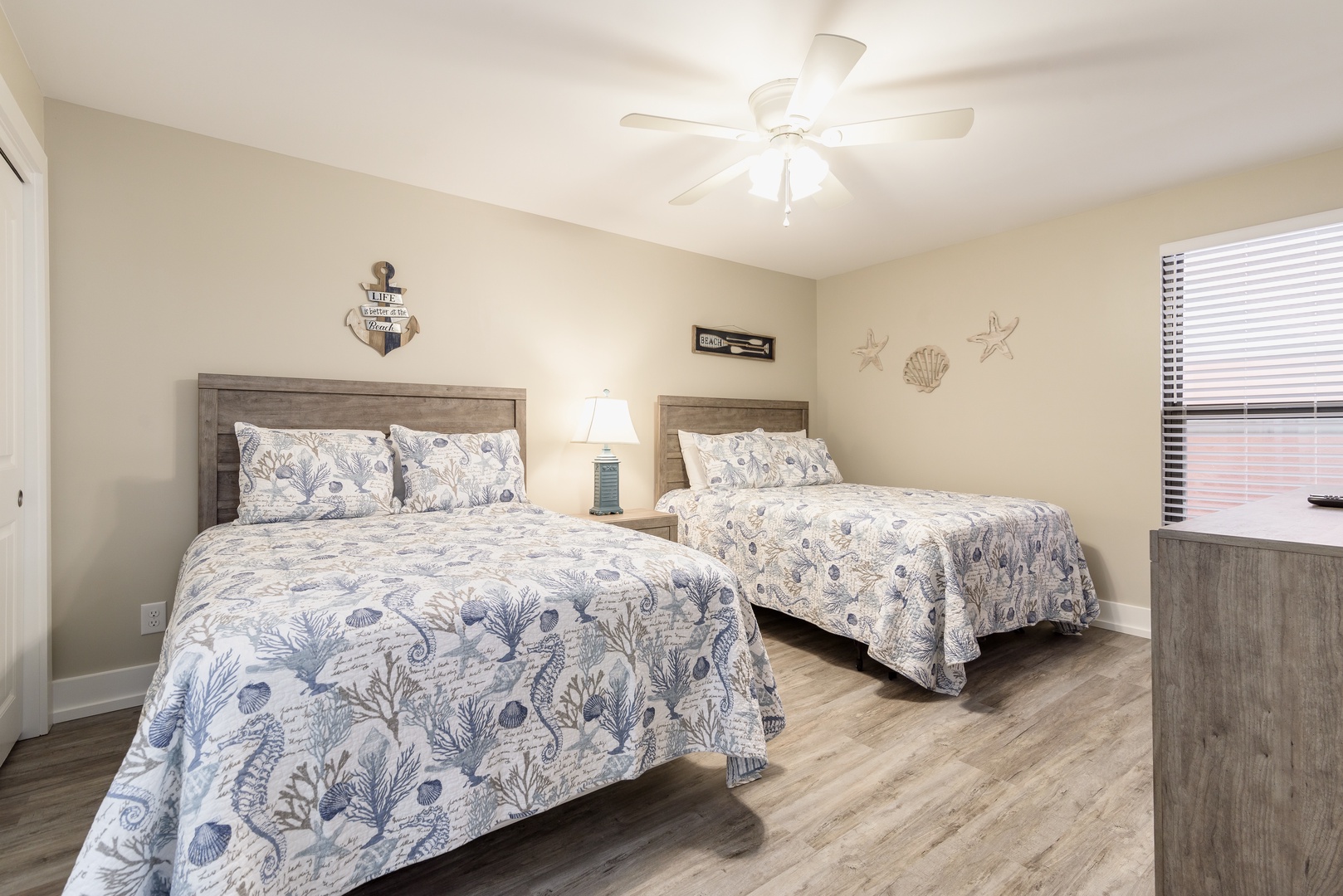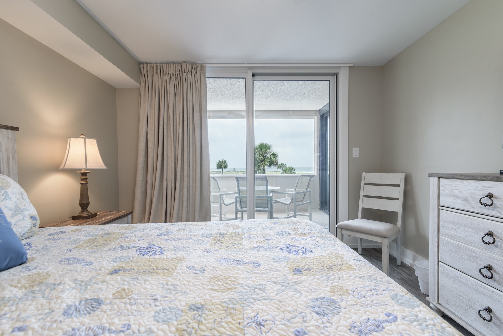 King Size Bed in Master, Queen Size Bed in 2nd Bedroom, 2 Double Beds in 3rd Bedroom and 1 Double Bed in the 4th Bedroom, Sleeper Sofa in Living Area. Enjoy the view of the Gulf, the Tennis Courts, Shuffleboard Courts, Pool and Hot Tub, and Pavilion from the Two Open Balconies facing the Gulf. The Ceiling Fans in all the bedrooms will keep you cool. It is equipped with five flat screen TVs and a DVD Player.