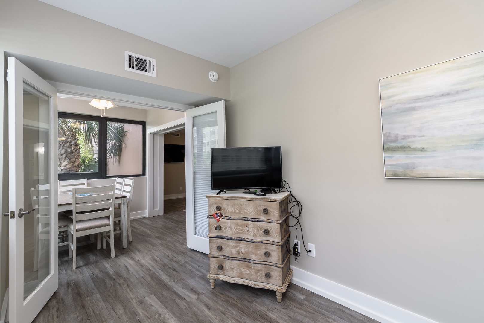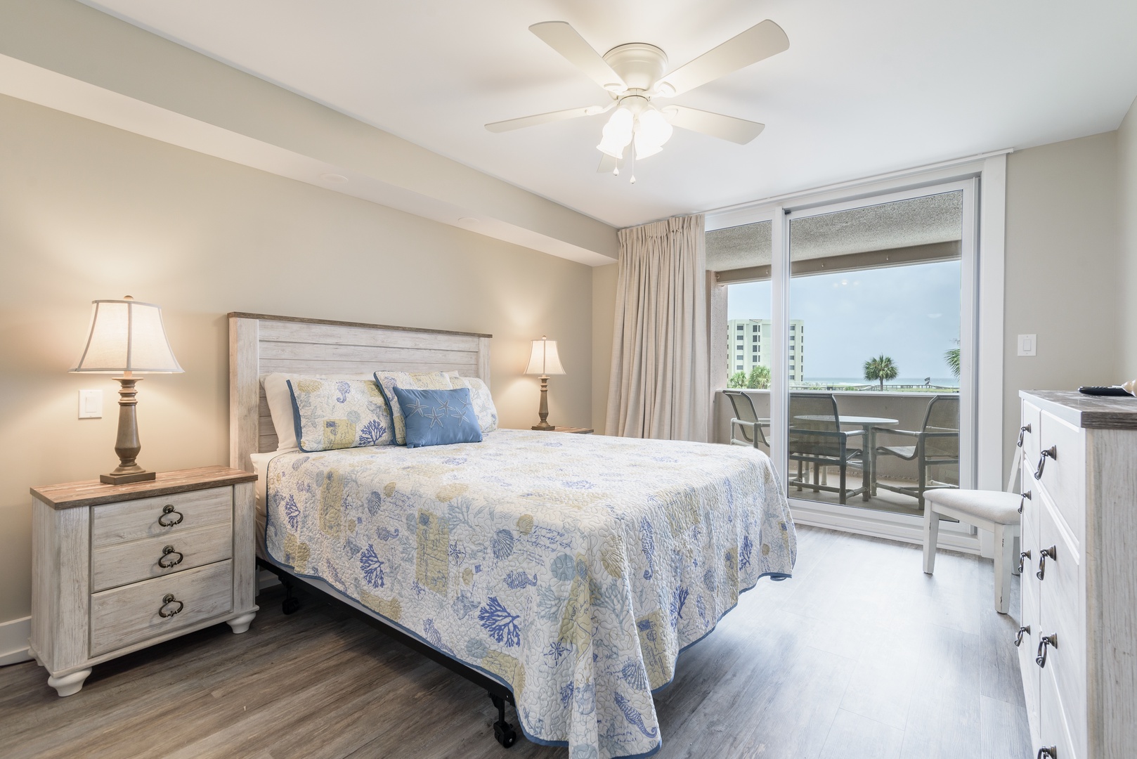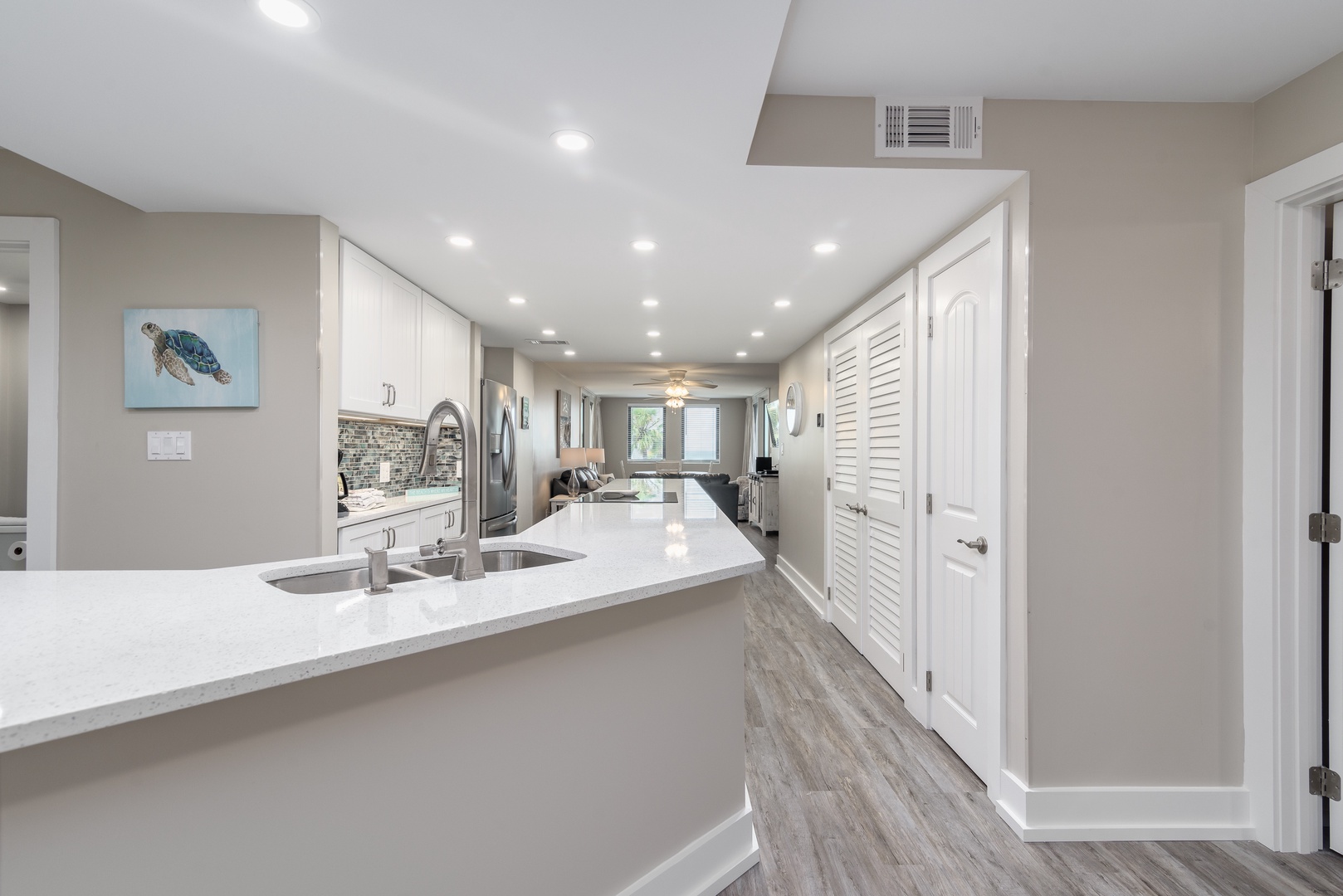 King Size Bed in Master, Queen Size Bed in 2nd Bedroom, 2 Double Beds in 3rd Bedroom and 1 Double Bed in the 4th Bedroom, Sleeper Sofa in Living Area. Enjoy the view of the Gulf, the Tennis Courts, Shuffleboard Courts, Pool and Hot Tub, and Pavilion from the Two Open Balconies facing the Gulf. The Ceiling Fans in all the bedrooms will keep you cool. It is equipped with five flat screen TVs and a DVD Player.