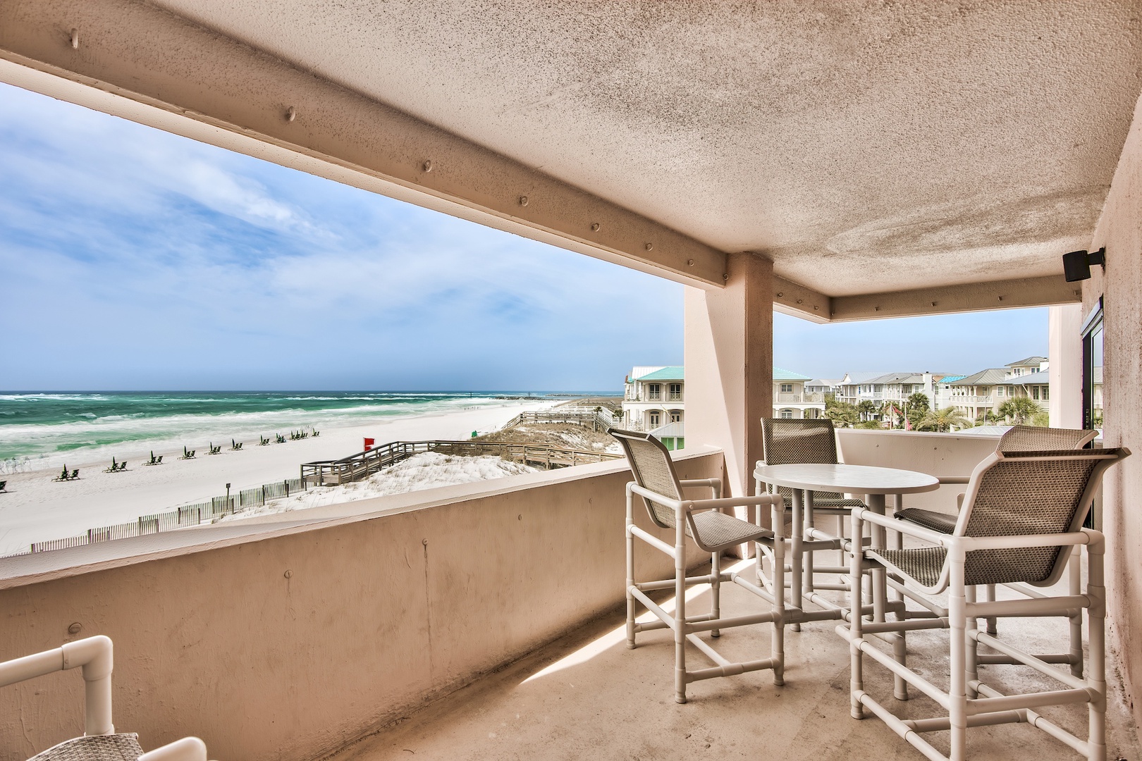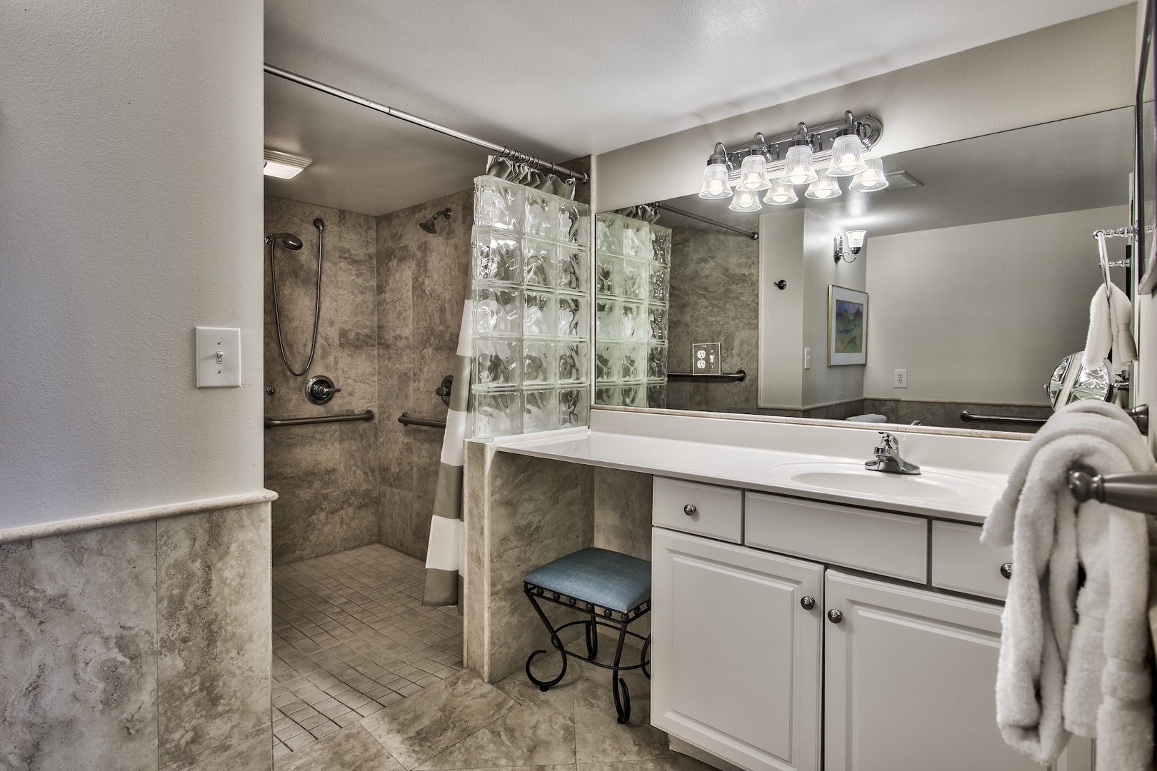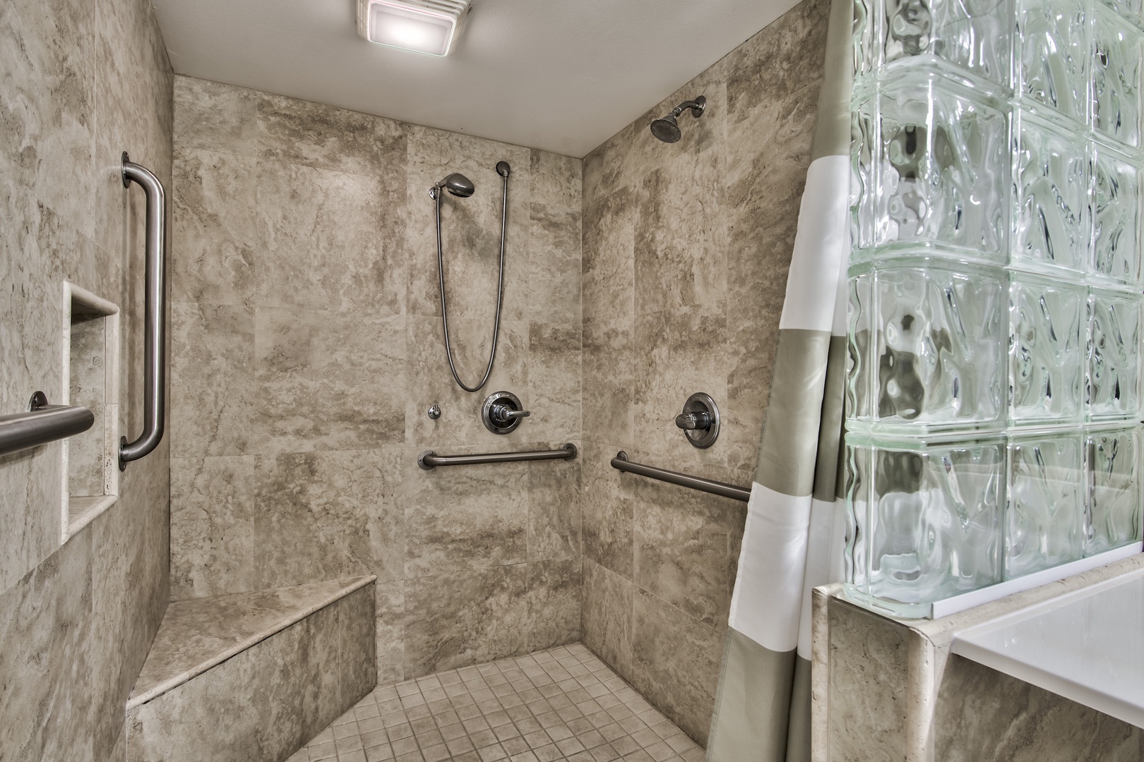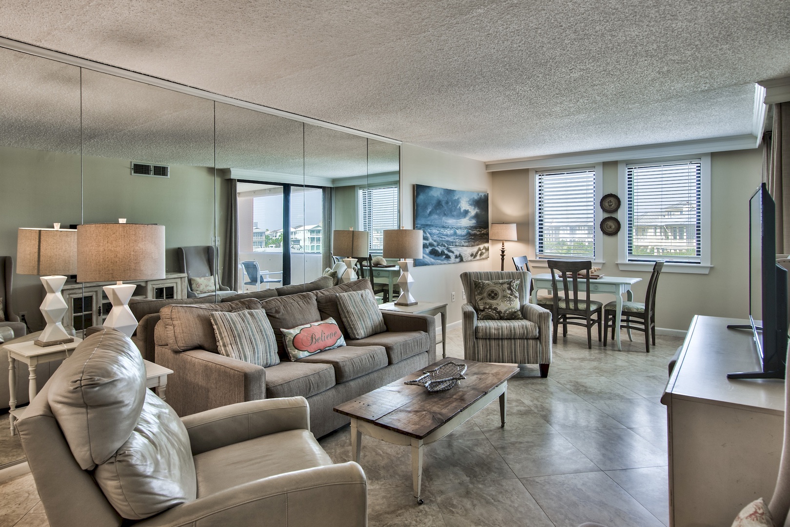 2nd Floor, Three Bedroom, Three Bathroom, King Size Bed in Master, King Size Bed in Bedroom Two, Two Double Beds in Bedroom Three, Sleeper Sofa in Living Area. This is a Fabulous Corner Unit with Beach, Gulf, and East Pass Views. It has two Open Balconies and one Enclosed Balcony. It has Two Living Areas and Two Dining Areas. The Main Living Area has a Large LCD TV and DVD Player and a lift recliner. It is also equipped with four additional TVs. **Master bath is handicapped accessible. You can roll wheelchair completely into shower. It has a corner seat, handheld shower-head; 4 handrails inside shower**