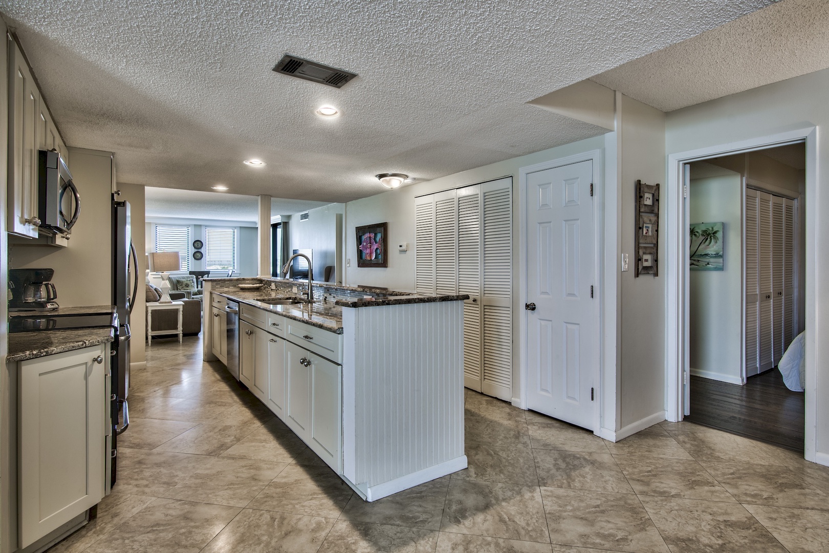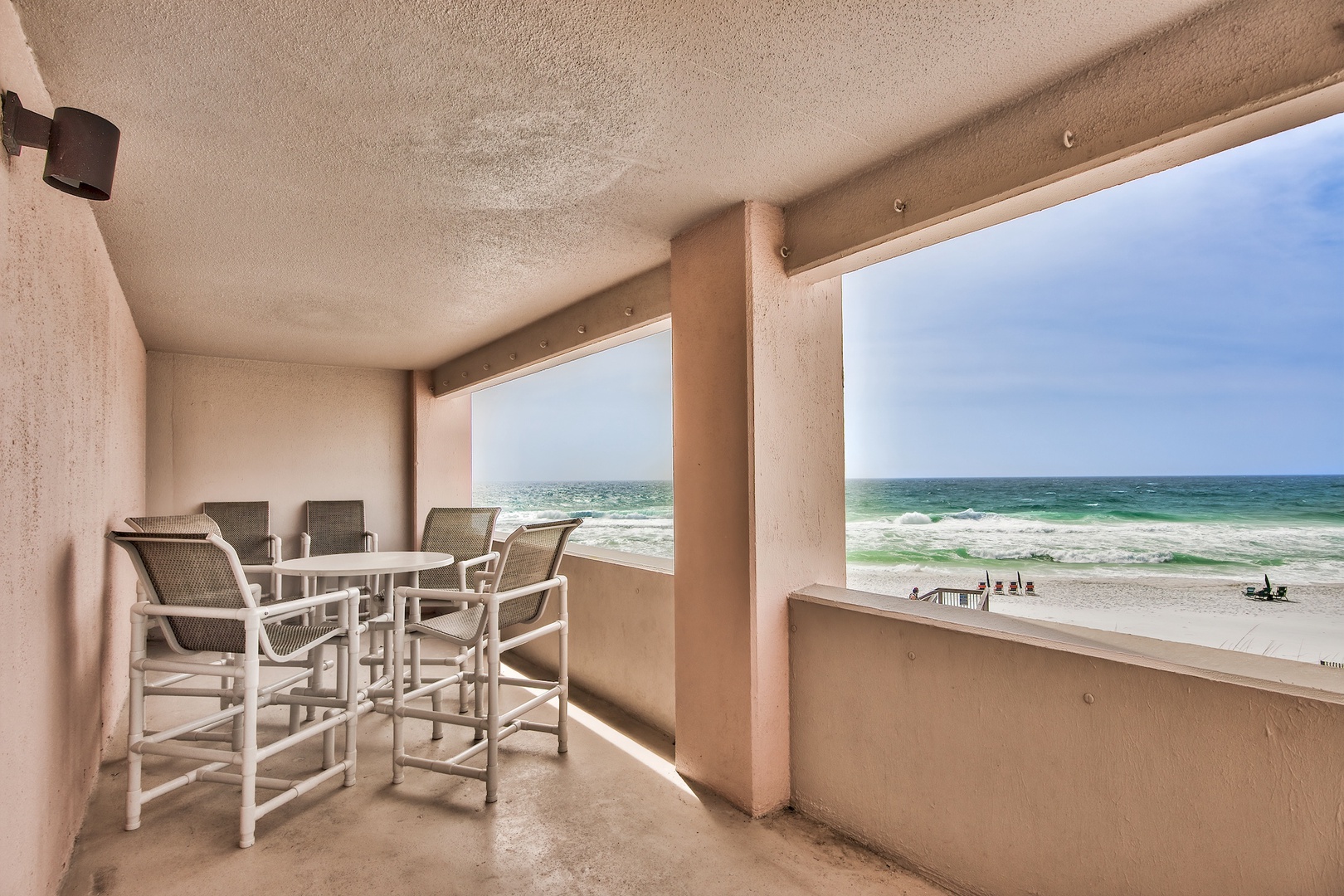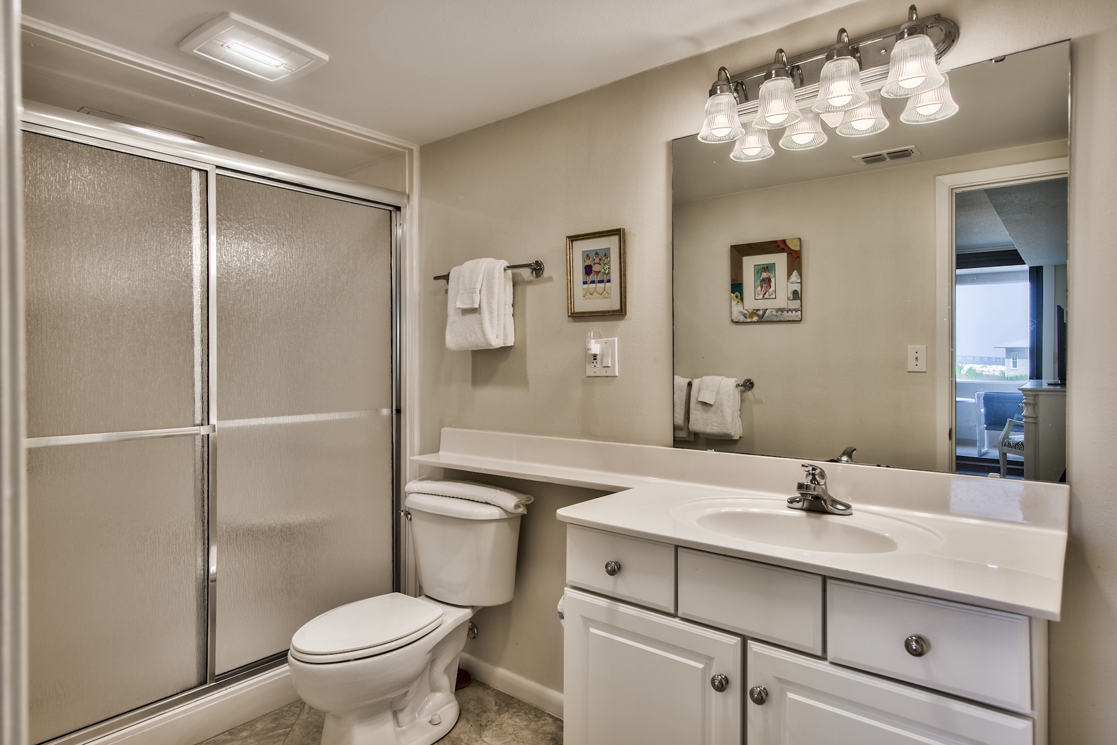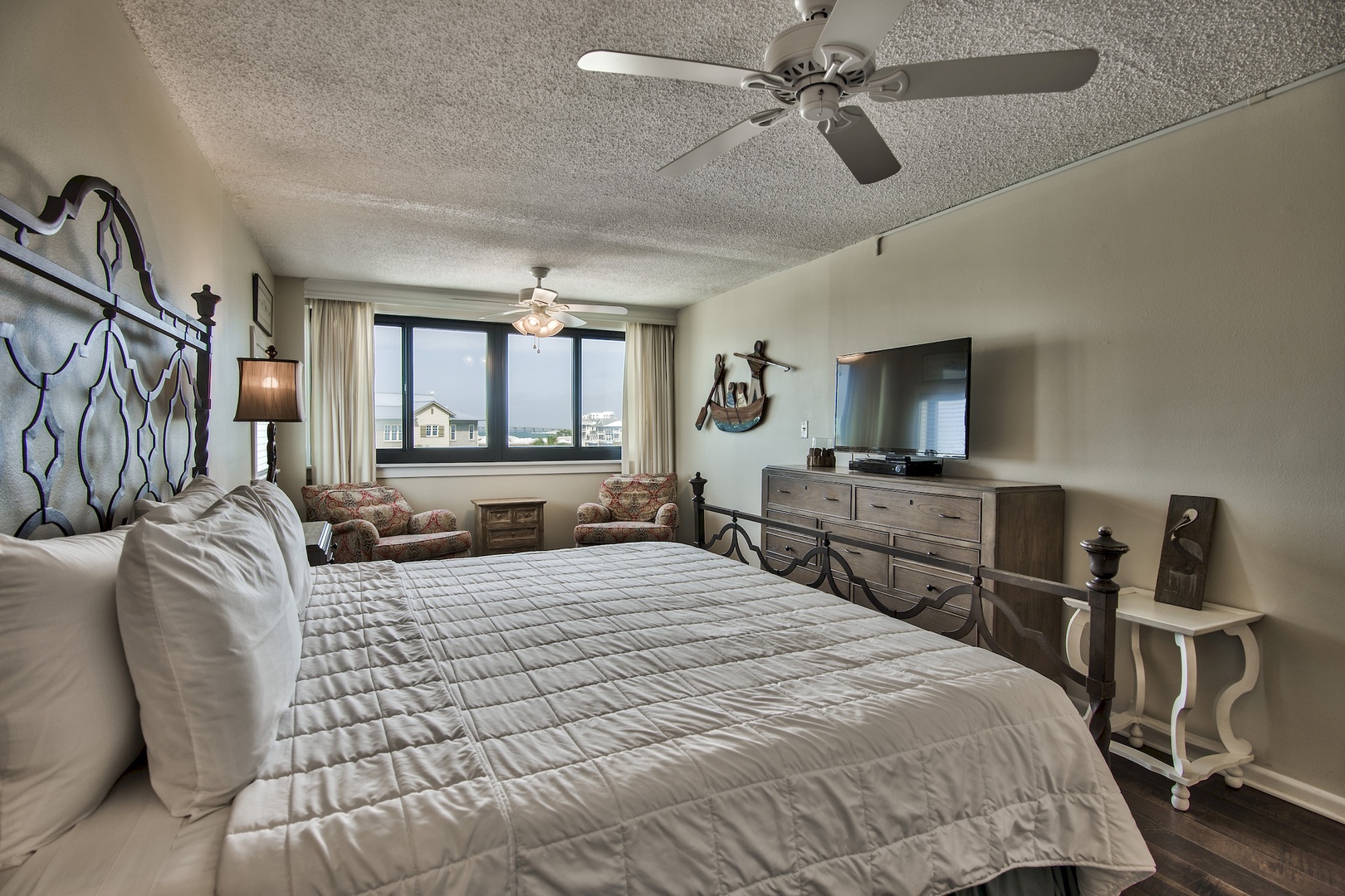 2nd Floor, Three Bedroom, Three Bathroom, King Size Bed in Master, King Size Bed in Bedroom Two, Two Double Beds in Bedroom Three, Sleeper Sofa in Living Area. This is a Fabulous Corner Unit with Beach, Gulf, and East Pass Views. It has two Open Balconies and one Enclosed Balcony. It has Two Living Areas and Two Dining Areas. The Main Living Area has a Large LCD TV and DVD Player and a lift recliner. It is also equipped with four additional TVs. **Master bath is handicapped accessible. You can roll wheelchair completely into shower. It has a corner seat, handheld shower-head; 4 handrails inside shower**