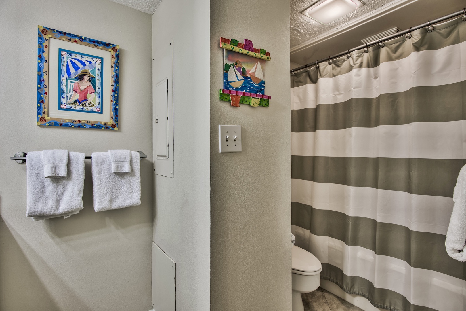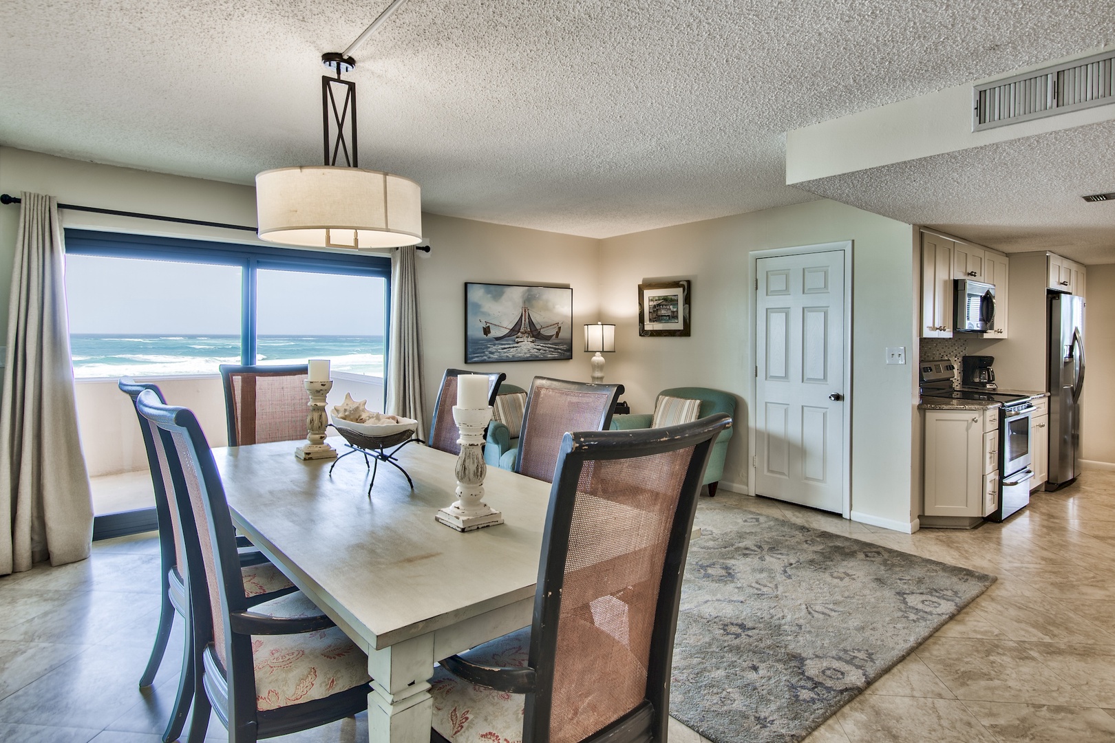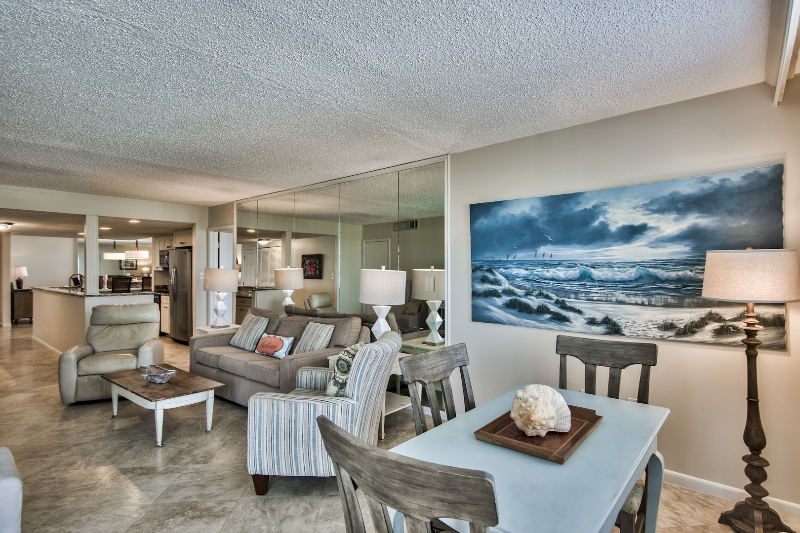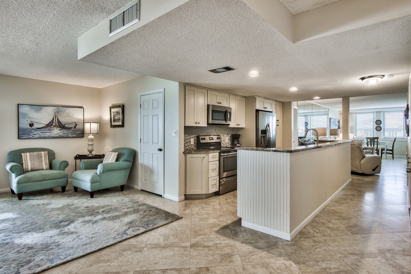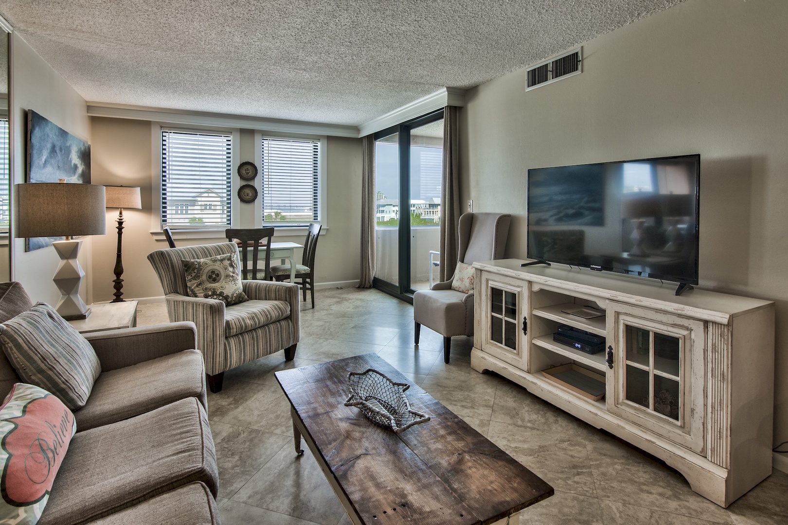 2nd Floor, Three Bedroom, Three Bathroom, King Size Bed in Master, King Size Bed in Bedroom Two, Two Double Beds in Bedroom Three, Sleeper Sofa in Living Area. This is a Fabulous Corner Unit with Beach, Gulf, and East Pass Views. It has two Open Balconies and one Enclosed Balcony. It has Two Living Areas and Two Dining Areas. The Main Living Area has a Large LCD TV and DVD Player and a lift recliner. It is also equipped with four additional TVs. **Master bath is handicapped accessible. You can roll wheelchair completely into shower. It has a corner seat, handheld shower-head; 4 handrails inside shower**