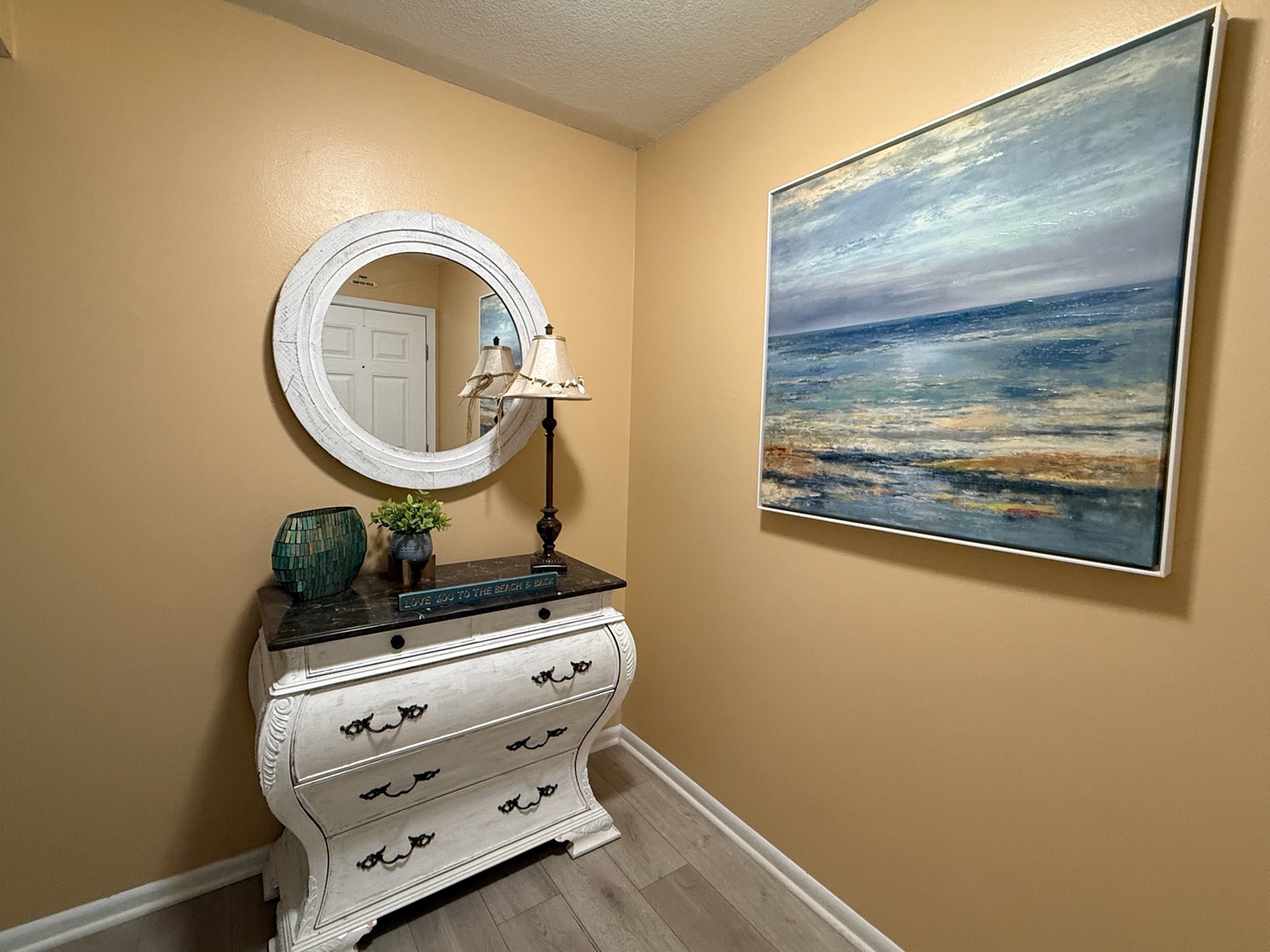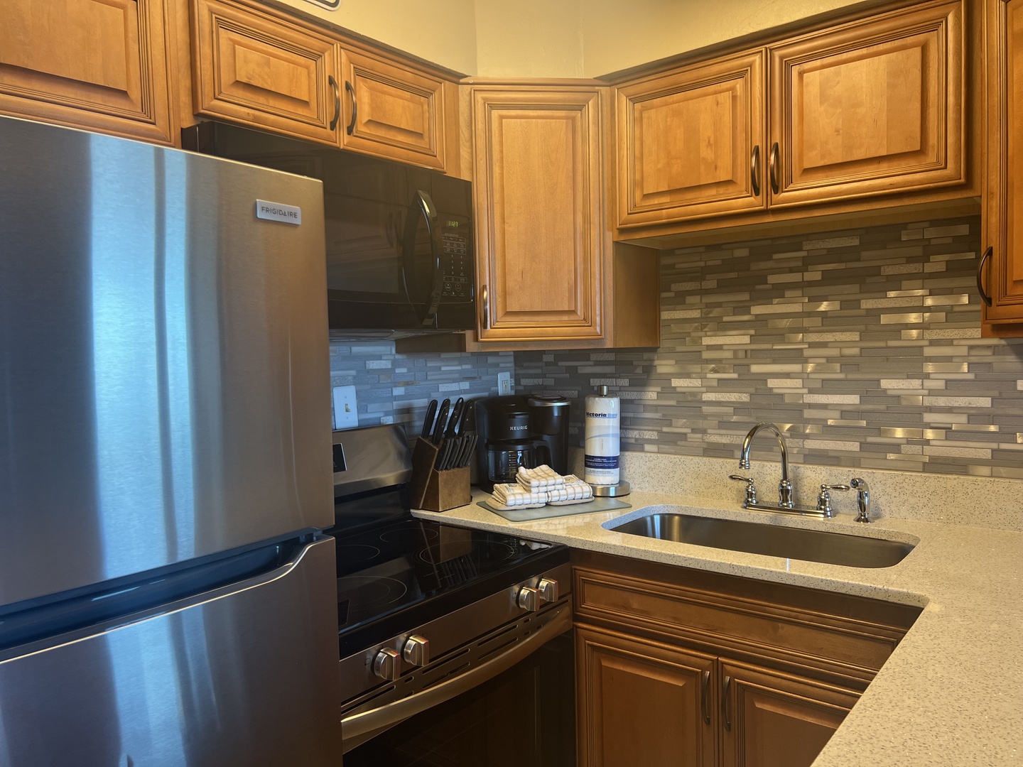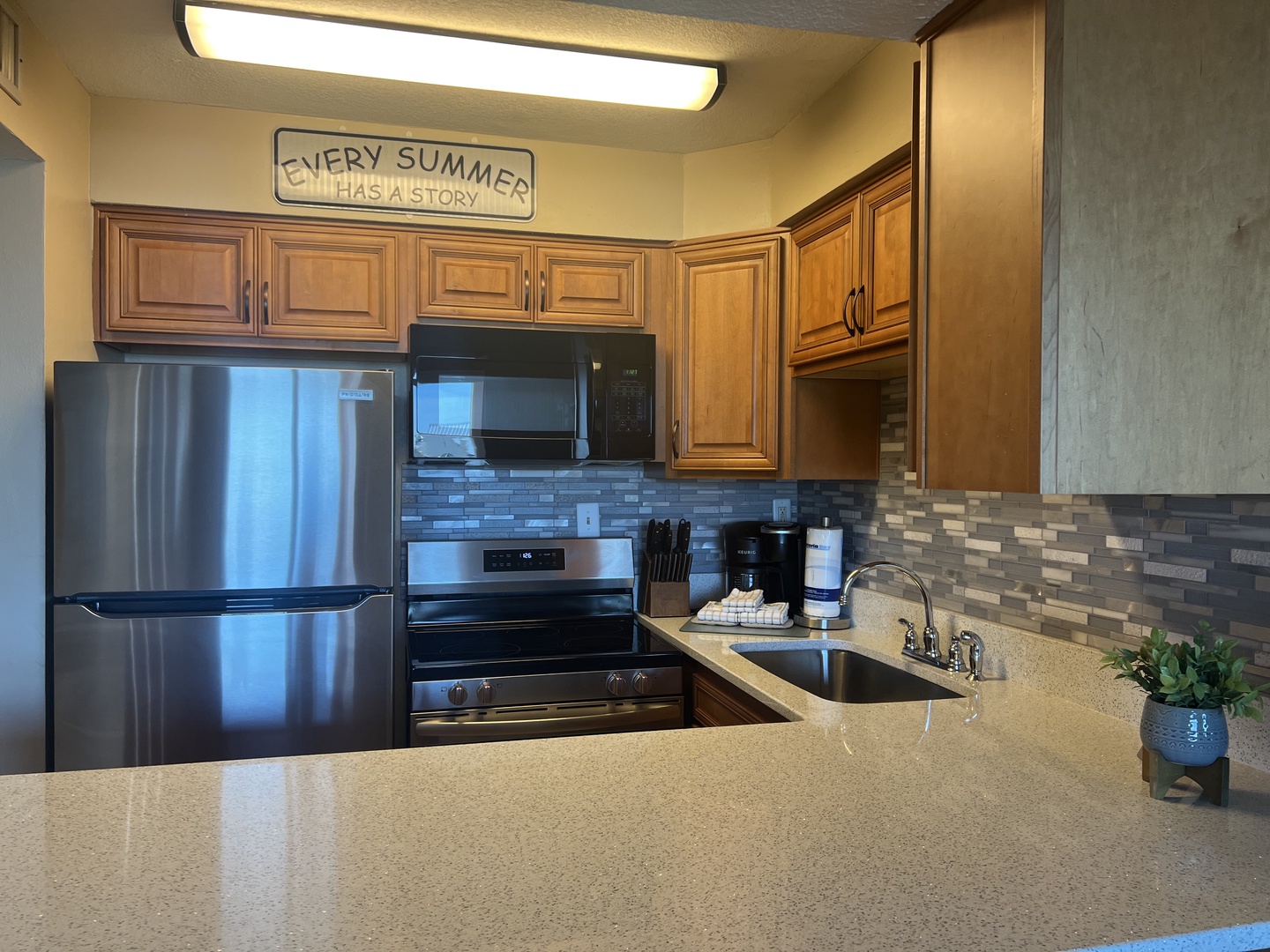 204A has been decorated with a coastal vibe throughout, custom kitchen cabinets, gorgeous quartz countertops and wood look luxury vinyl plank flooring.