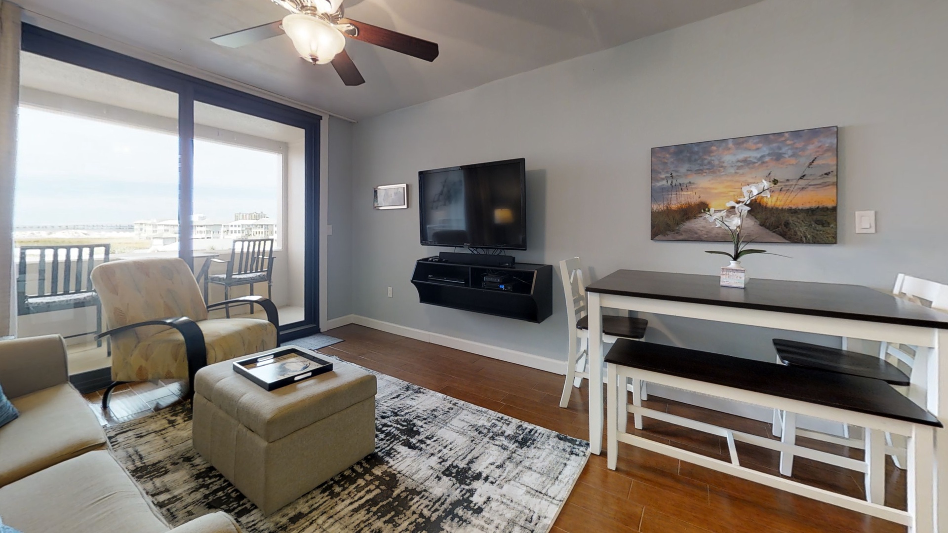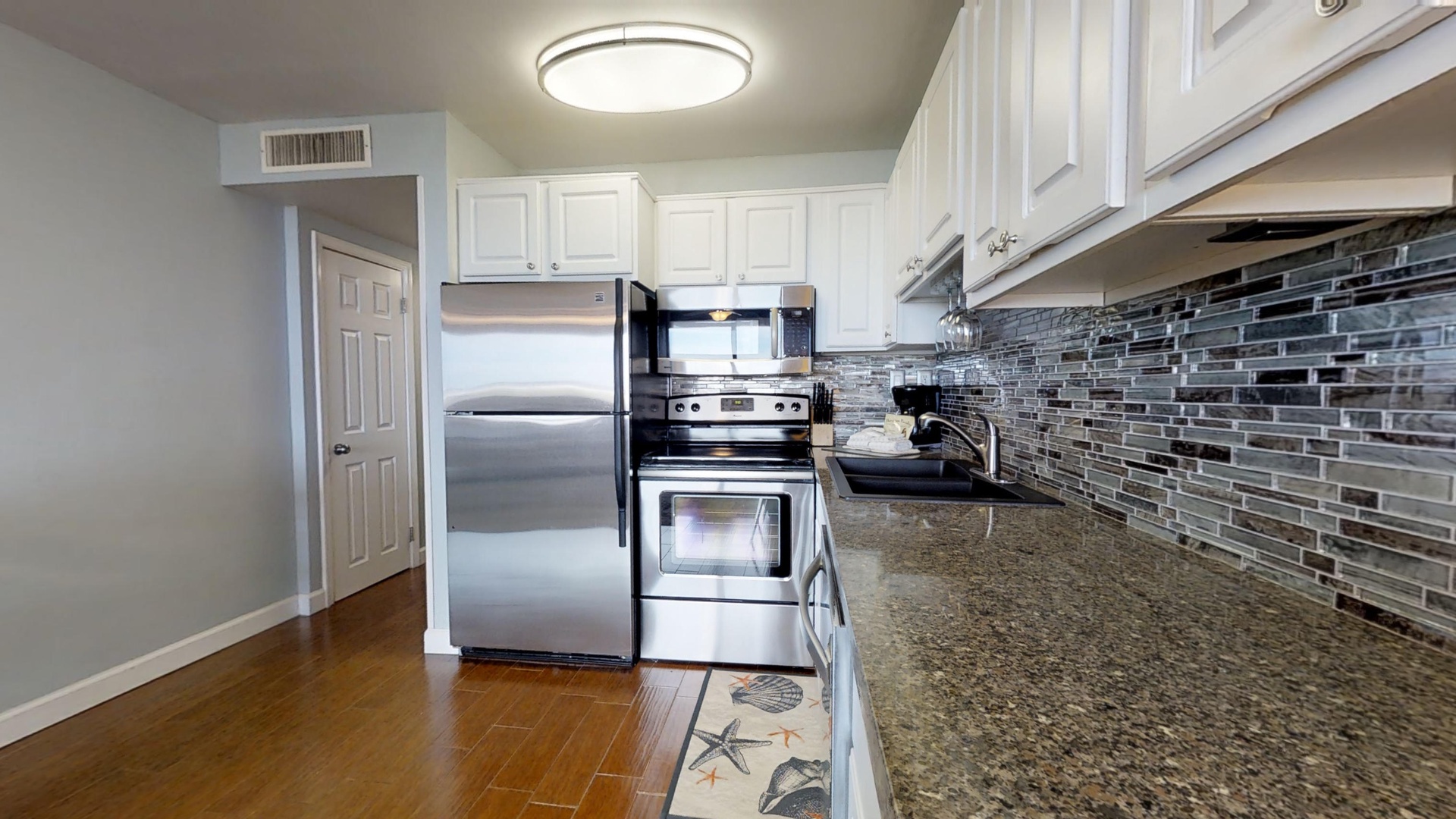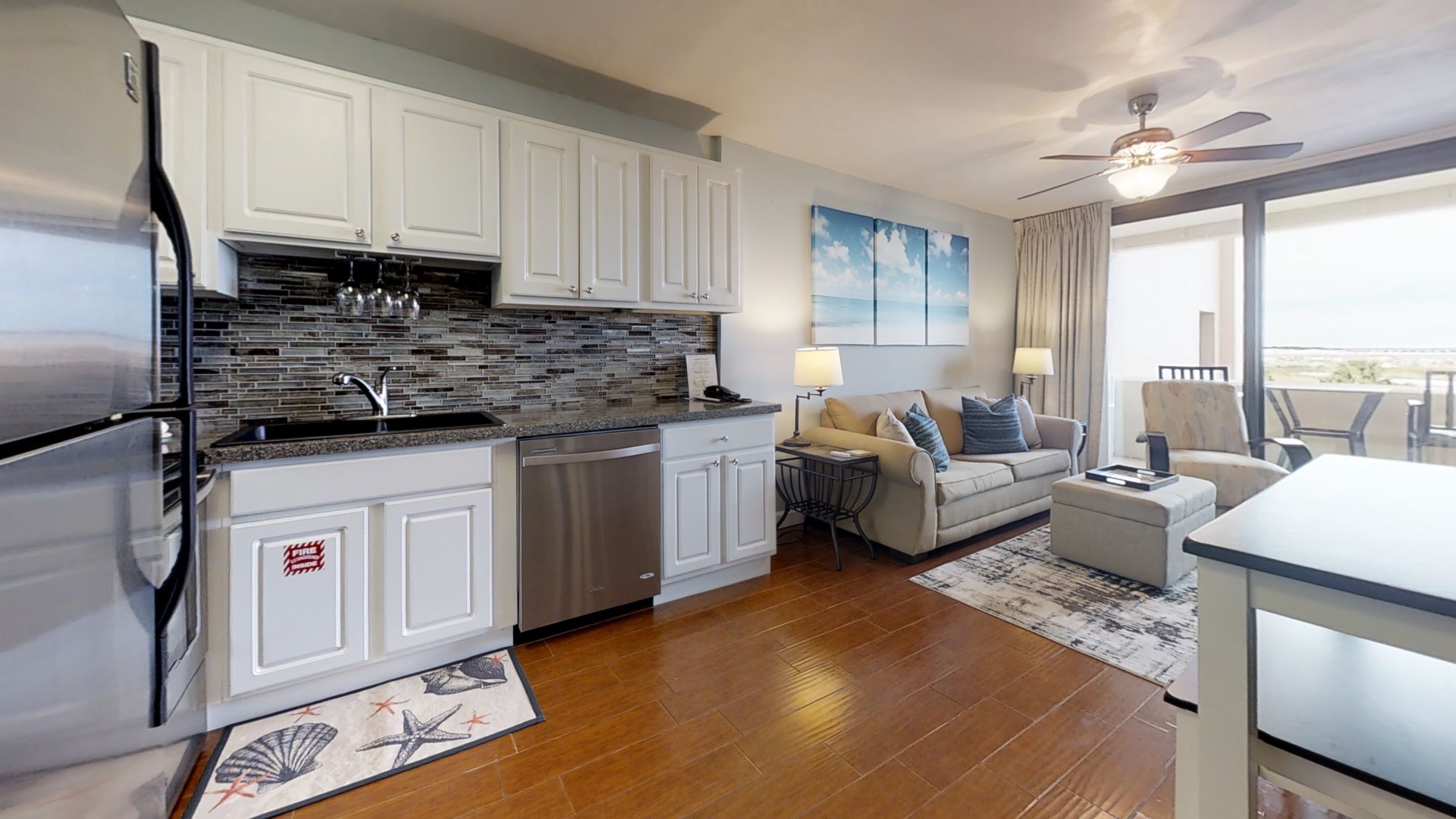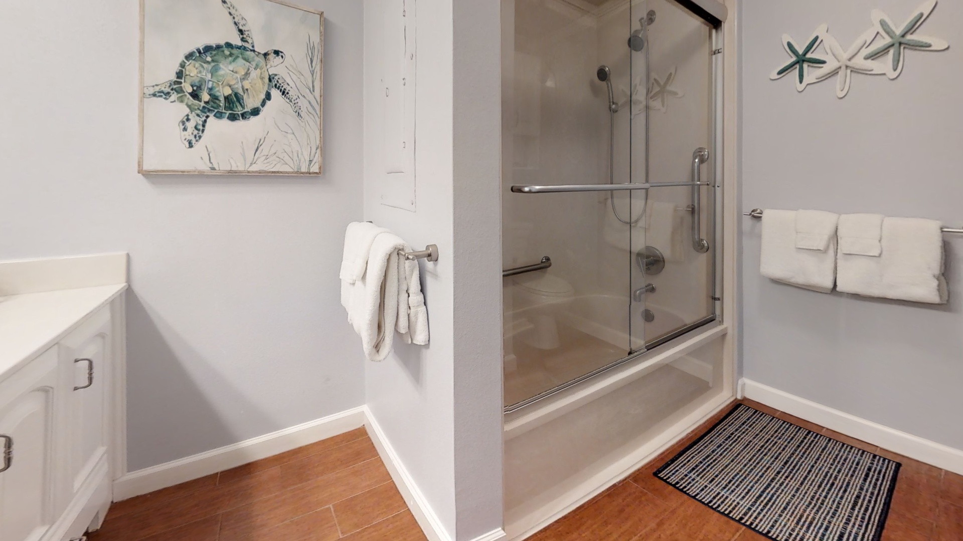 King Size Bed in Bedroom, Queen Size Sleeper Sofa in Living Area. Meticulously decorated and furnished in welcoming neutral tones complete with wall-to-wall wood-look tile. The open layout kitchen boasts Silestone quartz counters, stainless steel appliances, ice-maker and a pantry. Enjoy the 50” LED TV in the living room, listen to your iPod through the iLive Sound bar and log into your Netflix account to watch your favorite movies via the Smart Blu-Ray player. The sliding, floor-to-ceiling glass doors take you from the living area onto the open-air balcony where counter-height furniture offers views of Destin’s famous fishing fleet sailing daily on the East Pass, Lake Christina, and the Destin Jetty. In season, watch Destin’s fireworks display right from your own balcony. Relax in the bedroom with a 32” LCD TV, Blu-Ray Player and ceiling fan. In addition to the double-door bedroom closet and large dresser, extra clothing storage is located in the foyer. The bright and airy bathroom contains a hand-held shower, with 2 grab bars and a comfort-height toilet.