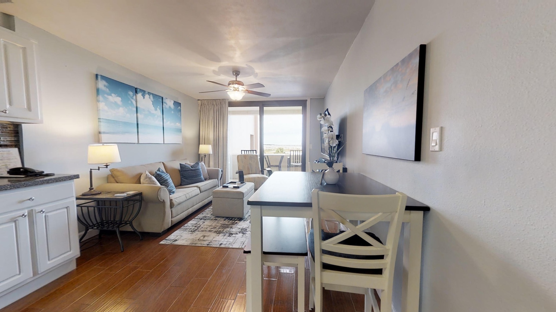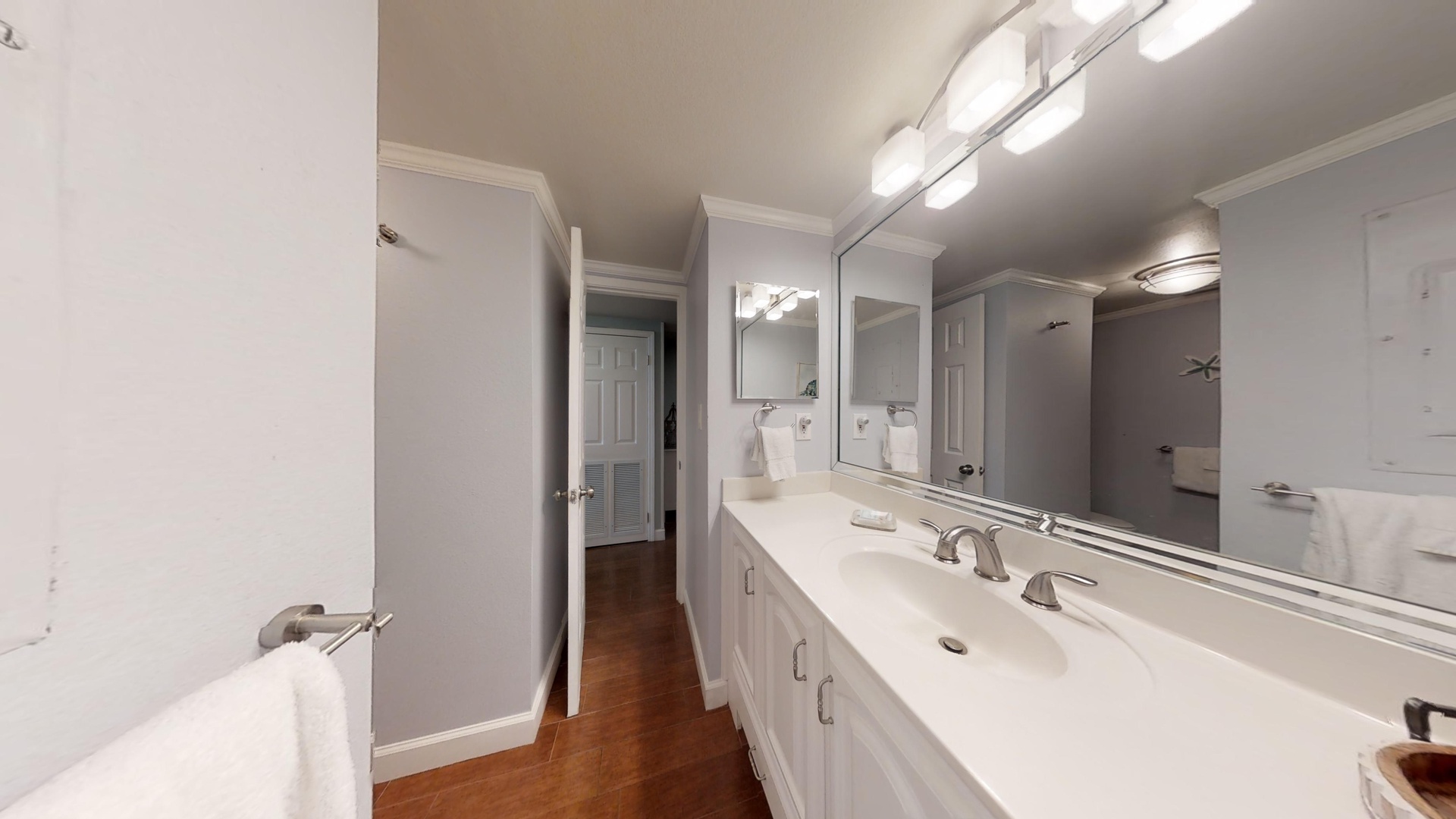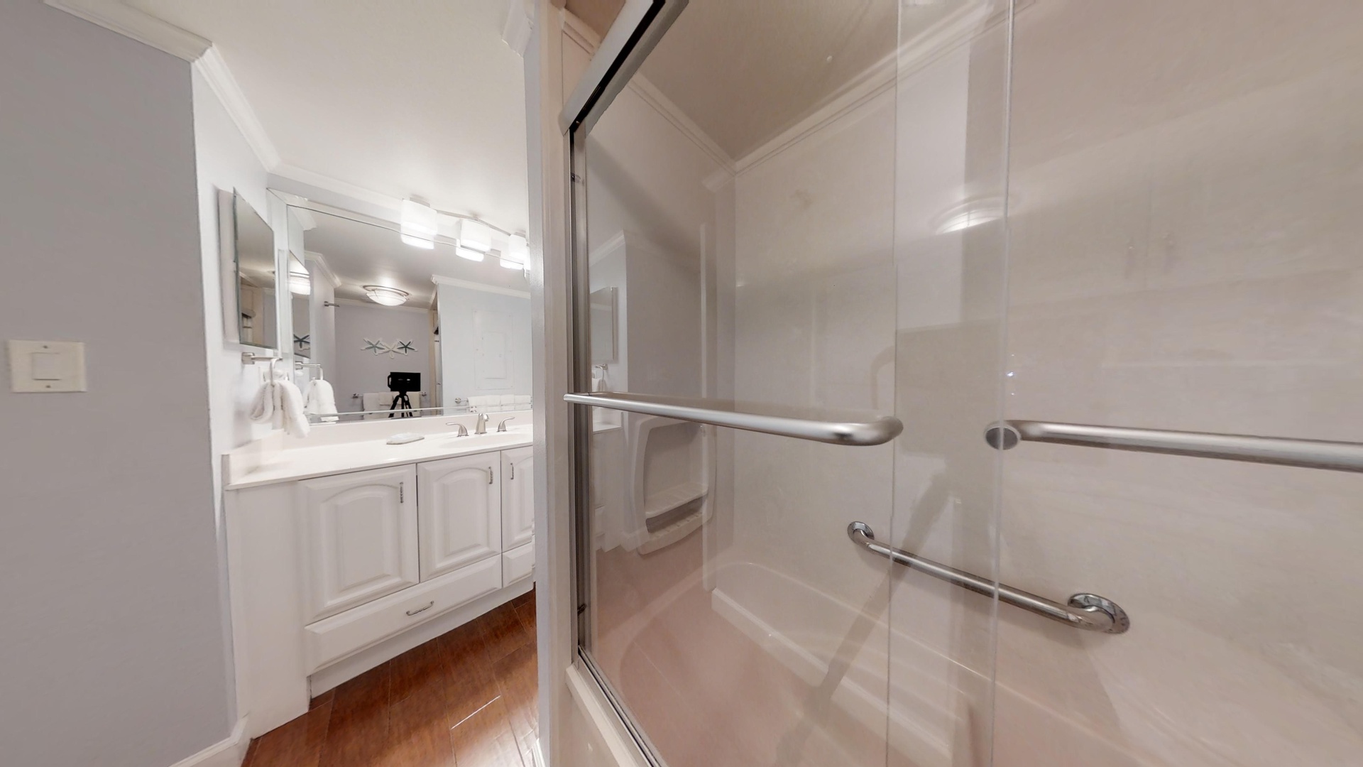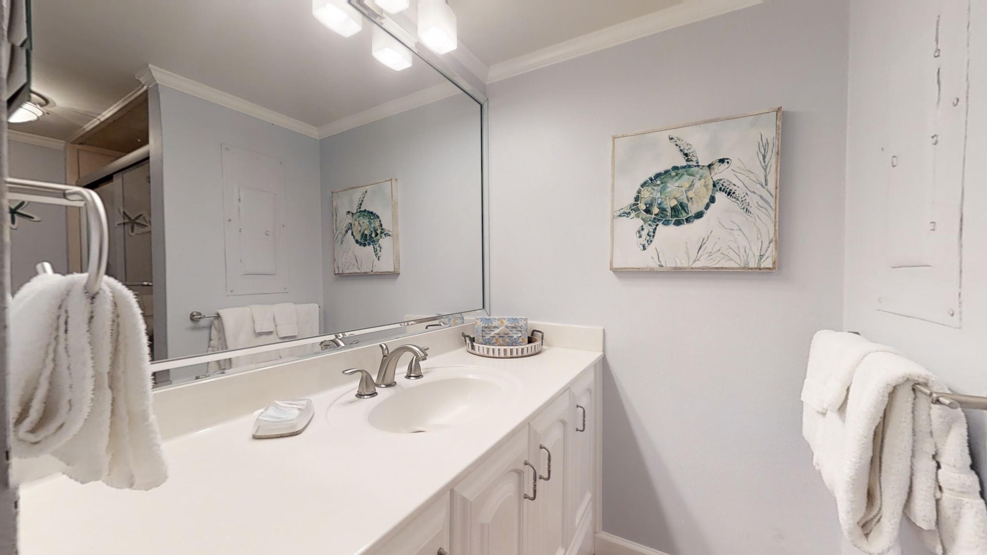 King Size Bed in Bedroom, Queen Size Sleeper Sofa in Living Area. Meticulously decorated and furnished in welcoming neutral tones complete with wall-to-wall wood-look tile. The open layout kitchen boasts Silestone quartz counters, stainless steel appliances, ice-maker and a pantry. Enjoy the 50” LED TV in the living room, listen to your iPod through the iLive Sound bar and log into your Netflix account to watch your favorite movies via the Smart Blu-Ray player. The sliding, floor-to-ceiling glass doors take you from the living area onto the open-air balcony where counter-height furniture offers views of Destin’s famous fishing fleet sailing daily on the East Pass, Lake Christina, and the Destin Jetty. In season, watch Destin’s fireworks display right from your own balcony. Relax in the bedroom with a 32” LCD TV, Blu-Ray Player and ceiling fan. In addition to the double-door bedroom closet and large dresser, extra clothing storage is located in the foyer. The bright and airy bathroom contains a hand-held shower, with 2 grab bars and a comfort-height toilet.