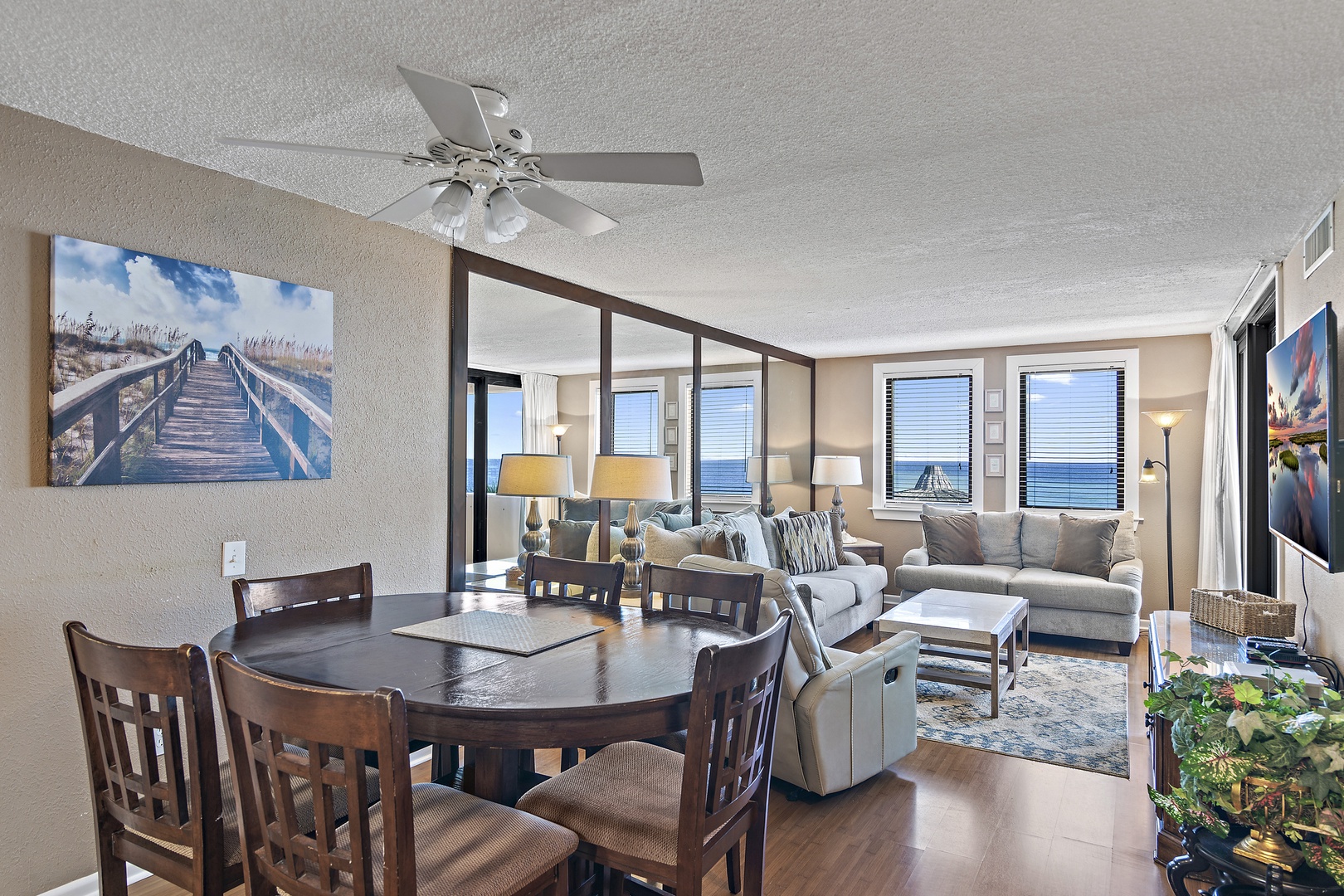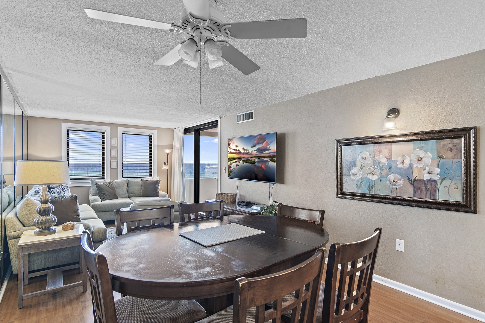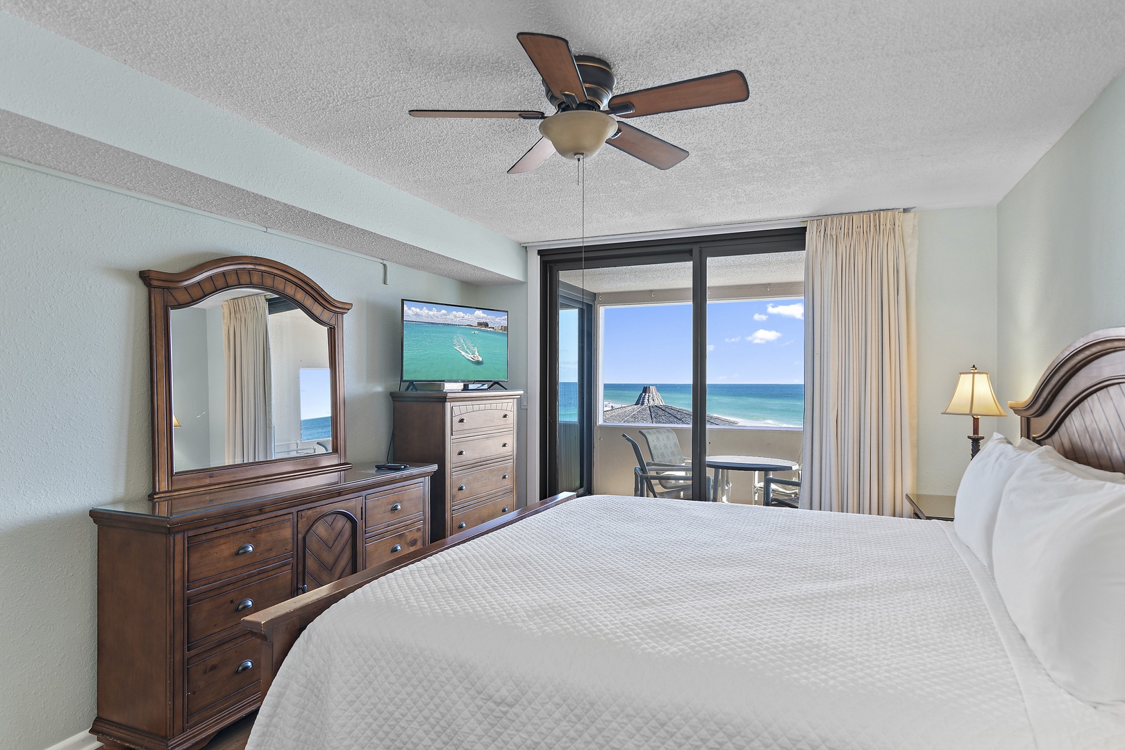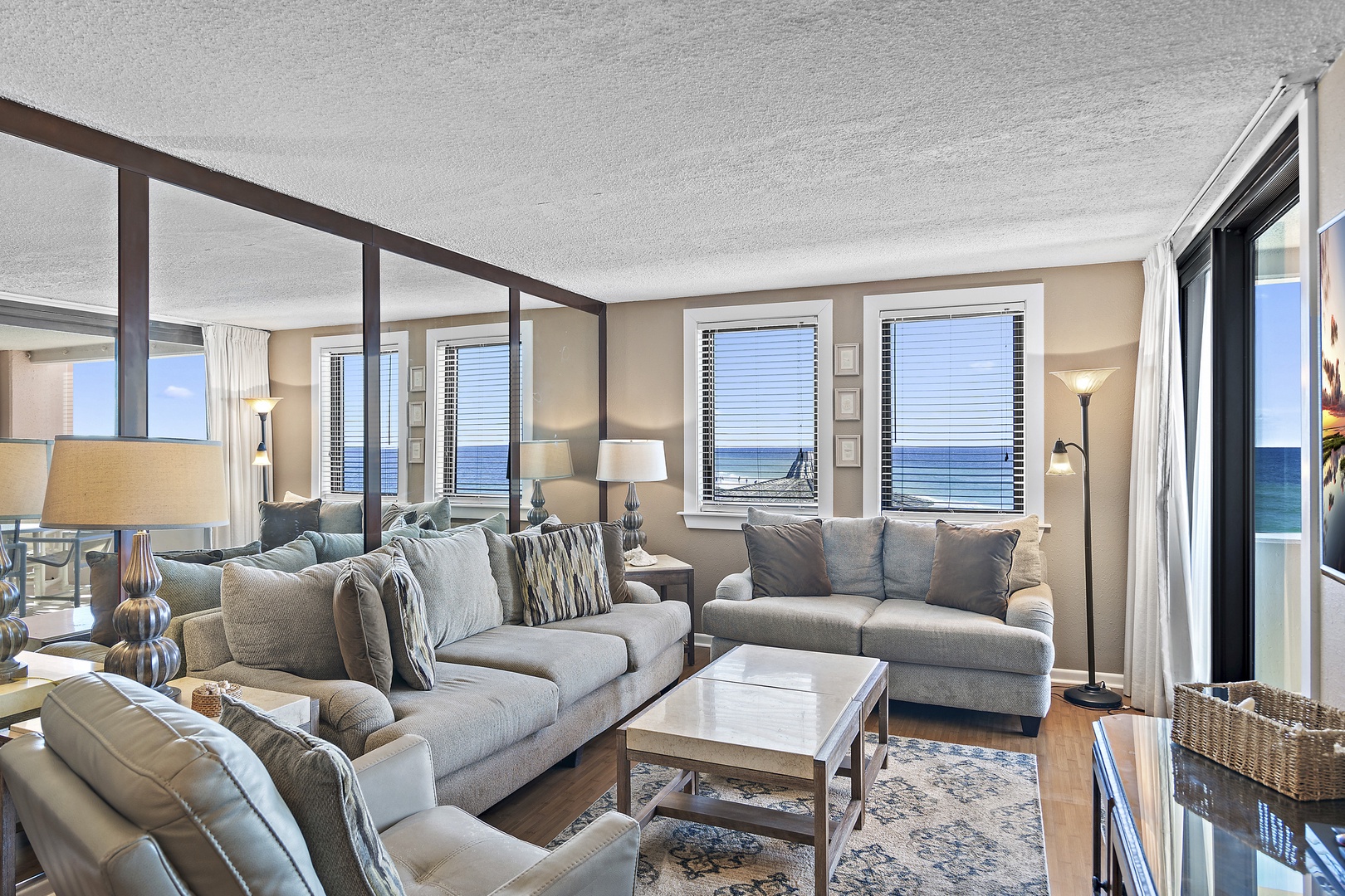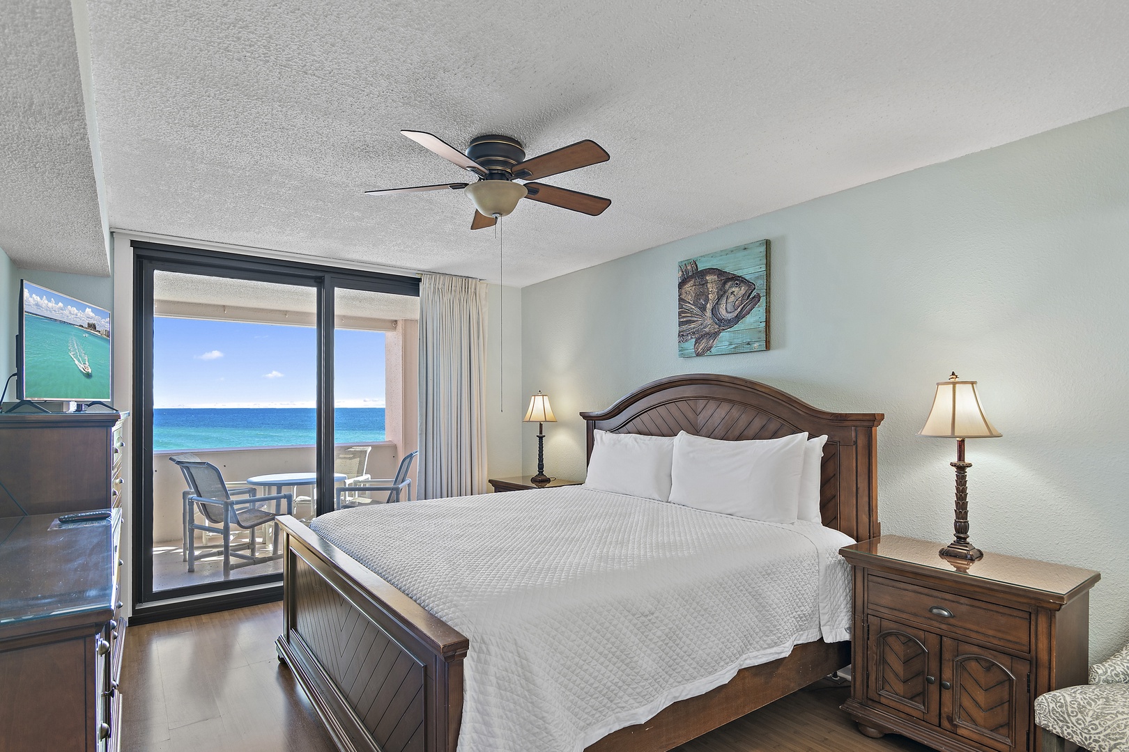 2nd Floor: Gulf View- Two Bedroom, Two Bathroom, King Size Bed in Master Bedroom and Two Double Beds in Guest Bedroom. Feel the warmth of the wood floors throughout this unit. Glass Doors Lead out onto the Open Balcony From the Living Area and Master Bedroom. Relax on the Open Balcony and enjoy the incredible view. Escape to this Master Bedroom with a Private Bath, Ceiling Fan, and a 32 inch LCD TV. Gather in the Living Area and watch the 55 inch HD/LCD TV and DVD Player; the Mirrored Wall expands the space. The children can enjoy the TV in the secondary bedroom. Stay cool under the Ceiling Fans in the Dining Area, Master, and Secondary Bedroom.