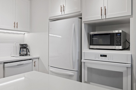 When you turn the corner from the hall, you cannot miss the gorgeous kitchen that has been completely redesigned with tons of cabinet space, full size refrigerator with ice maker, stunning quartz countertops, glass tile backsplash, and peninsula seating for two.