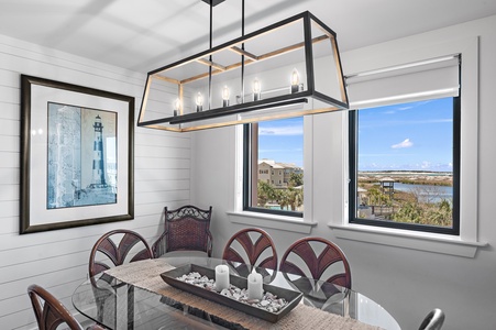 The dining area has a large glass-top oval table with seating for six. You’ll get a perfect view of the sunset while you enjoy fabulous Destin seafood - hopefully grilled at our own pavilion.