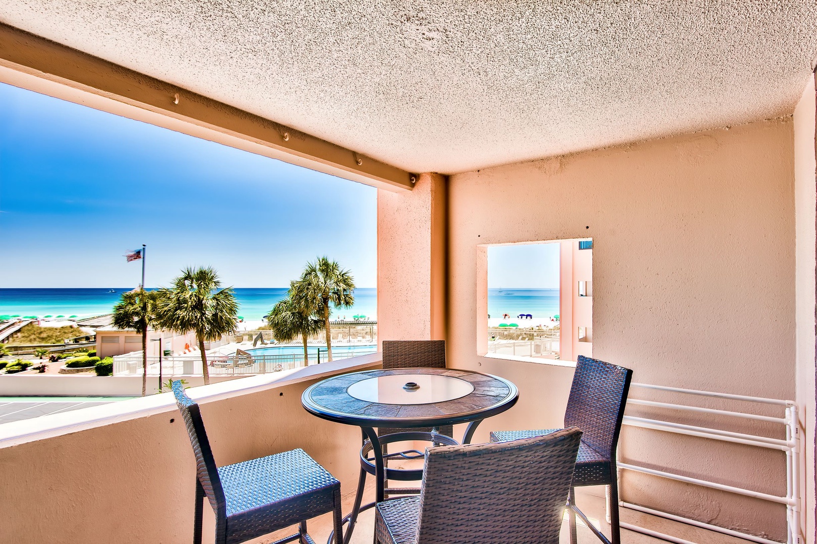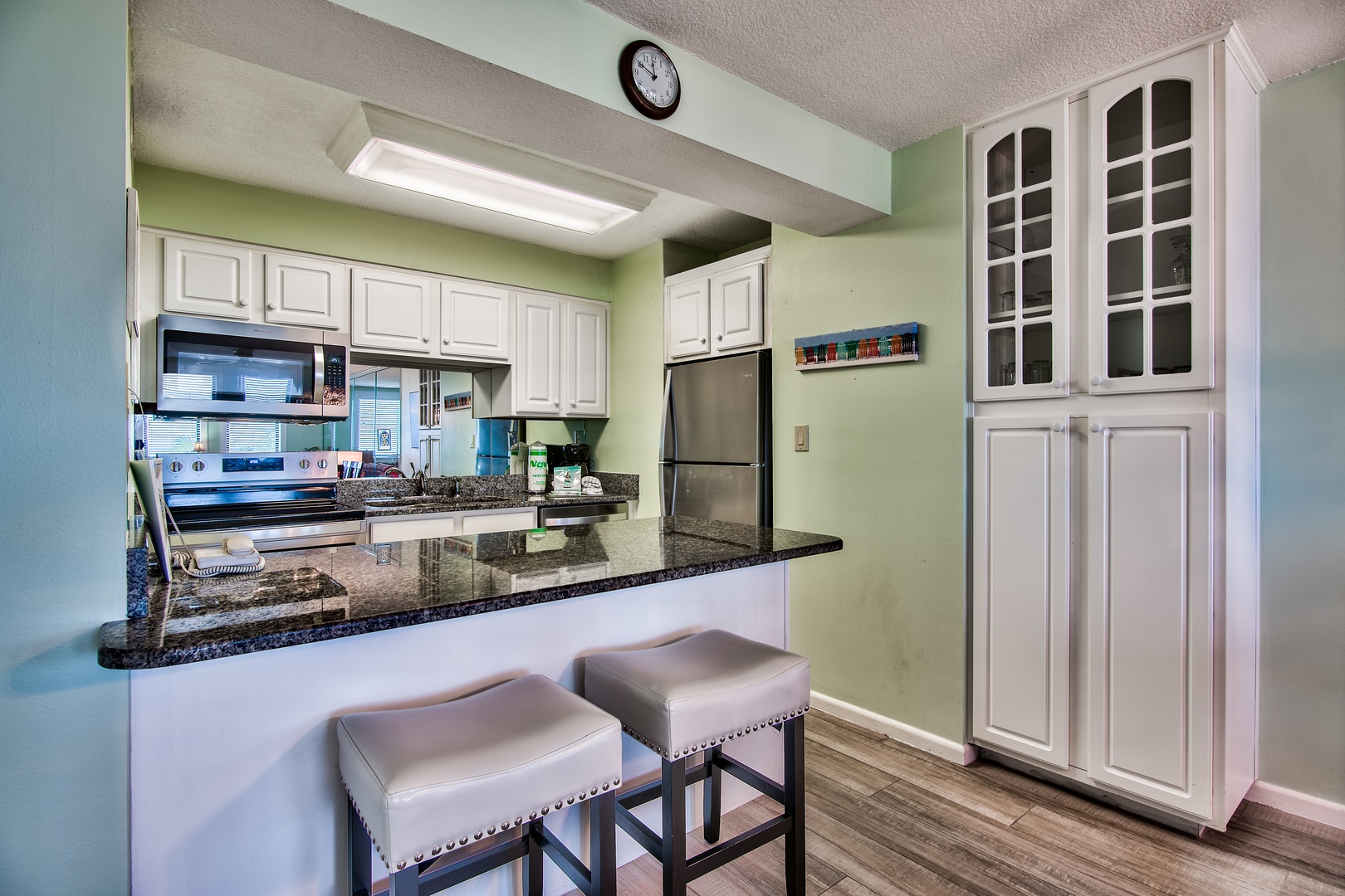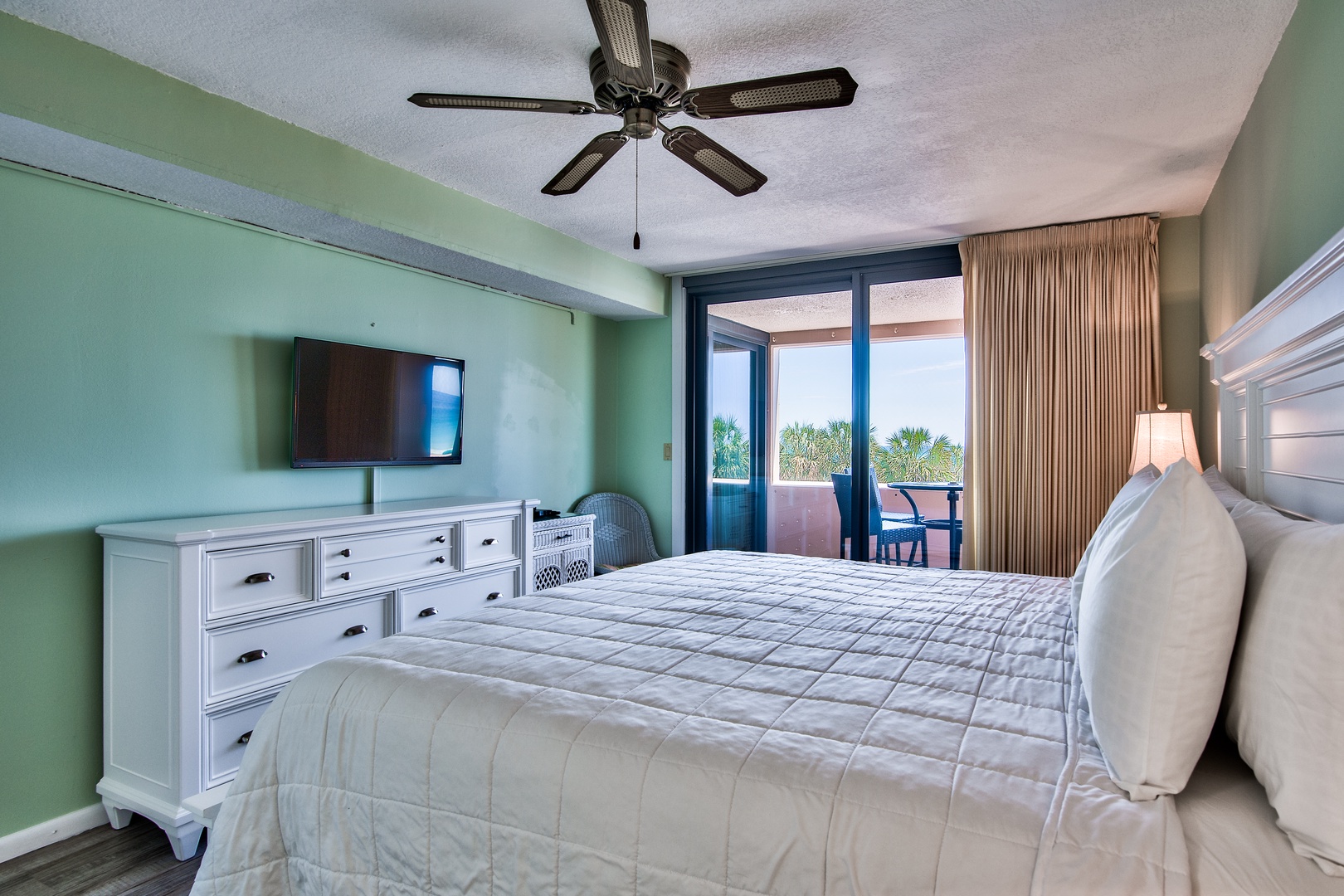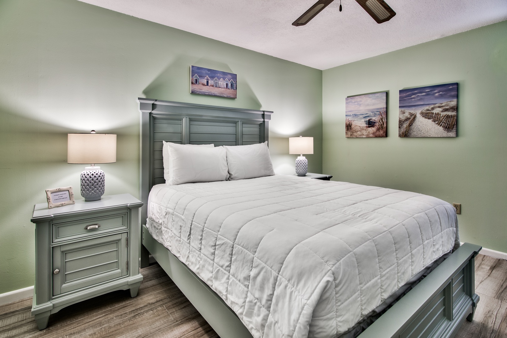 2nd Floor, Two Bedroom, Two Bath, King Size Bed in Master Bedroom, Queen Size Bed in Secondary Bedroom, Sleeper Sofa in Living Area. The Large Diagonally Laid Tile Floor and the Six Panel Doors are Nice Accents in this unit. The Large Glass Doors in the Living Area and the Master Bedroom take you out onto the Open Balcony where you can sit in the Bar Height Furniture and Vacation. The Hall Bath has a corner shower and the Private Master Bath has been opened to maximize the space.