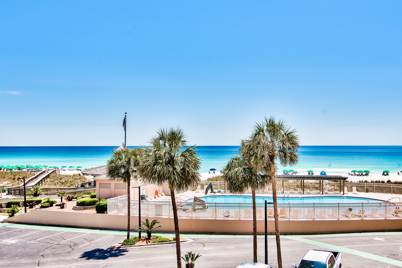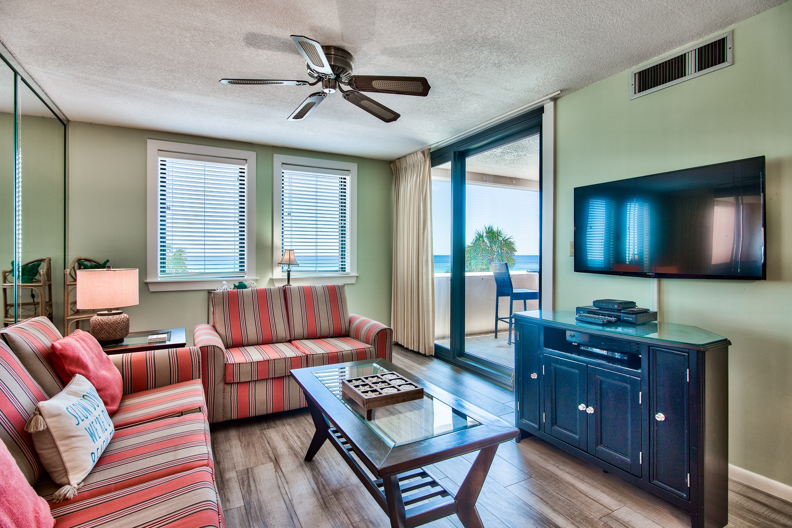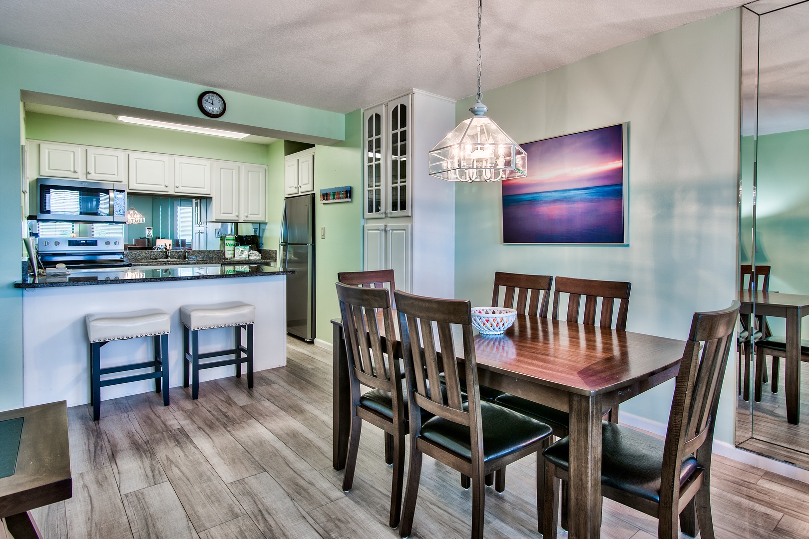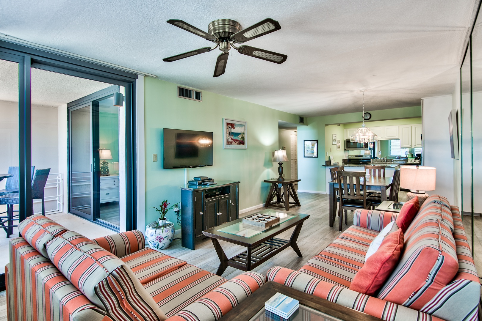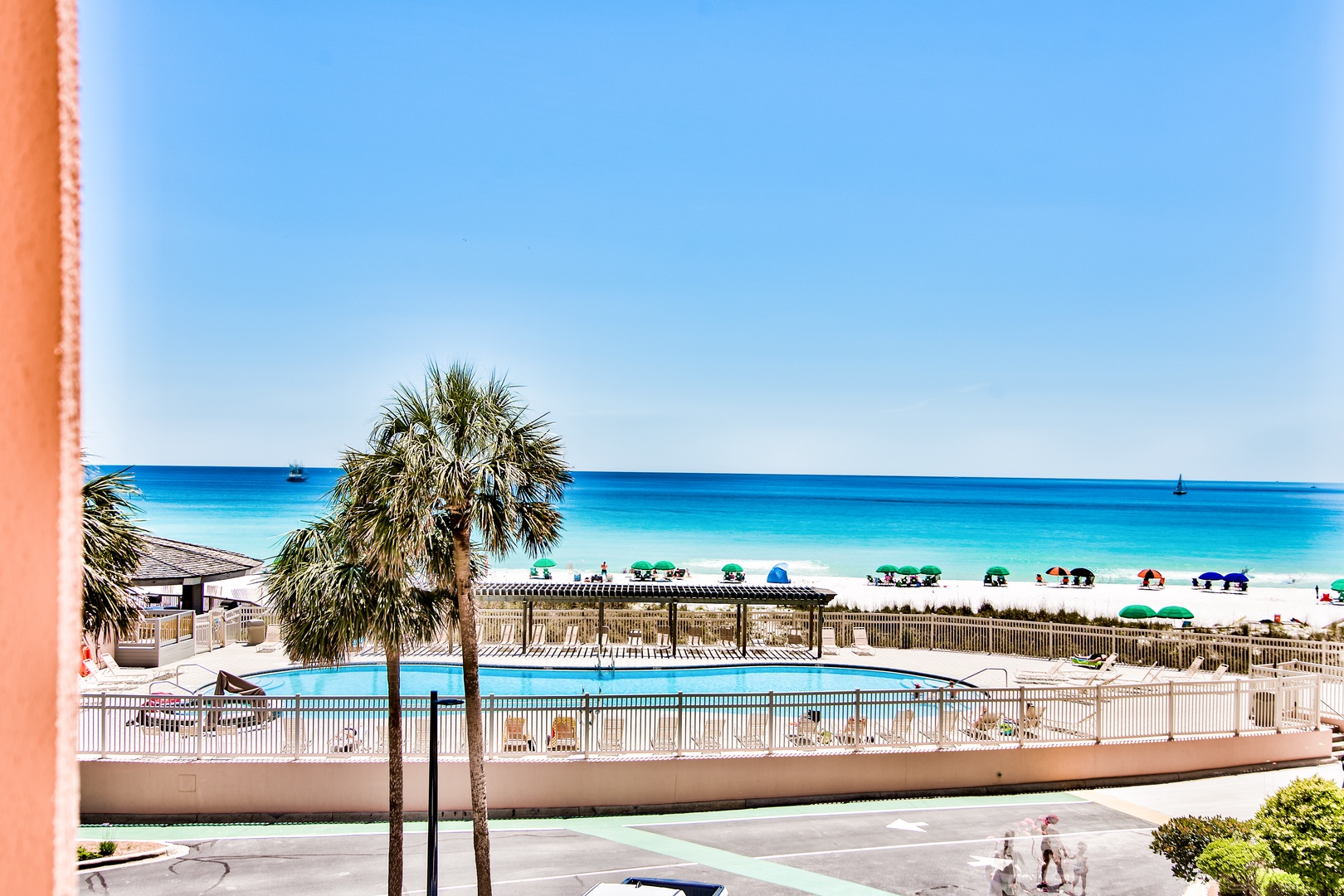 2nd Floor, Two Bedroom, Two Bath, King Size Bed in Master Bedroom, Queen Size Bed in Secondary Bedroom, Sleeper Sofa in Living Area. The Large Diagonally Laid Tile Floor and the Six Panel Doors are Nice Accents in this unit. The Large Glass Doors in the Living Area and the Master Bedroom take you out onto the Open Balcony where you can sit in the Bar Height Furniture and Vacation. The Hall Bath has a corner shower and the Private Master Bath has been opened to maximize the space.