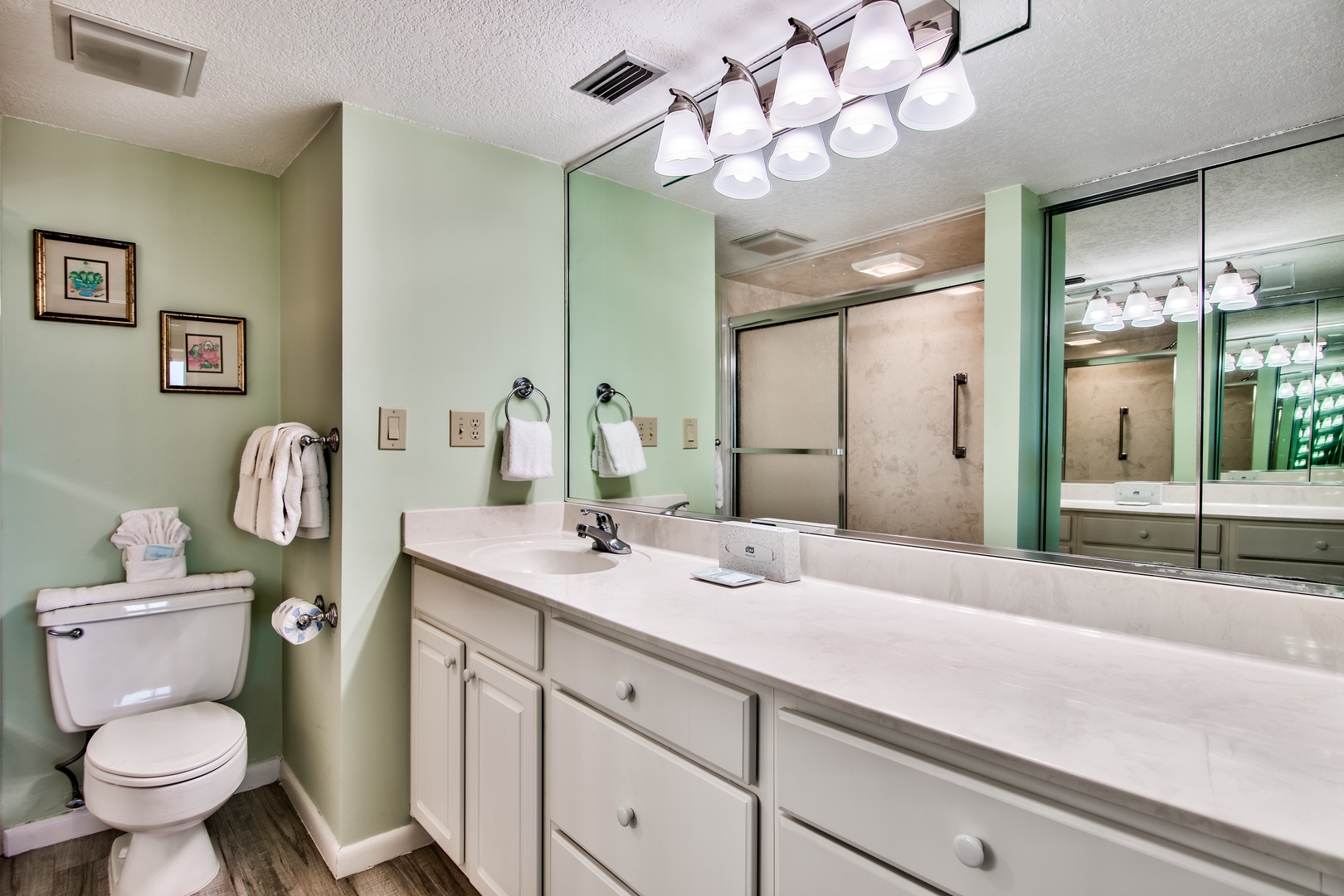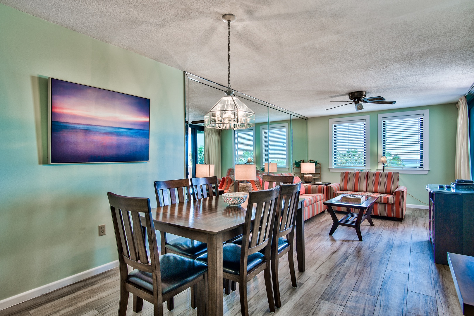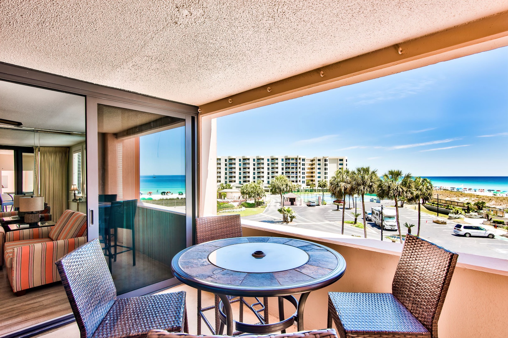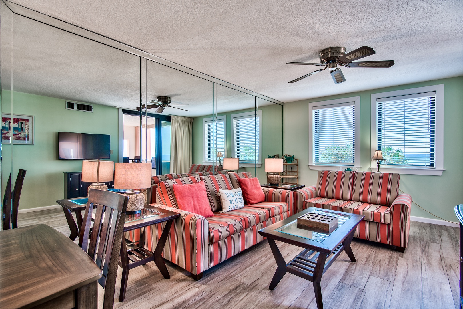 2nd Floor, Two Bedroom, Two Bath, King Size Bed in Master Bedroom, Queen Size Bed in Secondary Bedroom, Sleeper Sofa in Living Area. The Large Diagonally Laid Tile Floor and the Six Panel Doors are Nice Accents in this unit. The Large Glass Doors in the Living Area and the Master Bedroom take you out onto the Open Balcony where you can sit in the Bar Height Furniture and Vacation. The Hall Bath has a corner shower and the Private Master Bath has been opened to maximize the space.