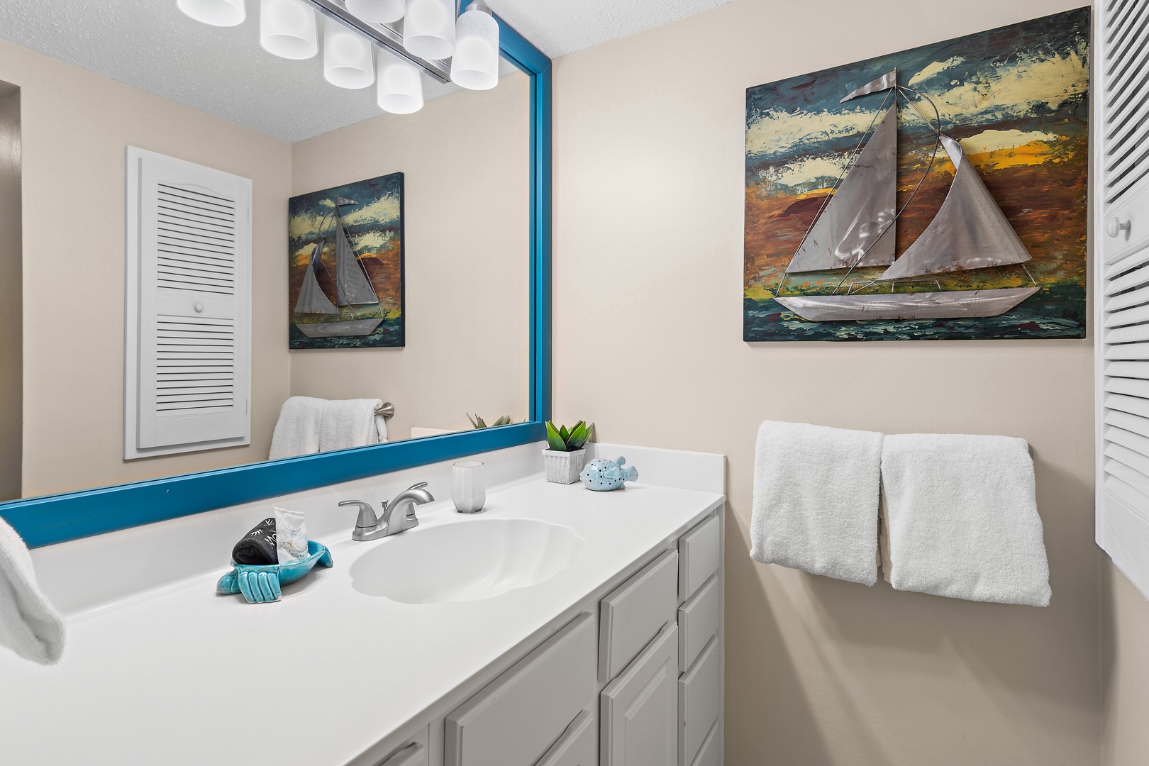 Your coastal-themed bathroom features nautical artwork and a bright mirror, creating a refreshing space to prepare for your beach adventures.