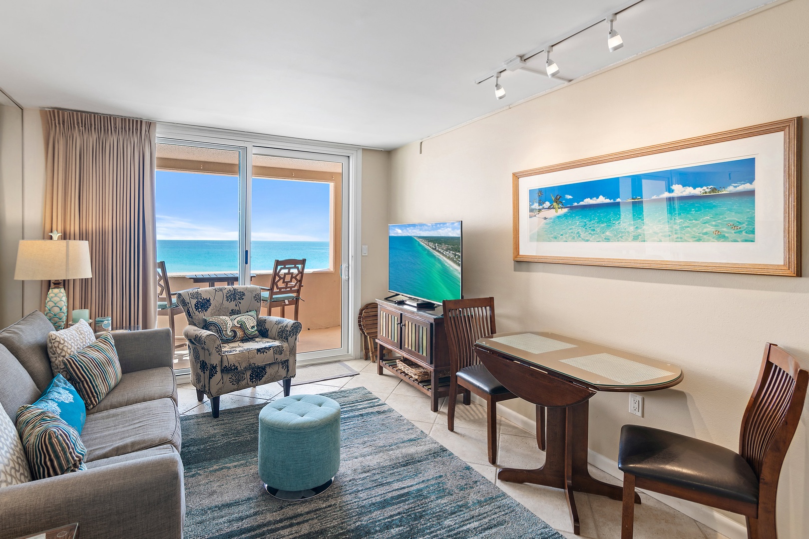 Relax in your oceanfront living room where turquoise waters stretch endlessly beyond floor-to-ceiling windows, creating the perfect backdrop for your beach getaway.