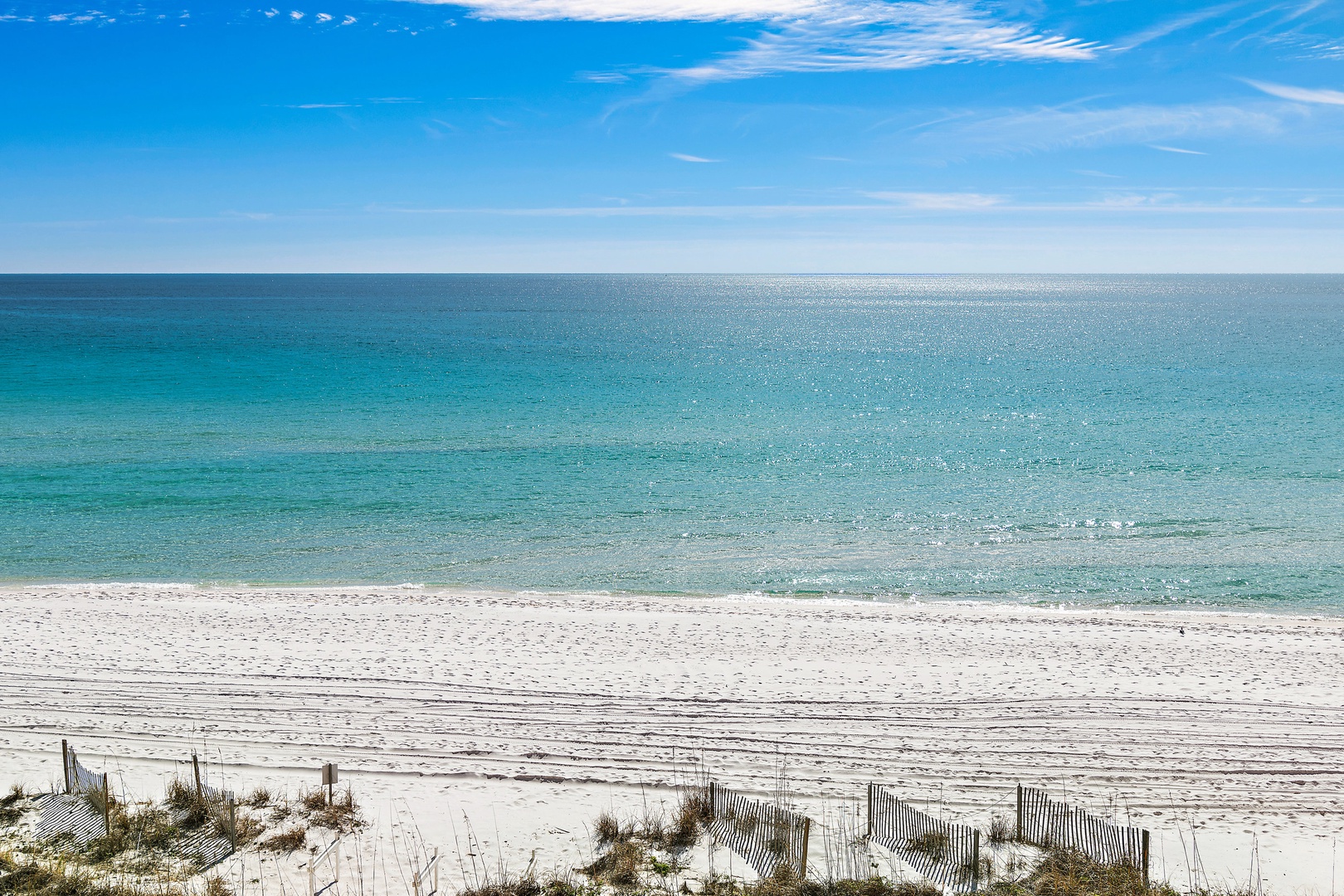 Pristine white sand beach stretches along turquoise waters under a brilliant blue sky with wispy clouds.