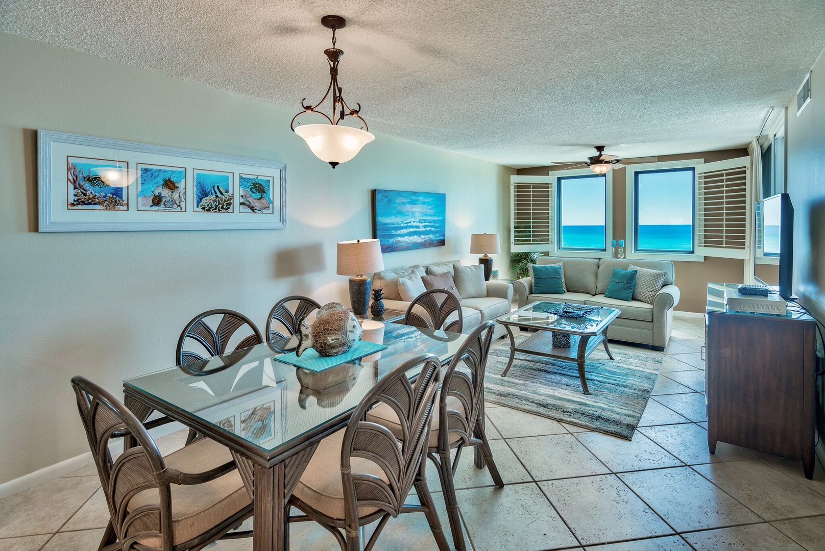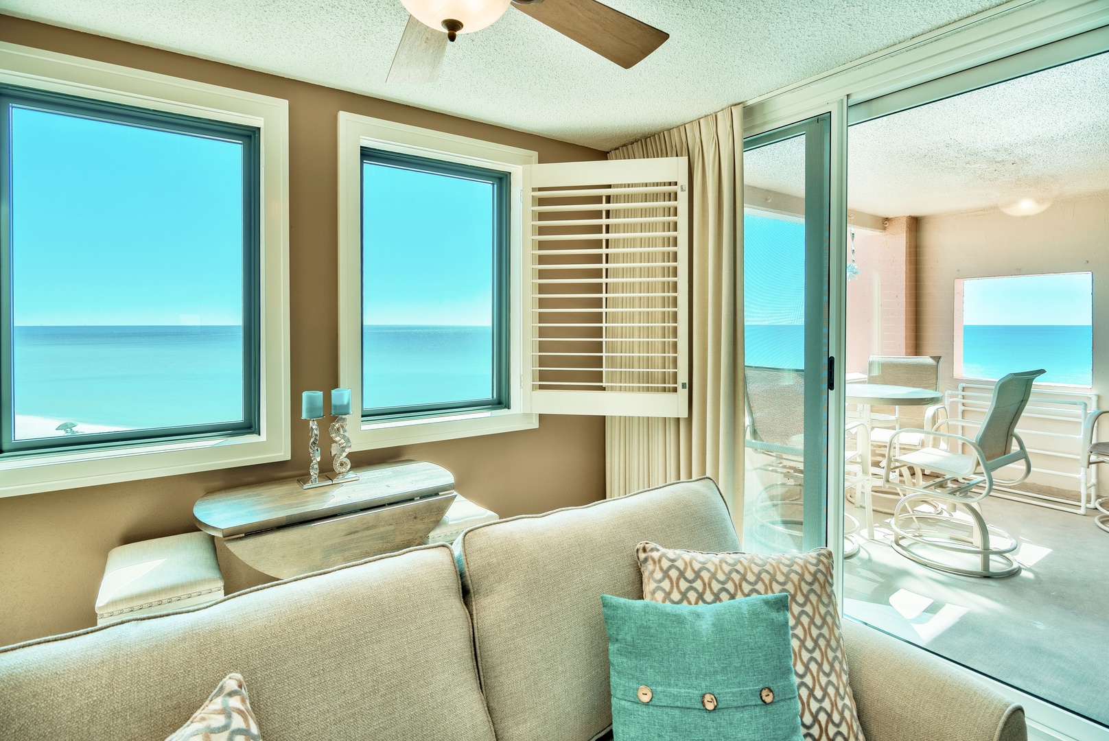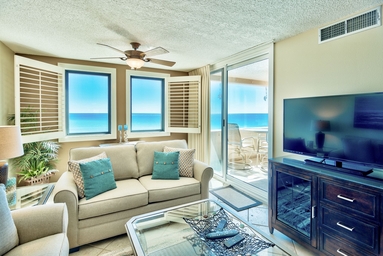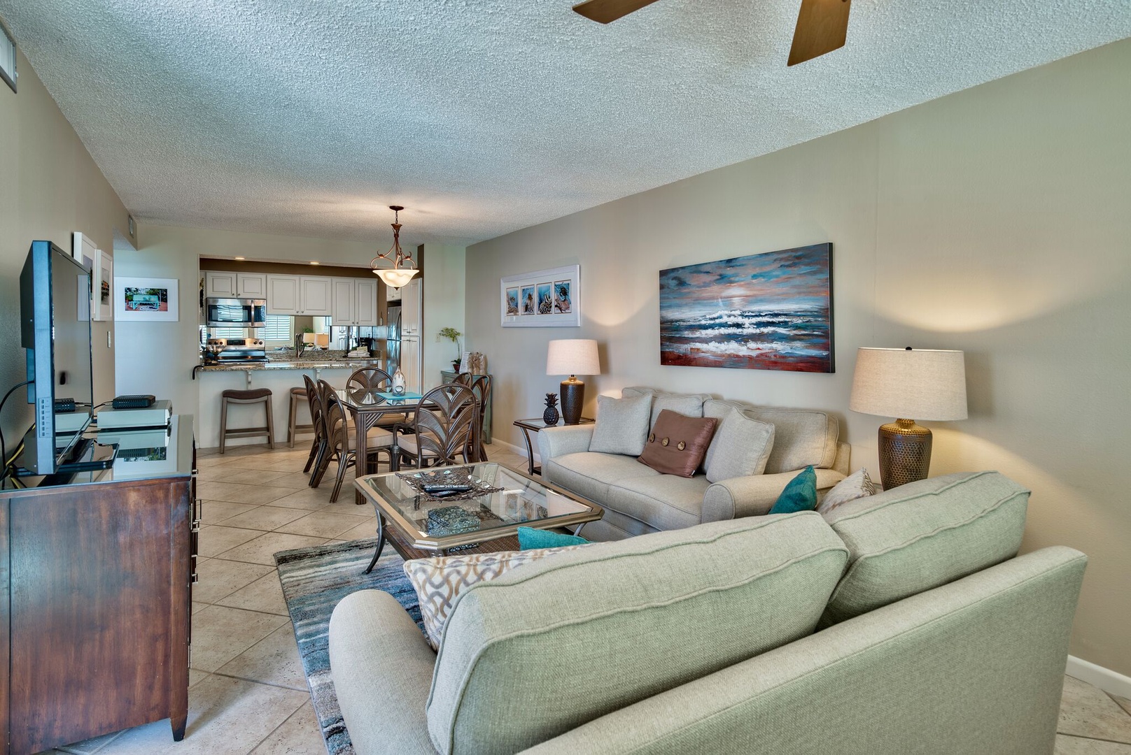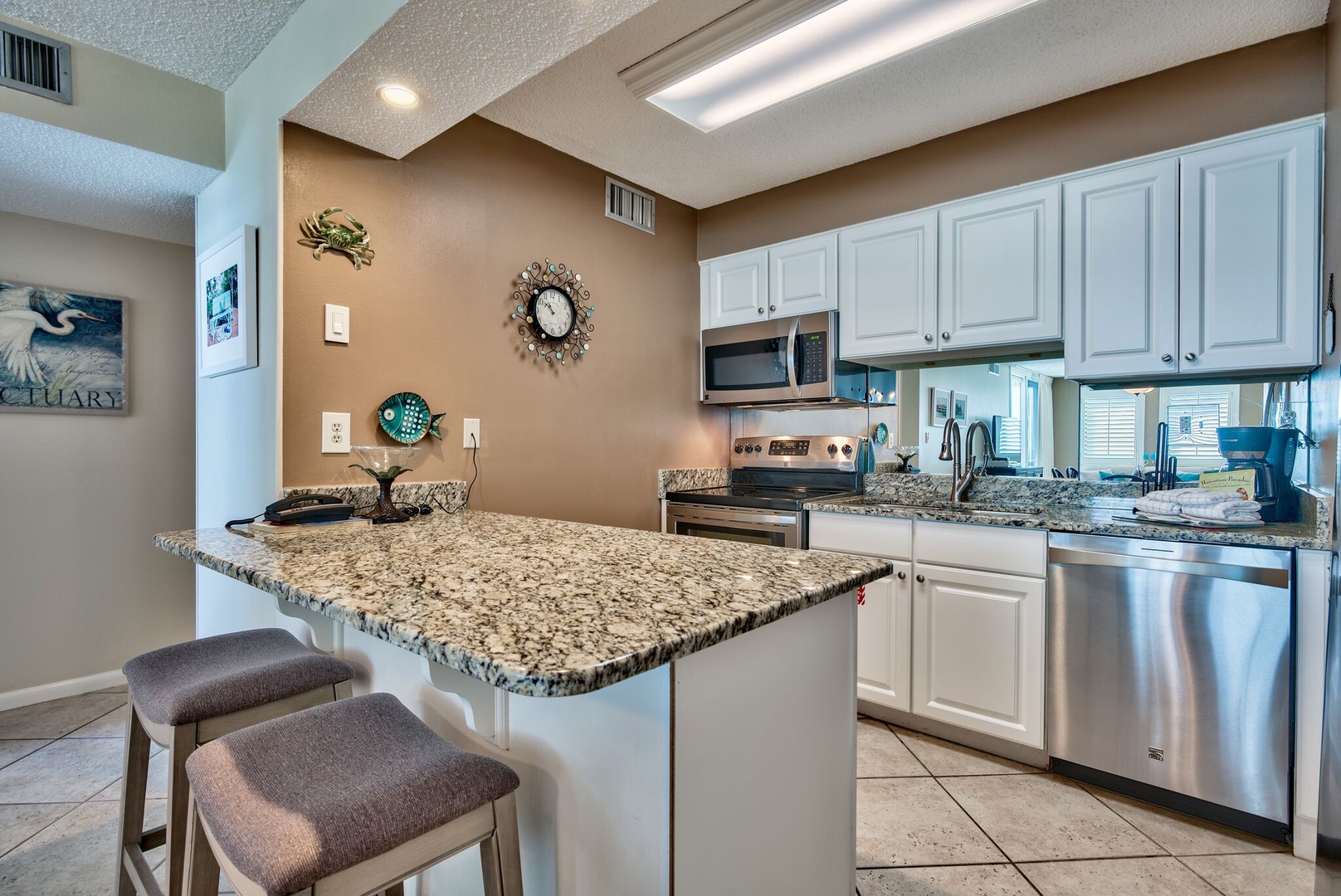 Fabulous view of gulf, beach, pool and pavilion. Watch the dolphins play in the gulf from the bar-height furniture on the open balcony. Of the two-bedroom units on the 3rd floor, this is the closest to the beach. The 3rd floor is high enough so that the view is not of the parking lot, but not so high as to discourage use of the stairs. The updated decor and beautiful diagonally laid porcelain tile floors make this a wonderful getaway to relax your body, refresh your mind and restore your soul. The master bedroom and living area have glass doors that lead out to the balcony. For your comfort, both bedrooms and living area have ceiling fans. The master bedroom has a private bath, and 40-inch LED smart TV. The living area features a 55-inch LED Smart (Roku) TV (Netflix, Amazon, Hulu and other apps pre-loaded). This unit offers an extra large pantry in the fully equipped kitchen with stainless steel appliances. The second bedroom has a 40- inch LED smart TV. Beautiful and comfortable for you to enjoy.