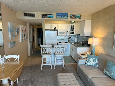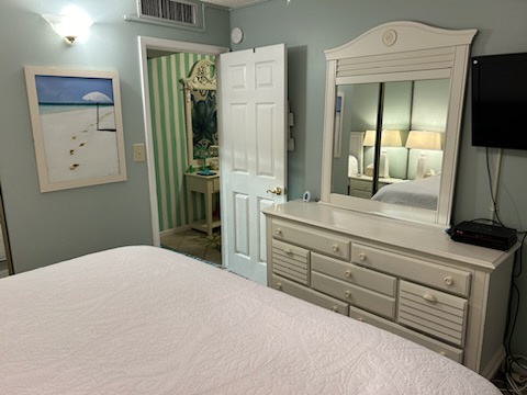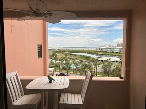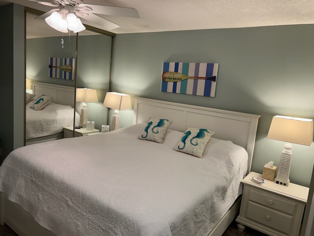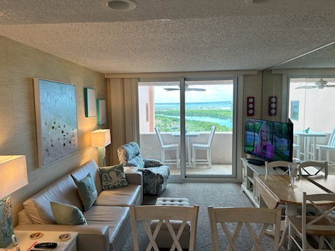 3rd Floor, One Bedroom/ One Bathroom, King Size Bed in Bedroom, Sleeper Sofa in Living Area. Carpet in the Living Room that lead you into the Kitchen and Living Area that has Glass Doors going out onto the Open Balcony. The Bar Height Furniture provides the perfect place to enjoy the Fantastic View of the East Pass. The Ceiling Fan in Bedroom help keep you cool. The Carpet in the Bedroom feels soft under your feet. Watch the 40 inch TV in the Bedroom and the 65 inch flat screen TV and DVD Player in the Living Area.