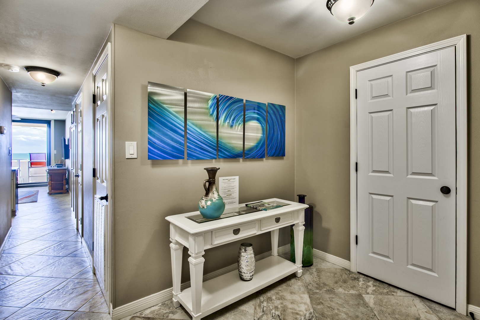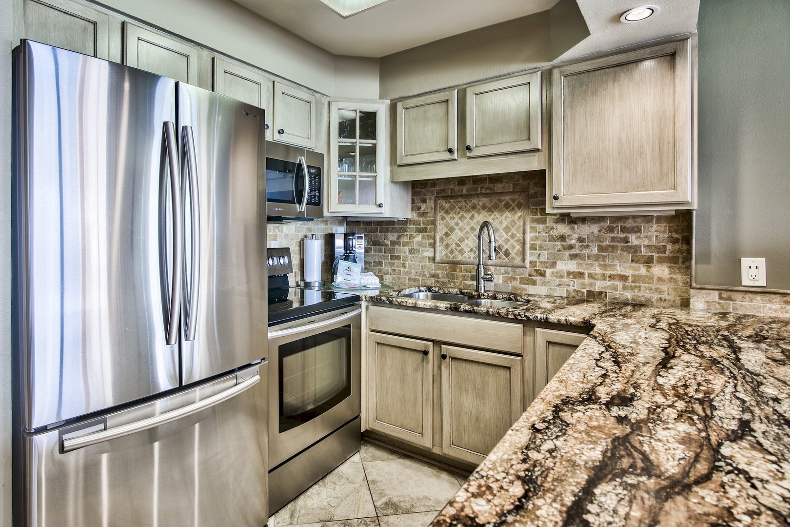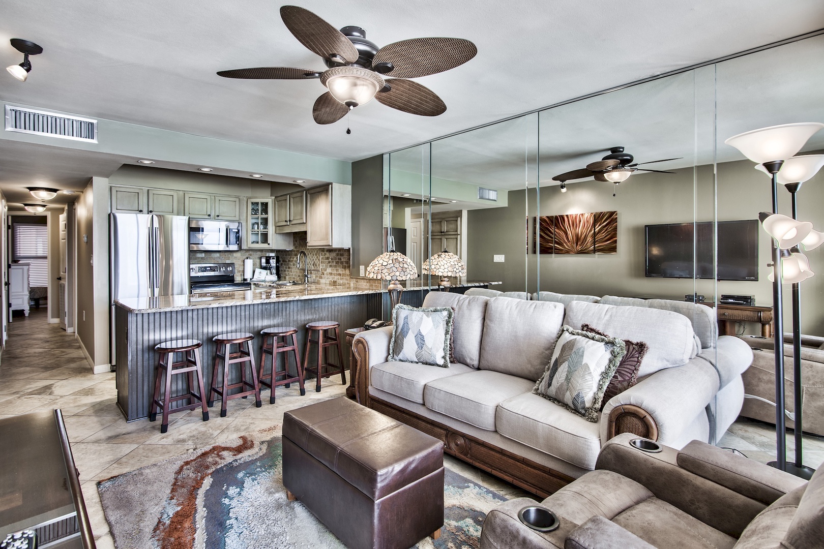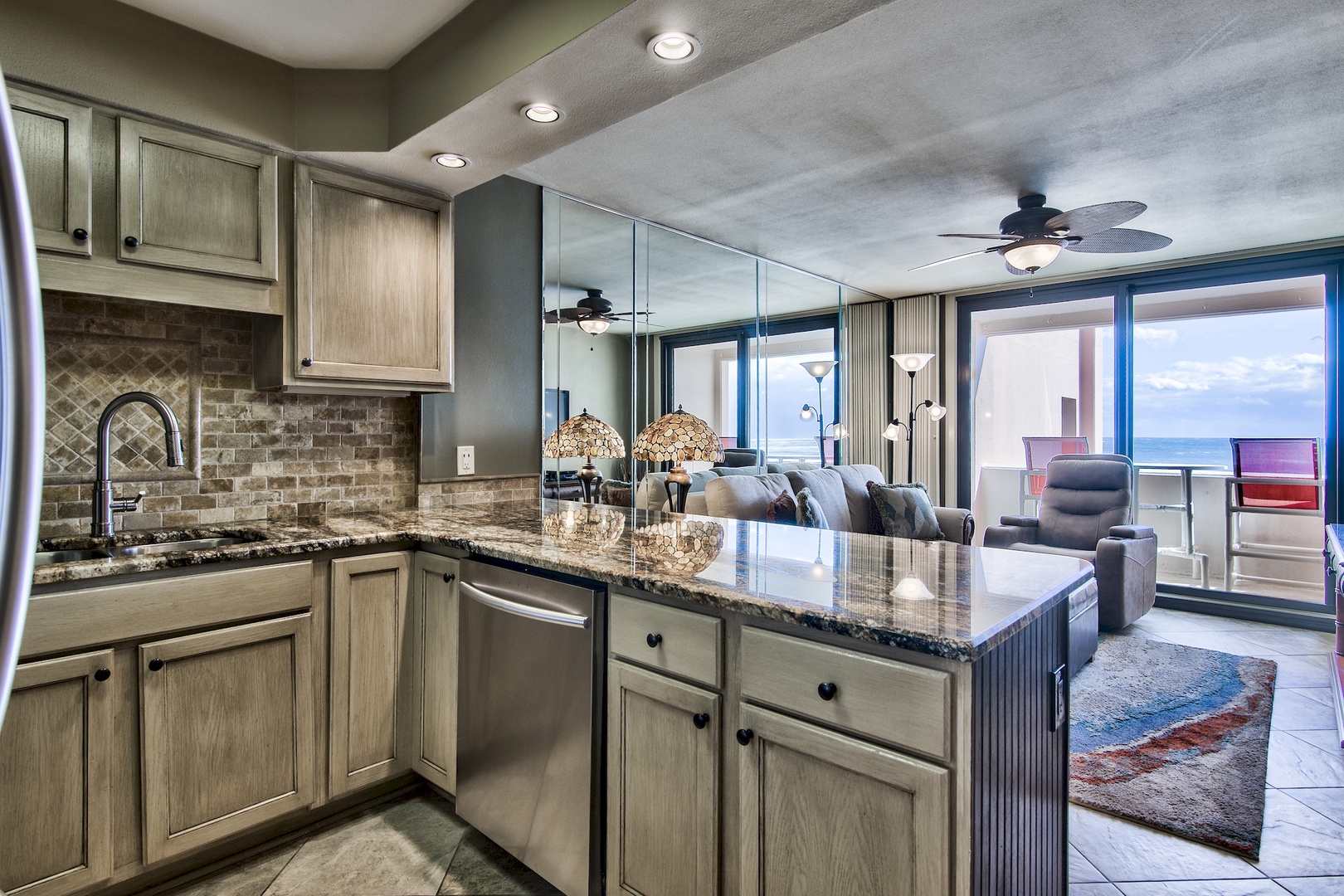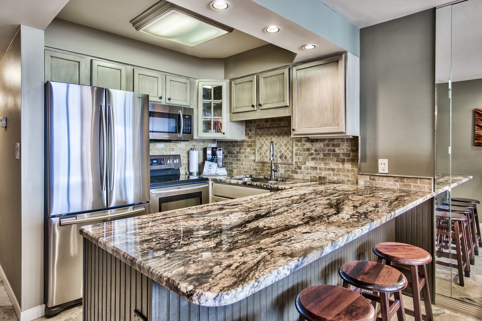 This beautiful customized unit has special one-of-a-kind added features and touches to make your stay comfortable and enjoyable. The floor plan provides an open, spacious feel and the flooring throughout is diagonally laid porcelain tile with granite countertops.