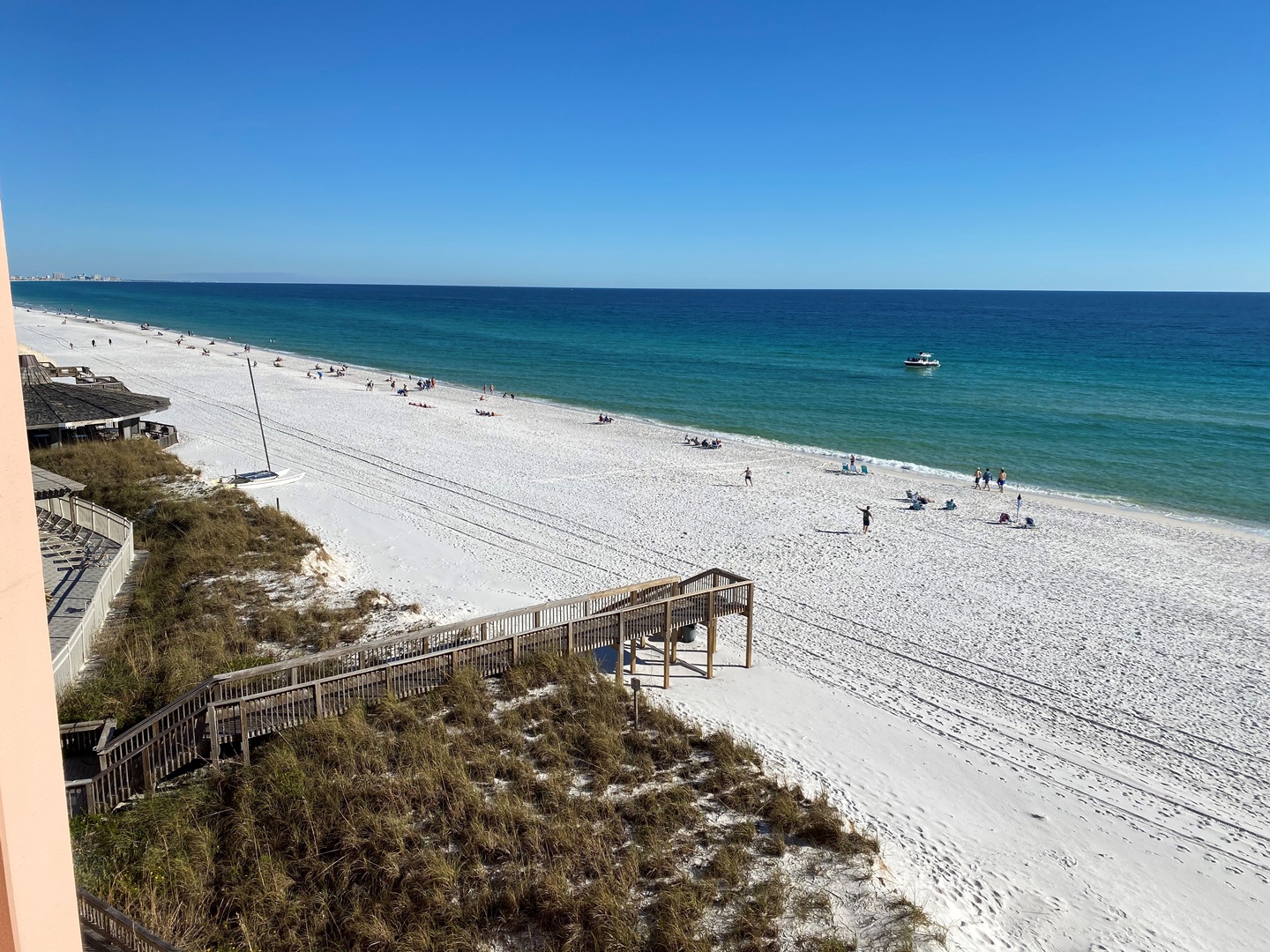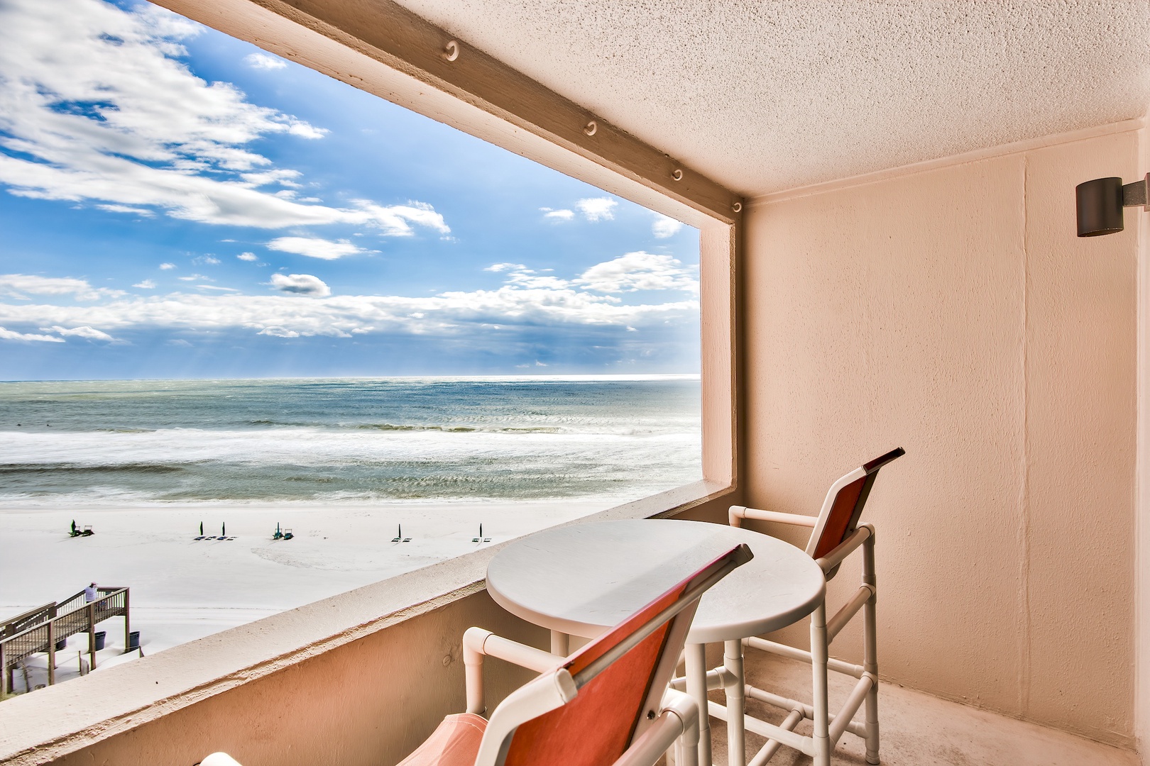 The balcony offers comfortable seating a tile floor; and a beautiful view of the Gulf, the walkover to the beach, and pool area.