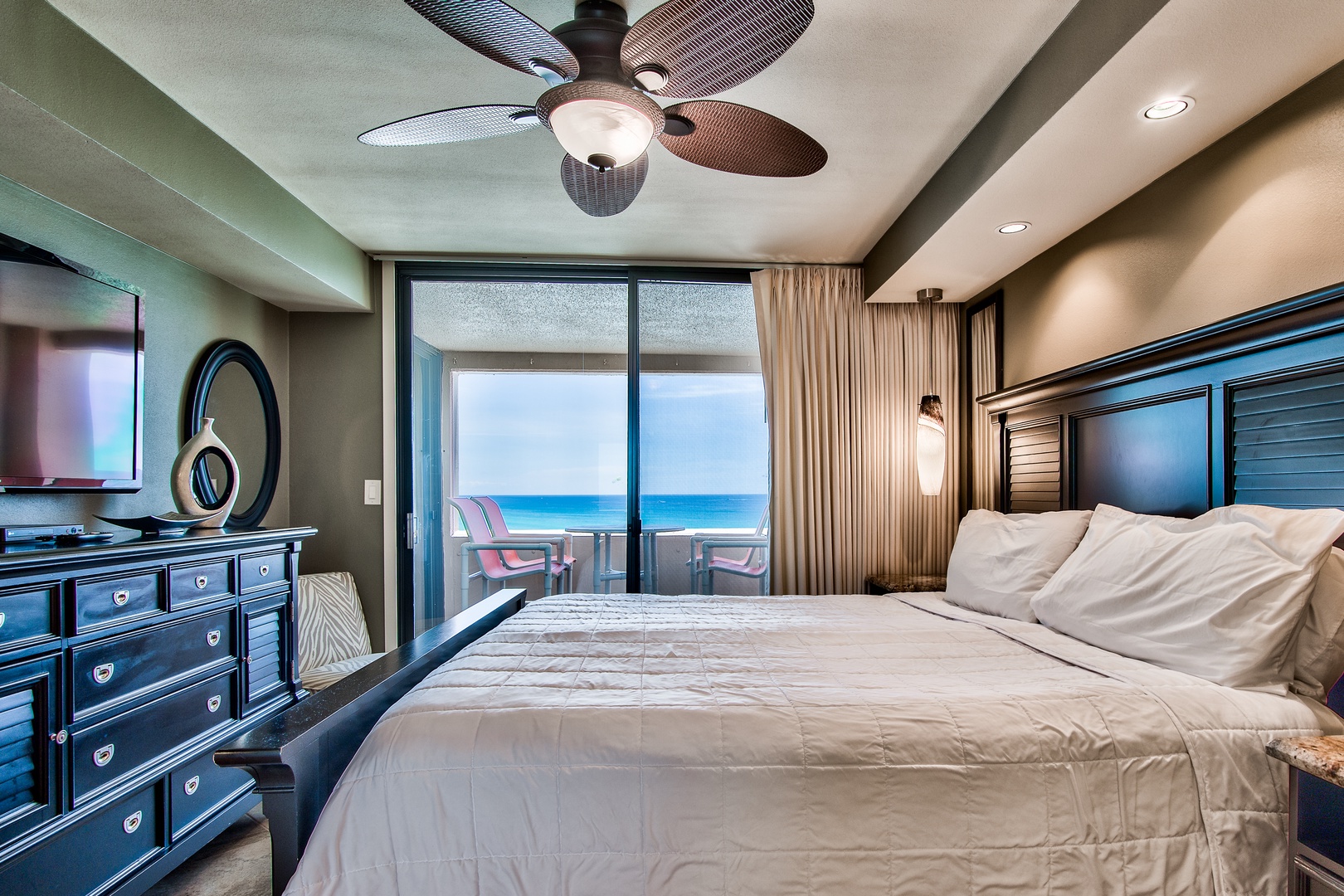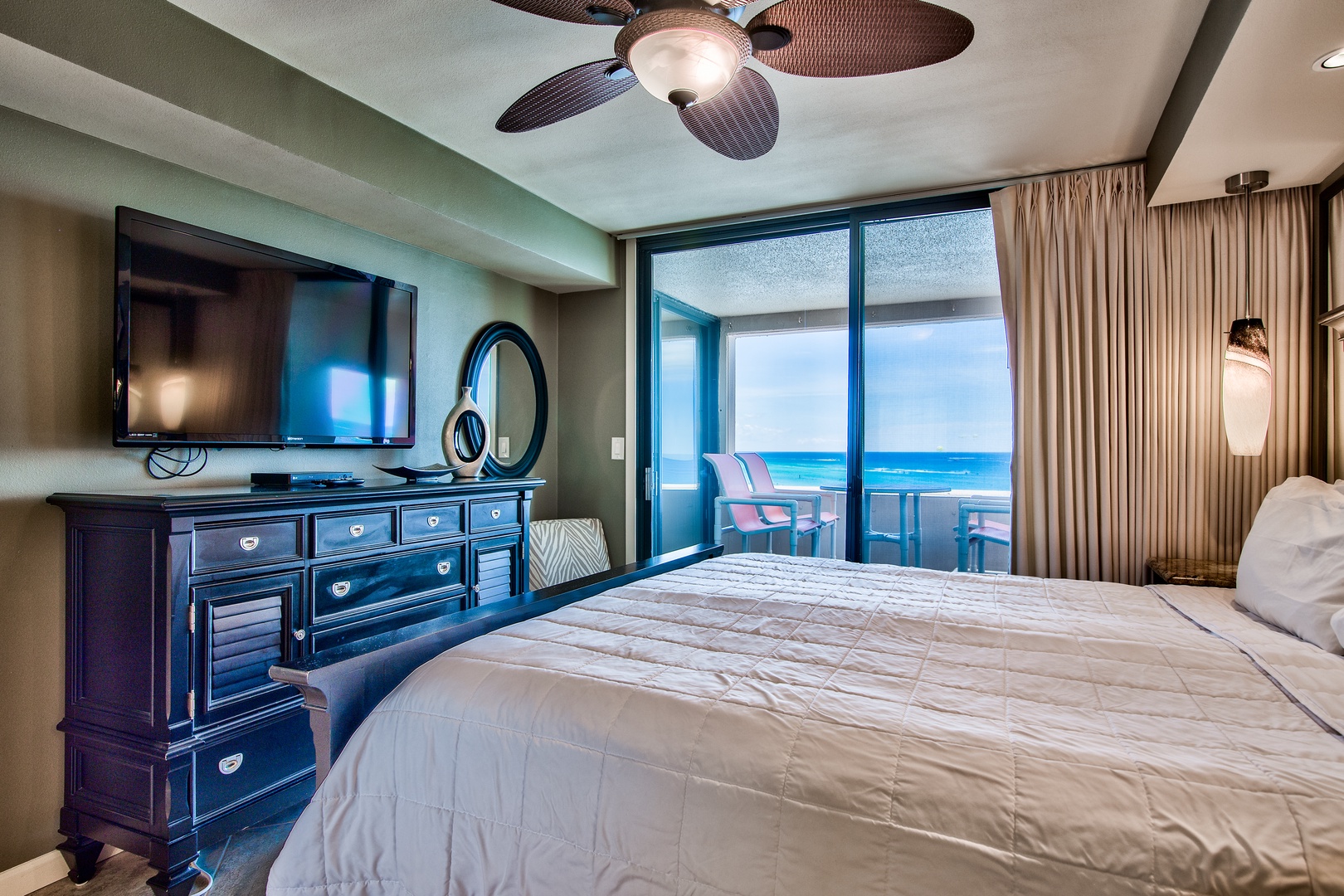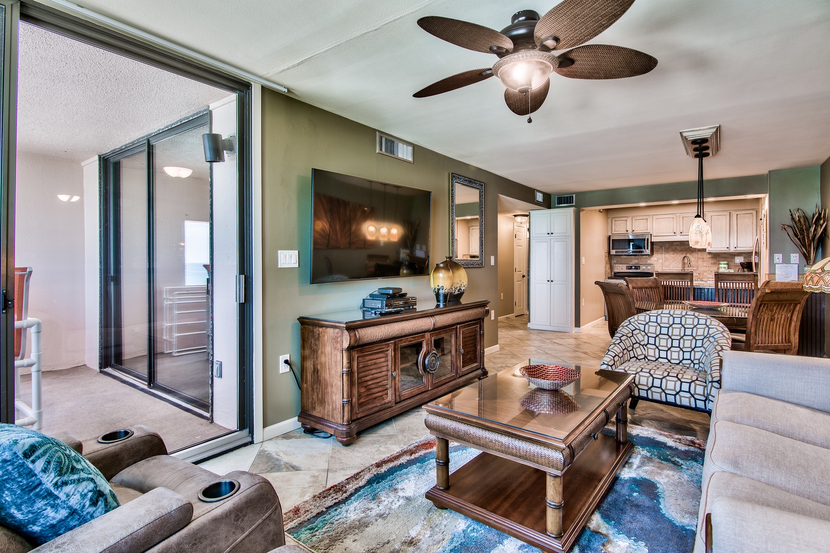This unit has a King-size bed in each bedroom and a Queen-size sleeper sofa in the living room. The living room is beautifully furnished and has a 65-inch LED Smart TV w/Blu Ray DVD player. Both bedrooms offer a retreat feel with comfortable king-size beds, custom lighting, 50-inch LED TVs w/BluRay DVD players and bedside outlets that include built-in USB charging receptacles. There are ceiling fans in both bedrooms and the living area.