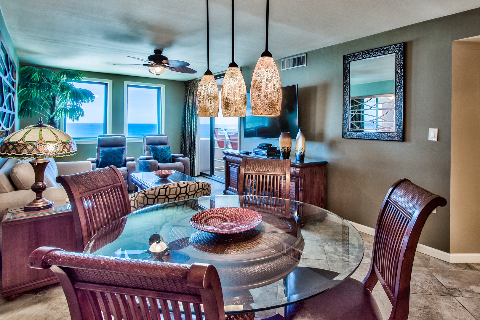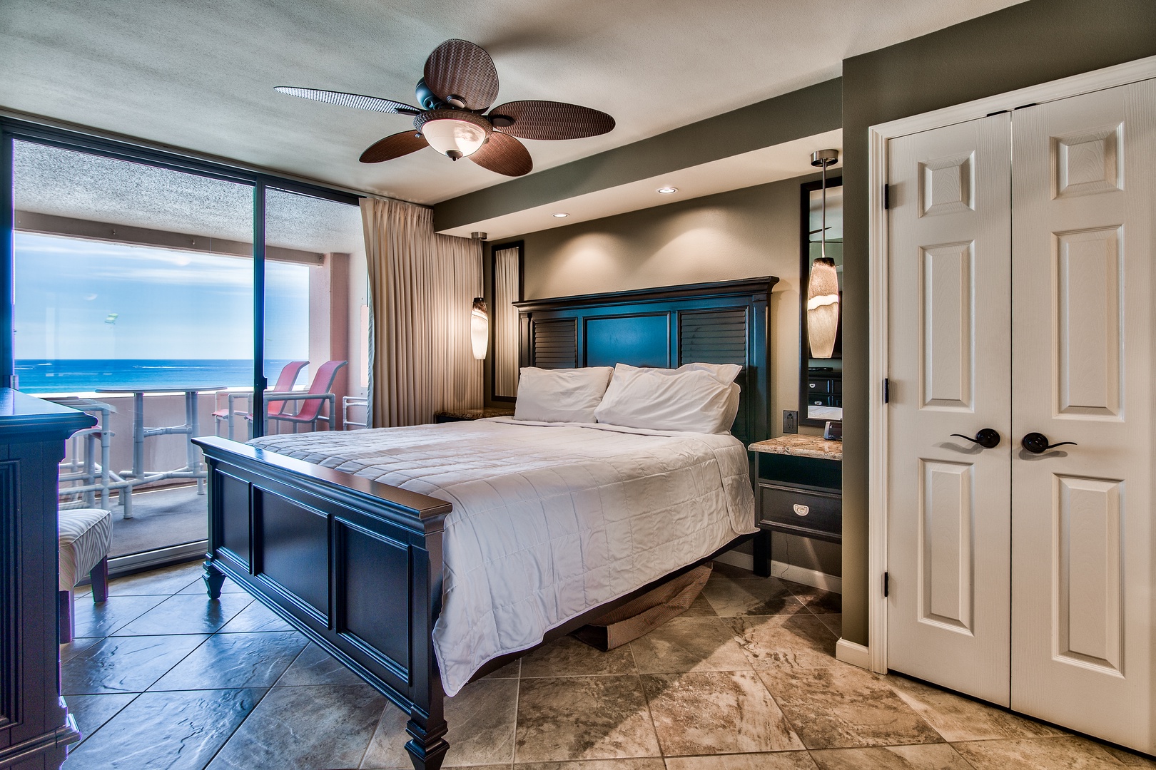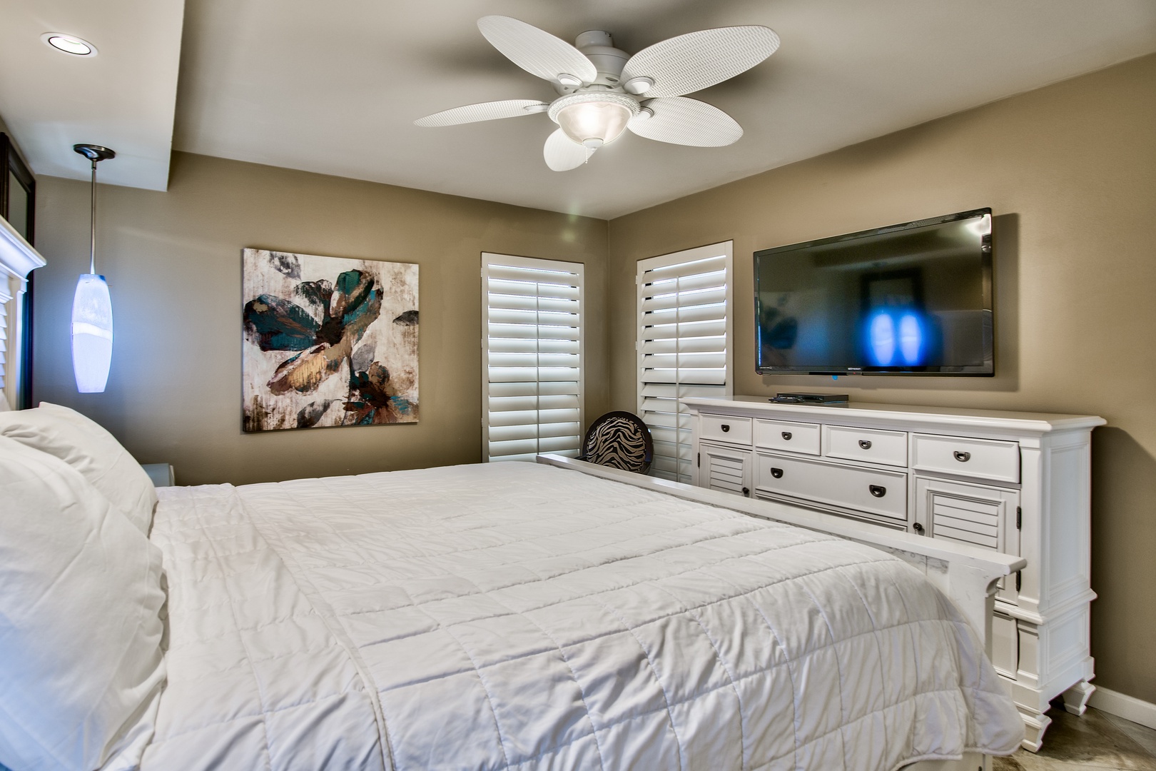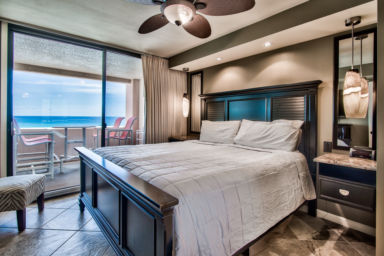 This unit has a King-size bed in each bedroom and a Queen-size sleeper sofa in the living room. The living room is beautifully furnished and has a 65-inch LED Smart TV w/Blu Ray DVD player. Both bedrooms offer a retreat feel with comfortable king-size beds, custom lighting, 50-inch LED TVs w/BluRay DVD players and bedside outlets that include built-in USB charging receptacles. There are ceiling fans in both bedrooms and the living area.