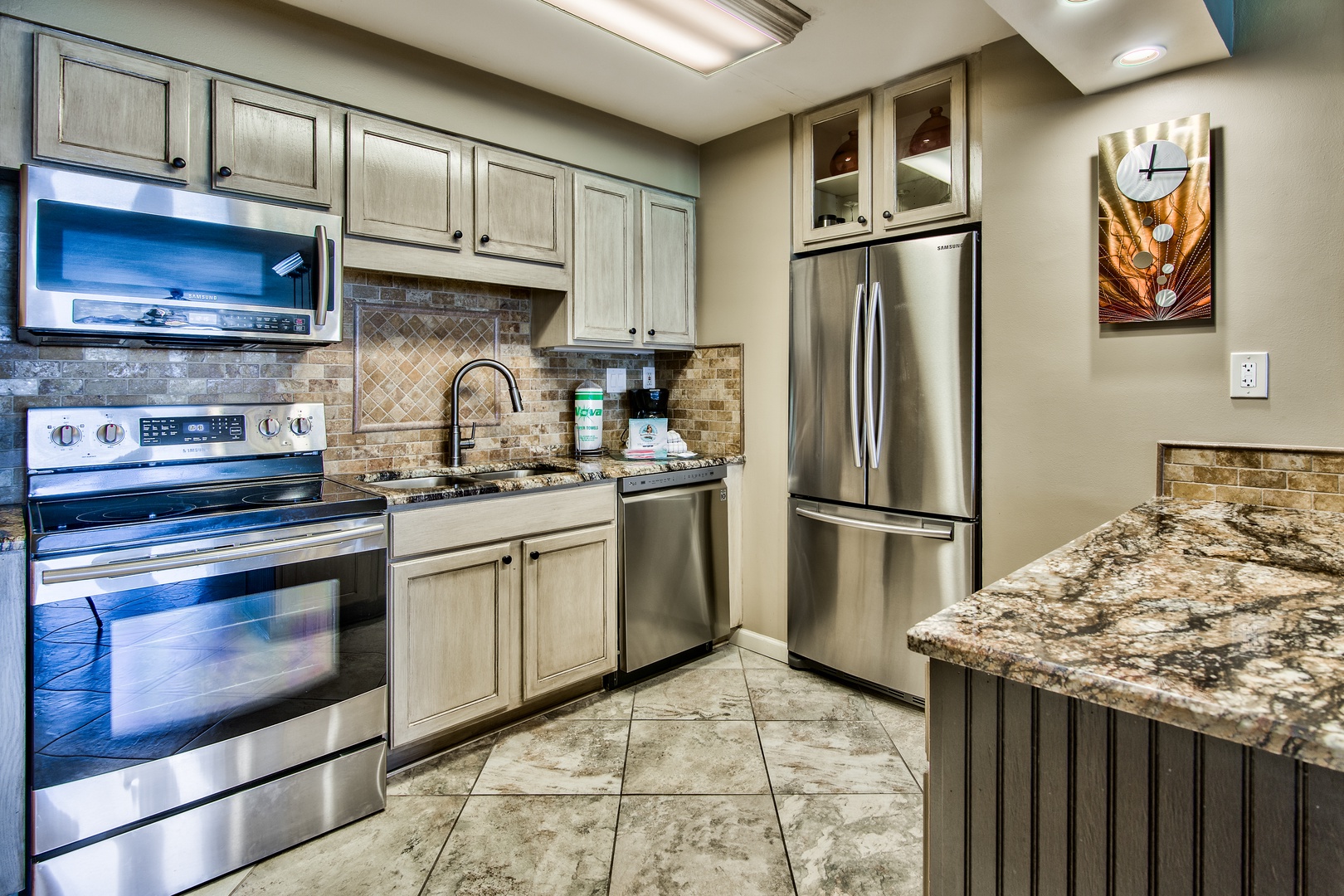The kitchen features an extended-length granite counter, custom backsplash, double sink, all new stainless steel appliances, full-size refrigerator with an ice maker, custom cabinets, built-in USB charging ports, and seating for 6 with island and table seating. The laundry area offers a new full-size high-efficiency washer and dryer.