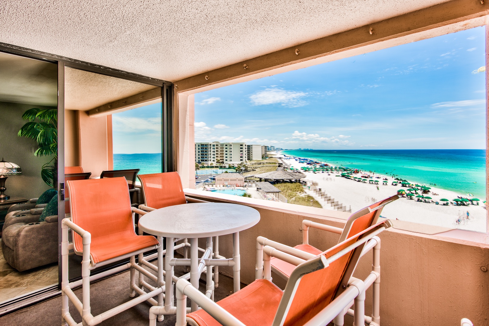 The balcony offers comfortable seating a tile floor; and a beautiful view of the Gulf, the walkover to the beach and pool area.