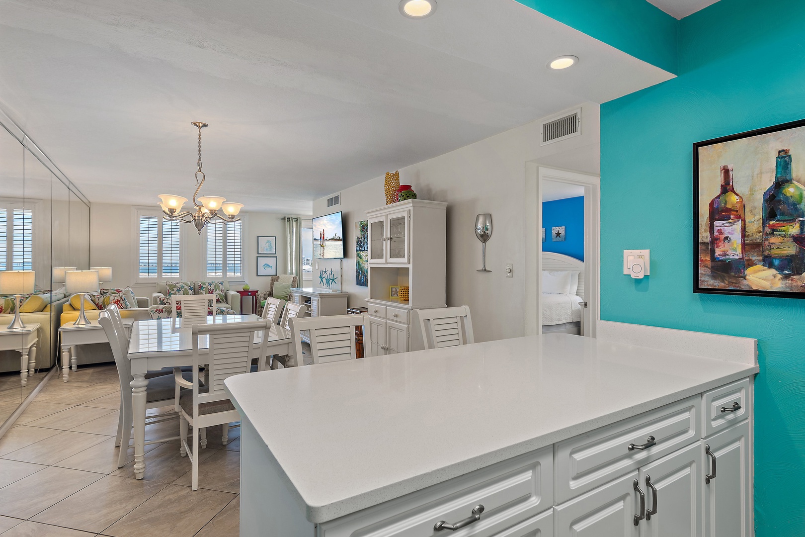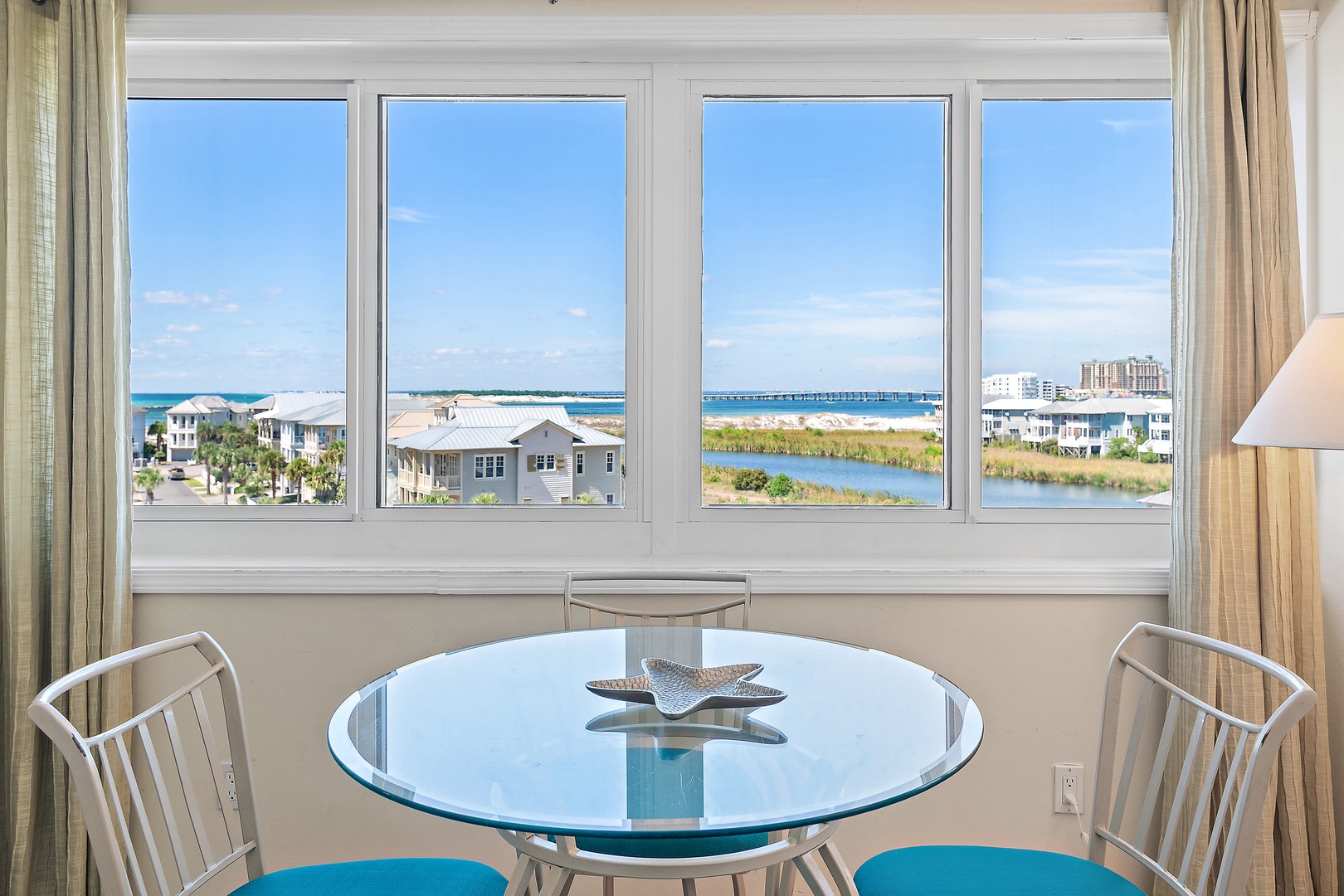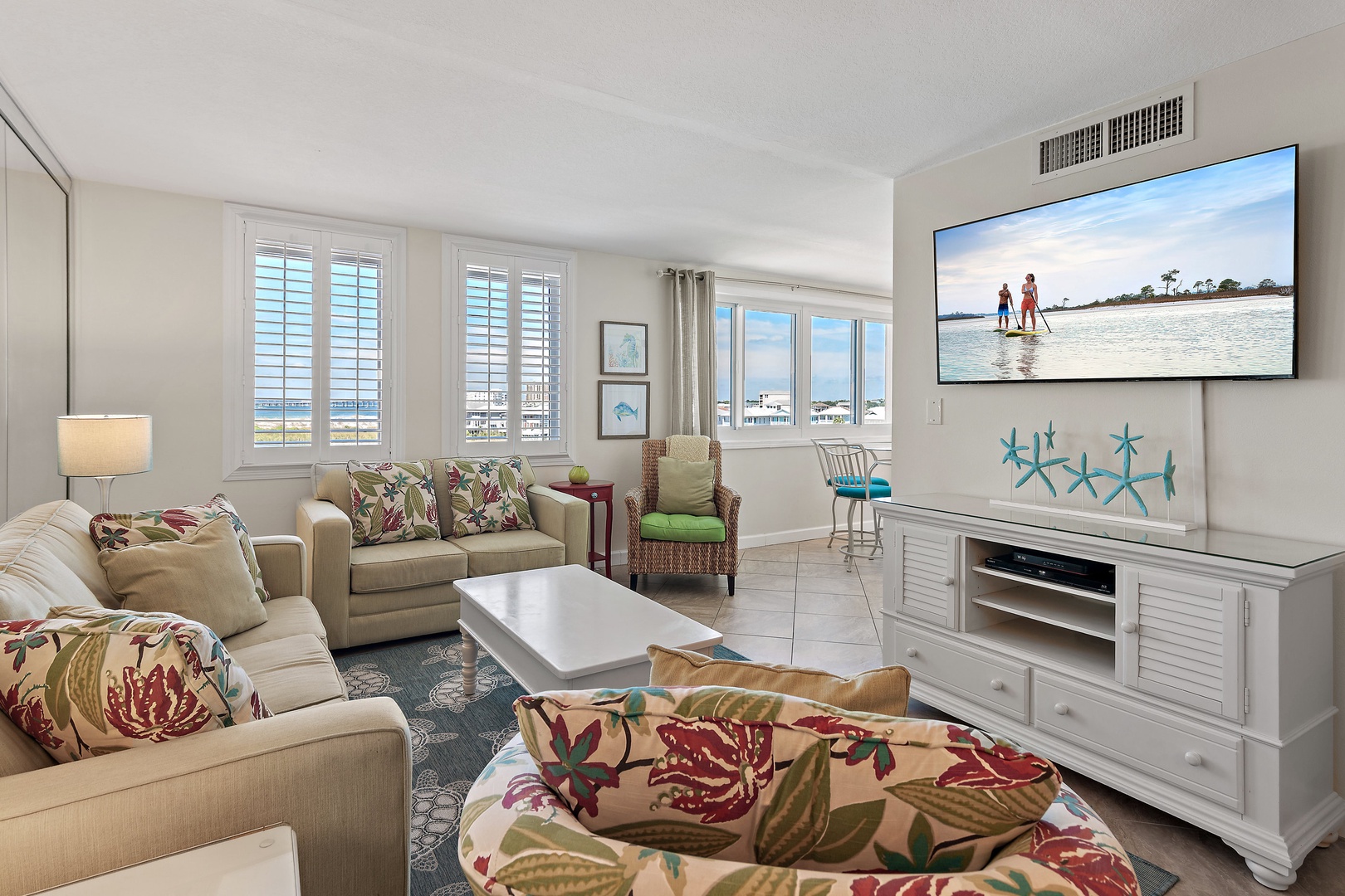 This bright, designer decorated unit offers amazing views of the Gulf, Jetties, East Pass and Destin Harbor. The living room has been expanded to include a sunroom, allowing more living space, including a counter height table and chairs to enjoy the outside views. The sunroom windows can easily be opened for seasonal enjoyment. The living area has a queen size sleeper sofa, an apartment size sofa and swivel chair to comfortably accommodate your needs as well as a 58” Flat screen TV with a DVD player.