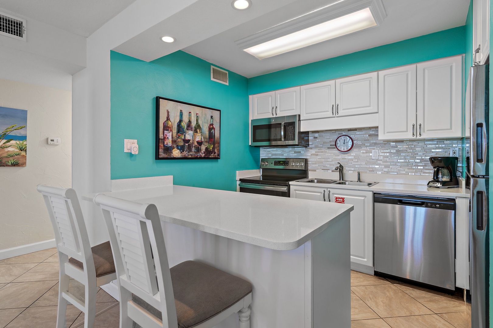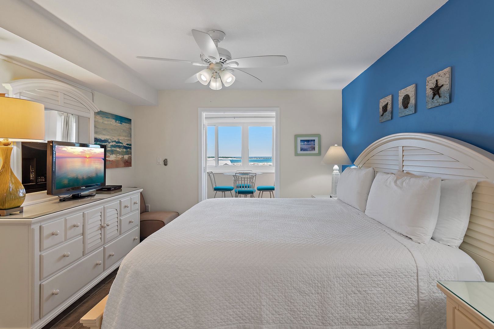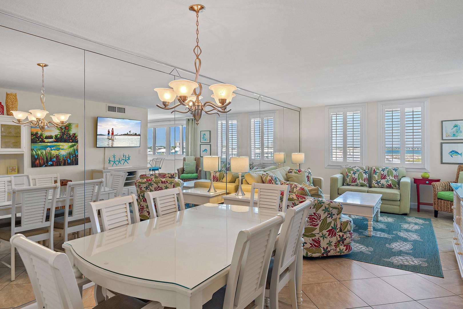 This bright, designer decorated unit offers amazing views of the Gulf, Jetties, East Pass and Destin Harbor. The living room has been expanded to include a sunroom, allowing more living space, including a counter height table and chairs to enjoy the outside views. The sunroom windows can easily be opened for seasonal enjoyment. The living area has a queen size sleeper sofa, an apartment size sofa and swivel chair to comfortably accommodate your needs as well as a 58” Flat screen TV with a DVD player.