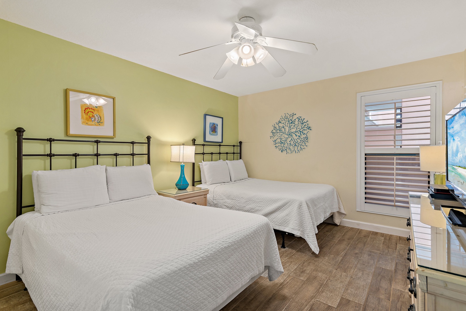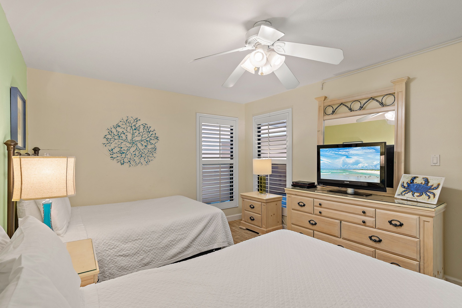 The master bedroom has a king size mattress and French doors that open into the sunroom, so you can enjoy your morning coffee or evening wine while looking at the boats coming in and out of the harbor. The guest atrium bedroom has two double beds. The guest bedroom has a ceiling fan, 26” Flat screen TV and Blu Ray player. The master bedroom has a ceiling fan, 36” Flat screen TV and DVD player. The master bathroom has a full tub/shower, and the guest bathroom as a walk-in shower.