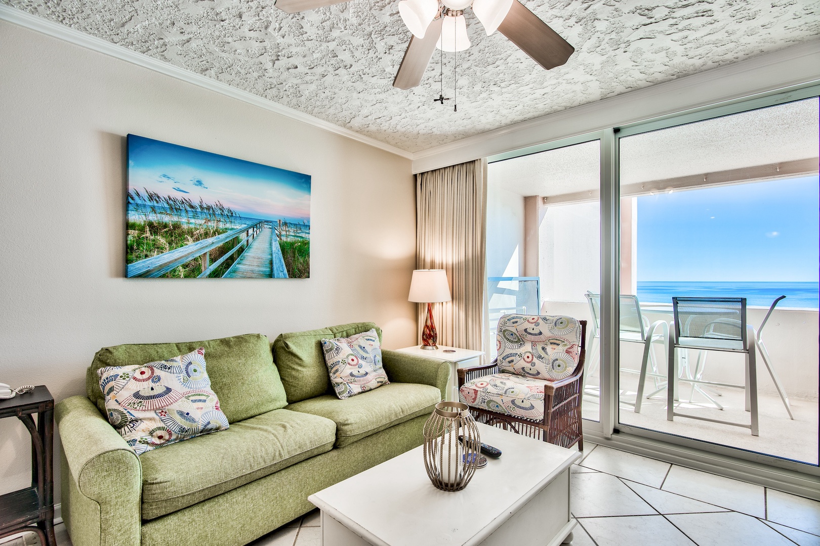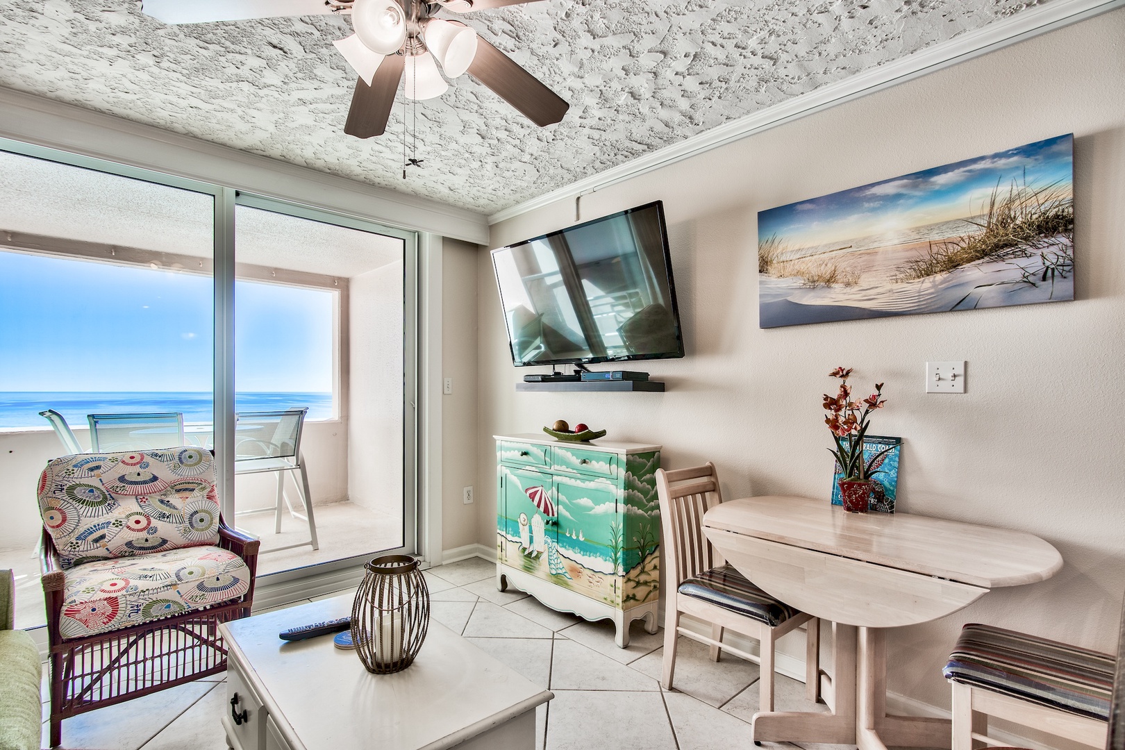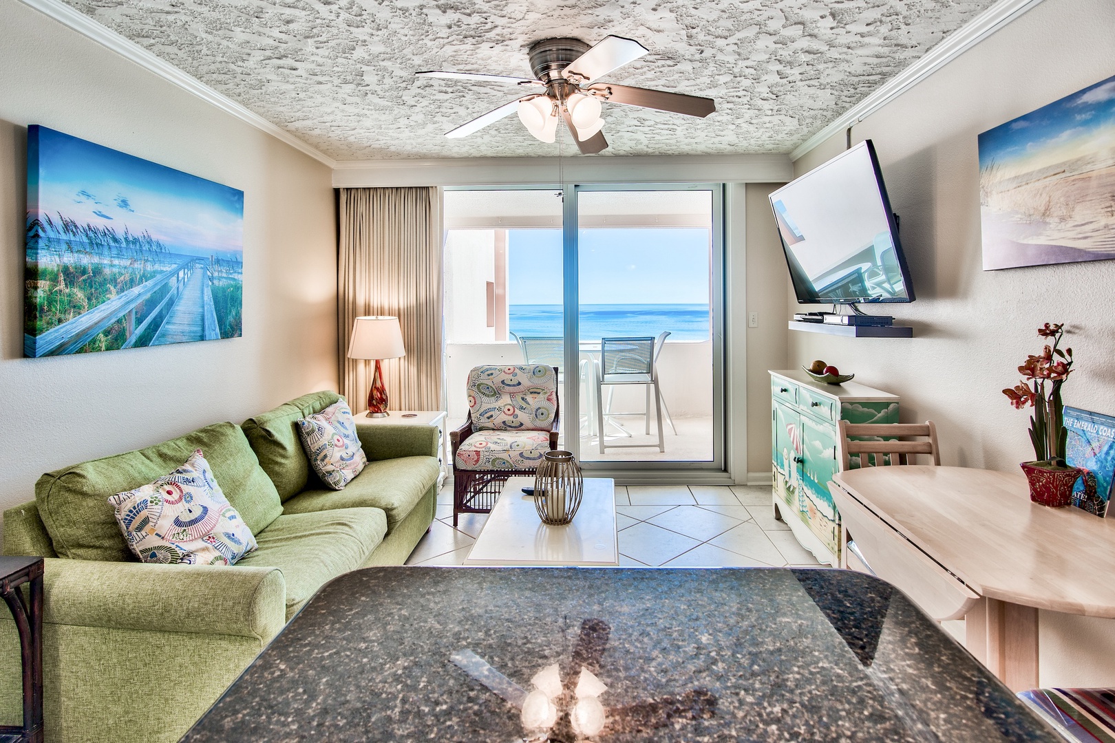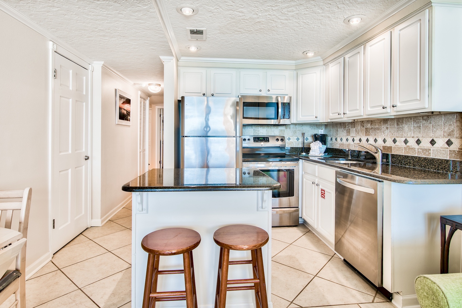 King Size Bed in Bedroom, Queen Size Sleeper Sofa in Living Area. You will love the view from the Open Balcony while sitting in the Bar Height Furniture. The Ceiling Fans in the Living Area and Bedroom will help keep you cool. Watch the LCD TV and DVD Player in the Living Area and the LCD TV in the Bedroom. The kitchen has all stainless steel appliances and granite counter tops.