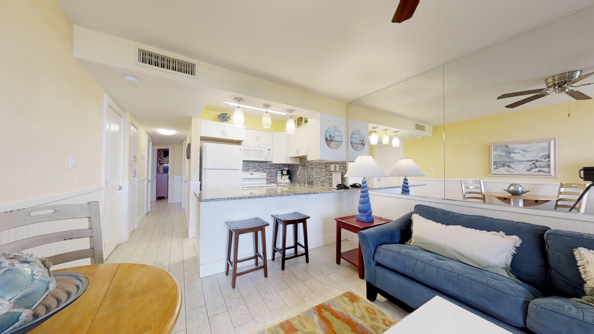 Two Double Beds in the Bedroom, Queen Size Sleeper Sofa in Living Area. Recently renovated with new granite countertops in the kitchen and bathroom, as well as light wood floors throughout the unit. The Mirrored Walls in the Living Area expand the space and the Glass Doors go out onto the Open Balcony. Sit in the Bar Height Furniture on the Balcony and enjoy the view. The Breakfast Bar in the Kitchen is accented with Recessed Lighting. Watch the 40 inch HD/LCD TV and DVD Player in the Living Area. The Ceiling Fan in the Bedroom will keep you cool while you watch TV.