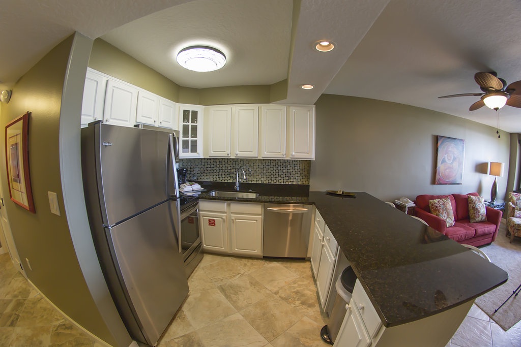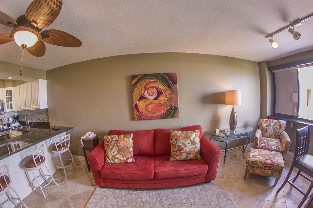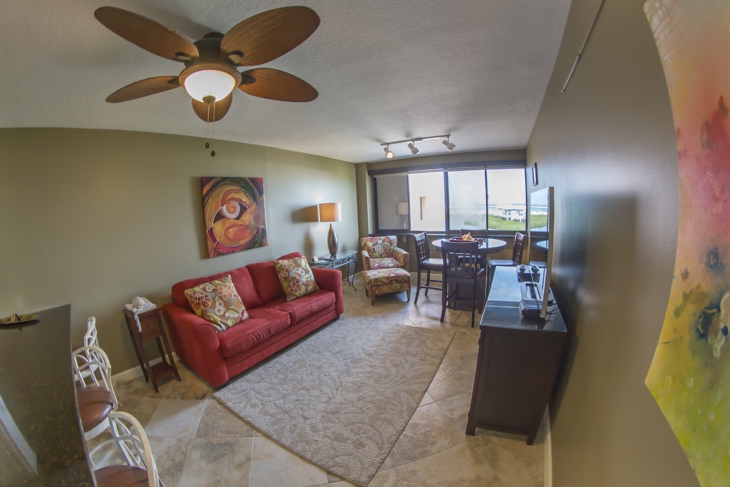 Gorgeous, One Bedroom, One Bathroom, Enclosed balcony, fourth floor unit boasts beautiful artwork, a reconfigured kitchen with stainless steel appliances and more space to cook, entertain and store your groceries. Beautiful black granite counter top is large enough for four seated guests to watch as you prep tonight's fantastic dinner. Diagonally laid tile throughout the entire unit. The back wall is lined with windows which open and a black granite bar ledge where you can enjoy some of the most spectacular sunsets. You can also enjoy fantastic views of the East Pass, Bay, and Lake Christina from the hallway, kitchen, living room or especially the pub height table right at the windows' edge. You can even enjoy the twinkle of the nighttime views late at night through the incredible roll down shades that you can see right through. Don't worry though, if you want complete privacy and total darkness for that guest on the pull out sofa, just roll down the second black out shade and enjoy a great night's sleep. The bedroom features a king size bed and beautiful plantation shutters.