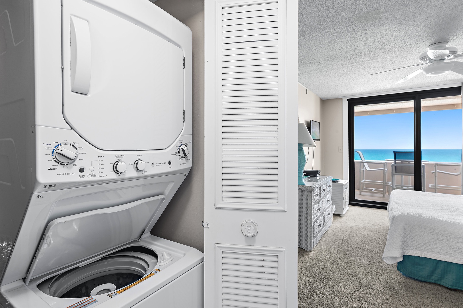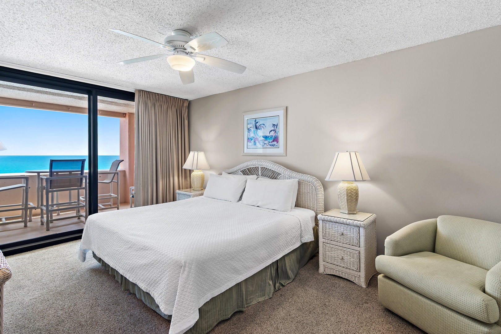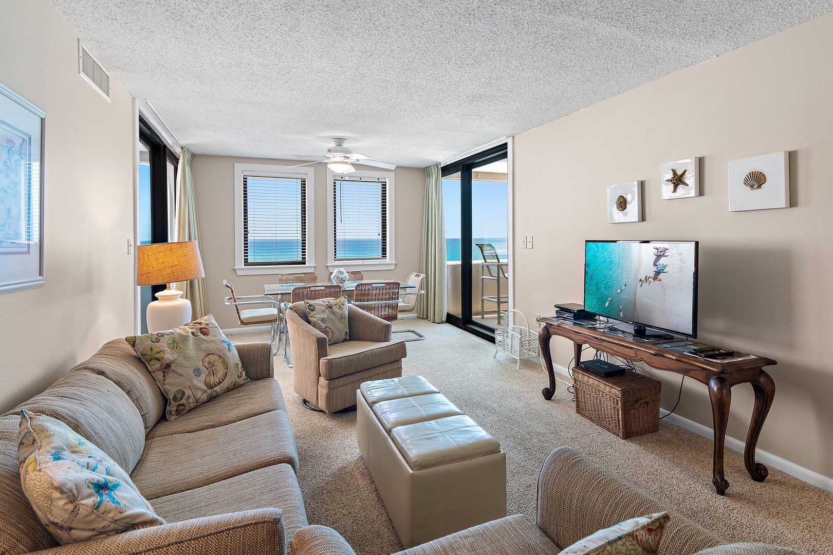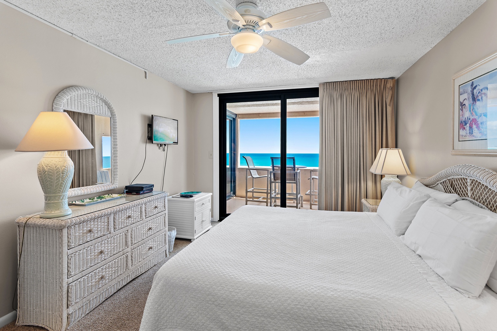 King Size Bed in Master, 2 Queen Size Beds in Bedroom Two, Queen Size Bed in Bedroom Three, Sofa Sleeper in Living Area. The Fabulous Beach and Gulf View make this a Deluxe Unit. Enjoy these views from the three Open Balconies. Stay cool under the Ceiling Fans in the Dining Area and Den. It is equipped with TVs in the Bedrooms, Living Room, and Dining Room and a DVD Player