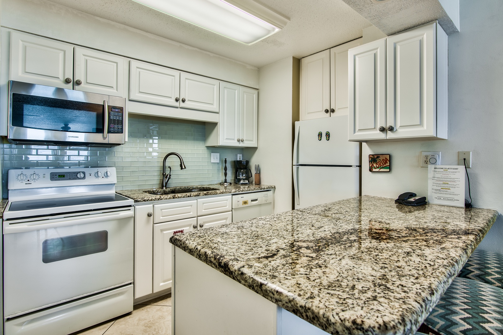 Enjoy one of the best beautiful Gulf Sunrises- water sparkles like diamonds. Walk to the Jetty or watch the family at the pool from your balcony. Open Floor Plan- 2 Bedroom, 2 Bathrooms. Enjoy art from local artists. Kitchen- White subway tile, granite countertops with bar stools. Led 55” Smart TV in the living room with DVD player. Master bedroom- King size bed. Master bathroom has a lovely new walk in shower with glass doors and spa floor stone granite counter top. 2nd bedroom- two double beds with TV. Hall bath- Double vanity, pocket door for privacy, and tub with shower. Balcony has bar height furniture and the view from this unit is one of the best at Jetty East.