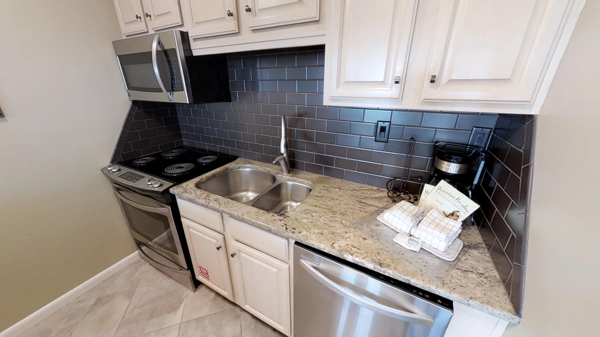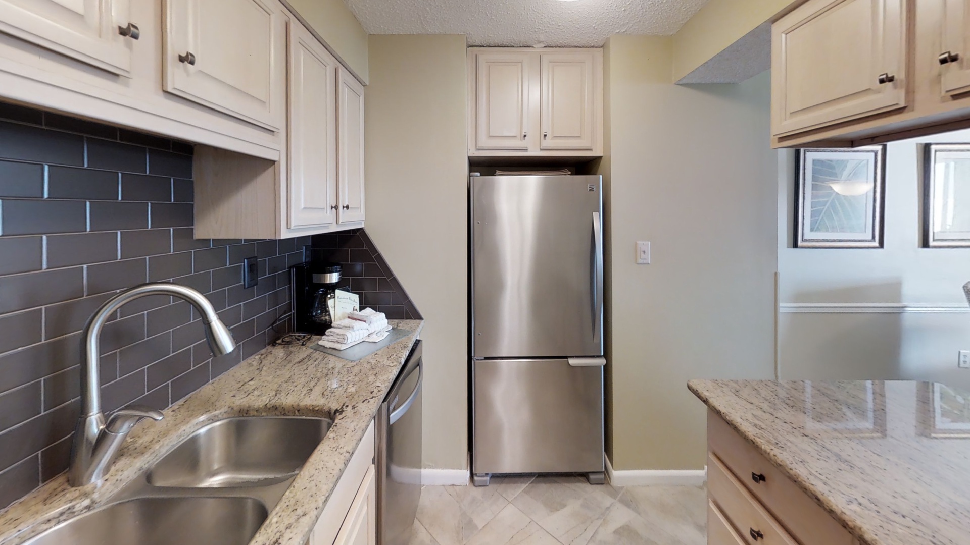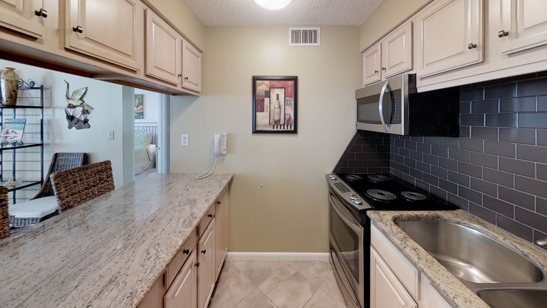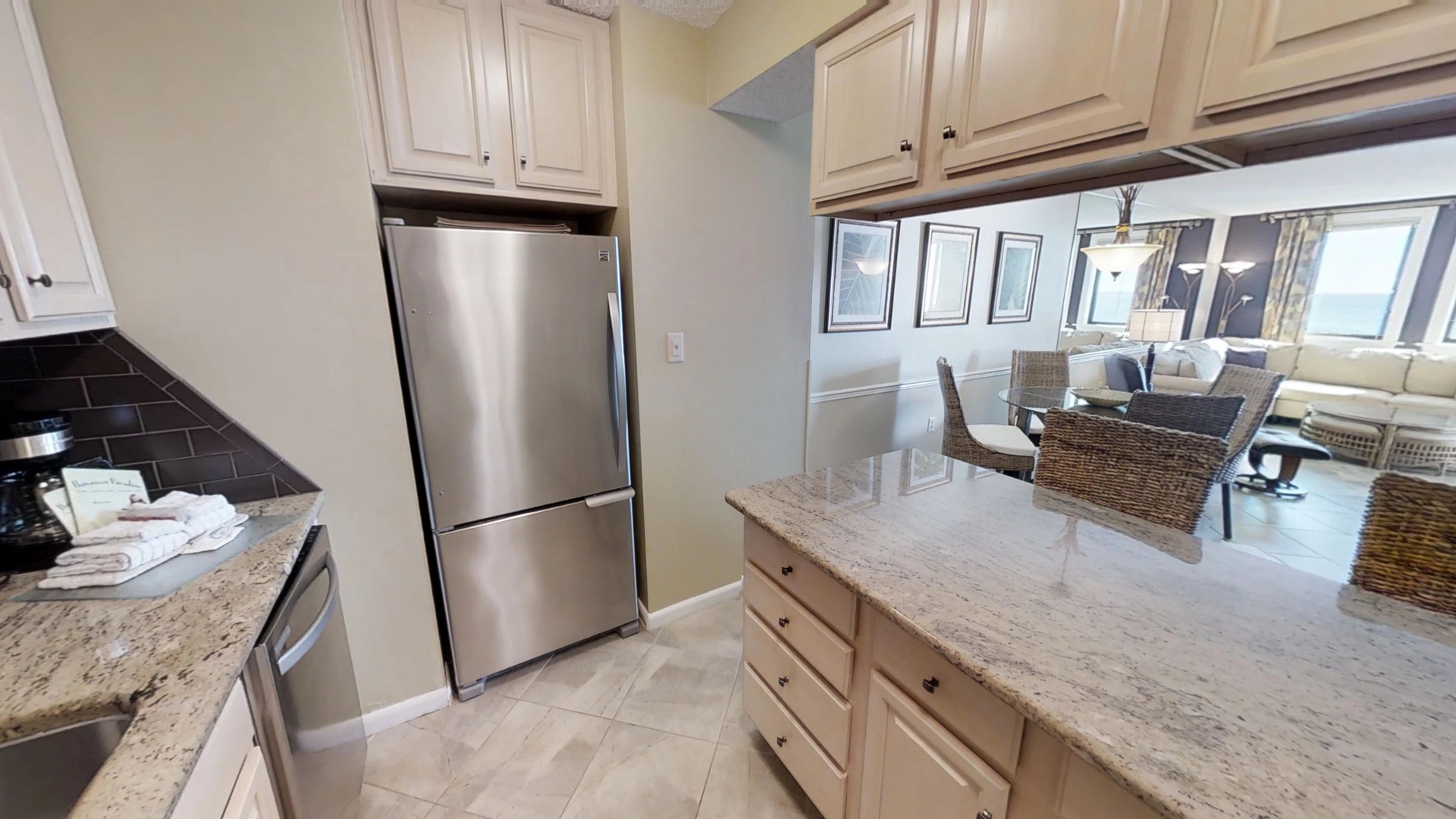 King size bed in master, queen size bed and twin bed in secondary bedroom, sofa bed in living area. You will love the view of the gulf, beach and amenities from the open balcony with counter high furniture. Beautiful granite counters tops accented by dark brown subway tile backsplash, bright lighting in the kitchen and stainless steel appliances.