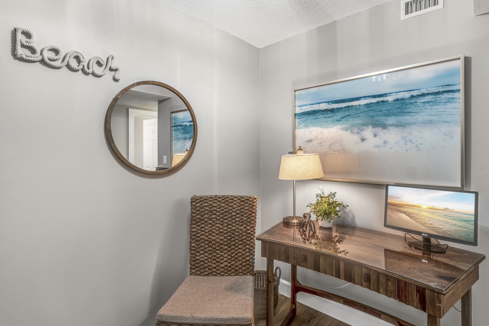 For those working remotely, the entryway includes a dedicated desk space. Stay connected with free Wi-Fi, cable TV, and conveniently placed USB outlets. The unit also includes an in-unit washer/dryer, iron & board, and hairdryers for added convenience.