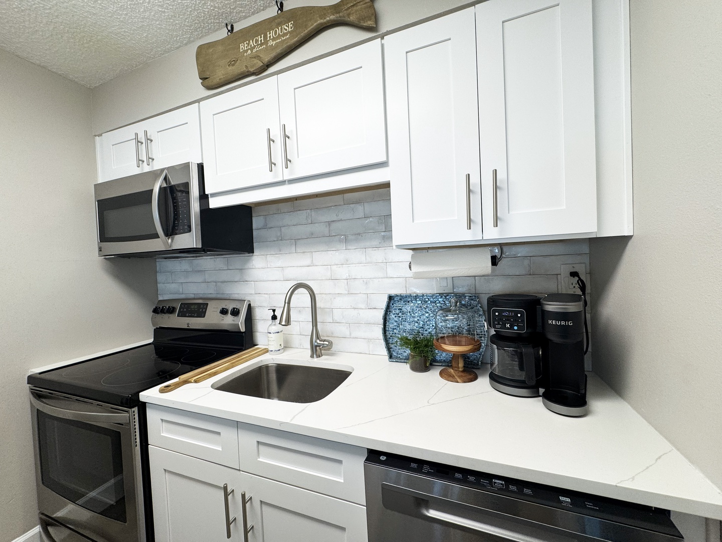 Inside, enjoy your morning coffee from the Keurig or drip coffee maker on gorgeous new quartz countertops. Every detail has been carefully upgraded, including brand-new floors, stylish designer touches, updated bathrooms, and two king-size beds for ultimate comfort. The unit sleeps four comfortably, with a pull-out couch available for extra guests.