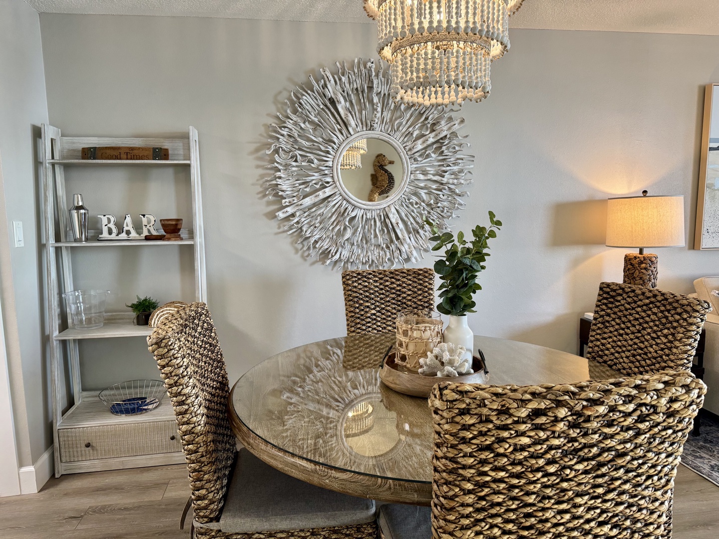 Unwind in the living area with a 60" Smart TV and Roku streaming, or relax in the swivel chairs that let you take in the ocean views. The round dining table seats six, and the fully equipped kitchen features new cabinetry, a bar area with two stools, Green Pan cookware, a blender, an Instant Pot, and more.
