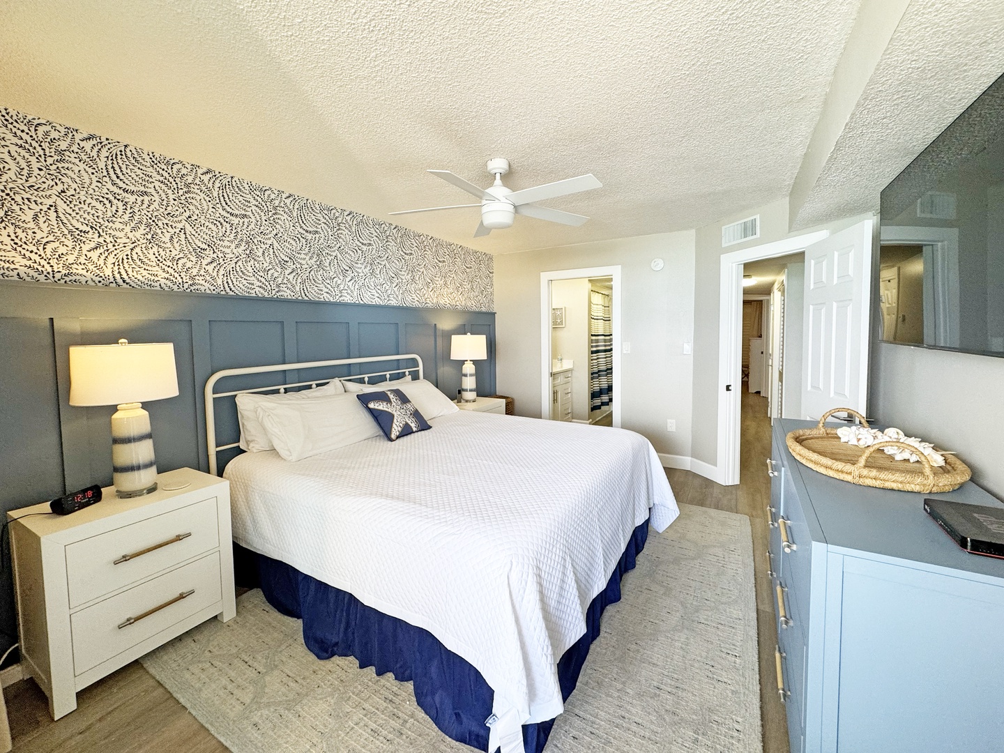Primary Suite: King Sleep Number bed (2023), ceiling fan, 42" TV, and ensuite bath with shower/tub combo. Guest Bedroom: King bed (2023), ceiling fan, 32" TV, and adjacent bathroom with walk-in shower.