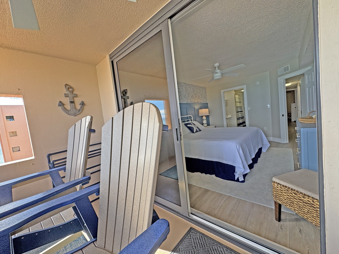 Step onto your private balcony with nautical touches and peek through sliding doors into your cozy bedroom retreat.