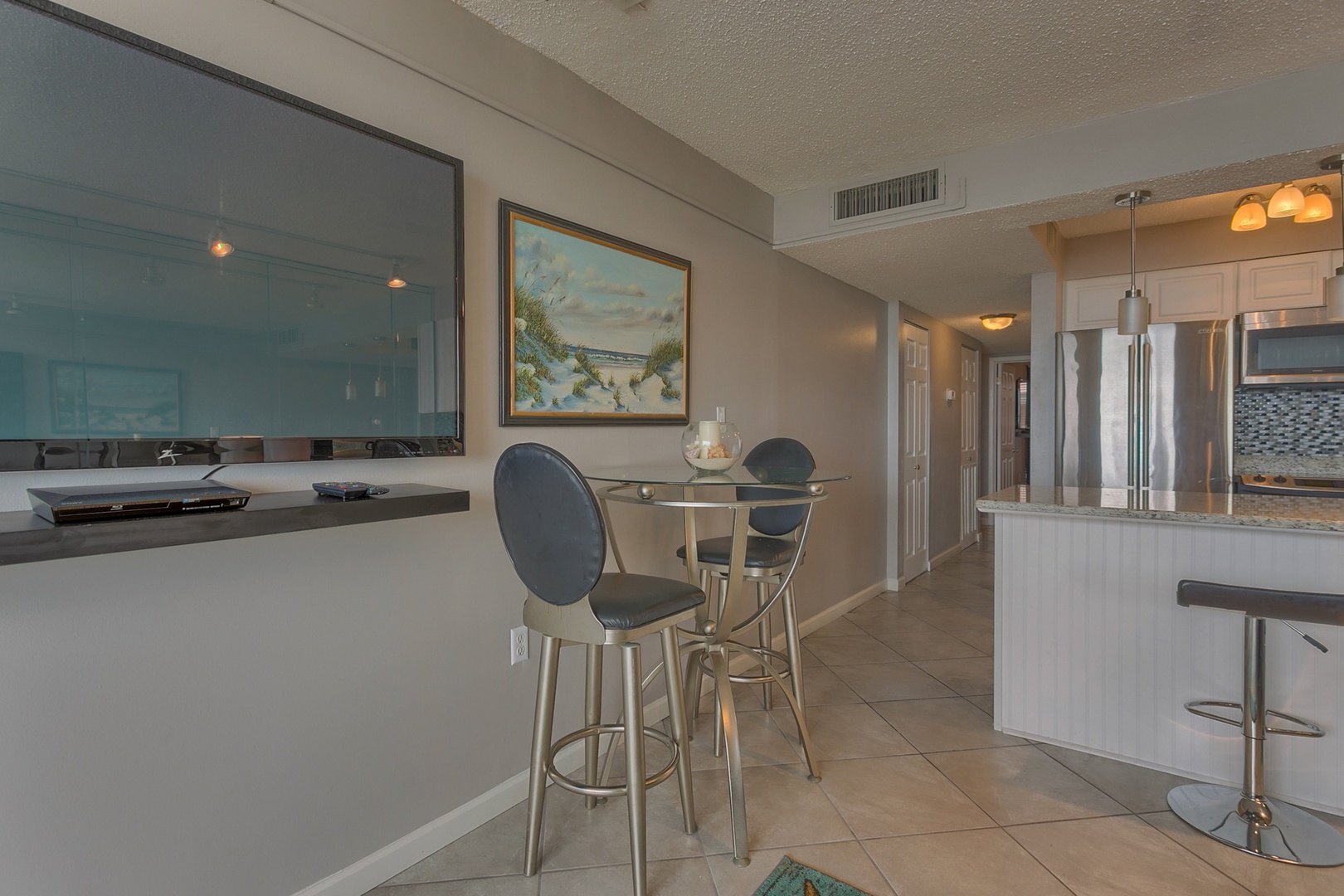 King Size Bed in Bedroom, Sleeper Sofa in Living Area. The Glass Doors in the Living Area go out to the Open Balcony and the Mirrored Wall expands the space. Sit on the Bar Height Furniture on the Open Balcony where you can relax all day and enjoy both Gulf and Jetty Views. Master Bedroom has a 50" TV and DVD player. The Living Room is equipped with a 60 inch TV, DVD player and Bluetooth Stand. Granite Counter Tops in the Bathroom and Kitchen.